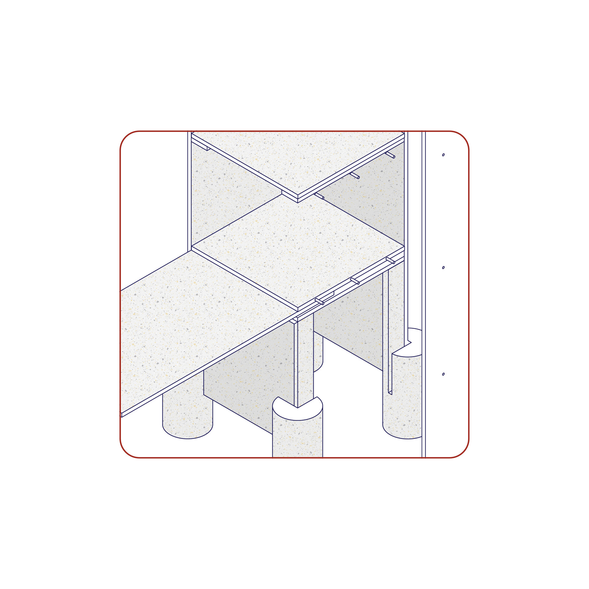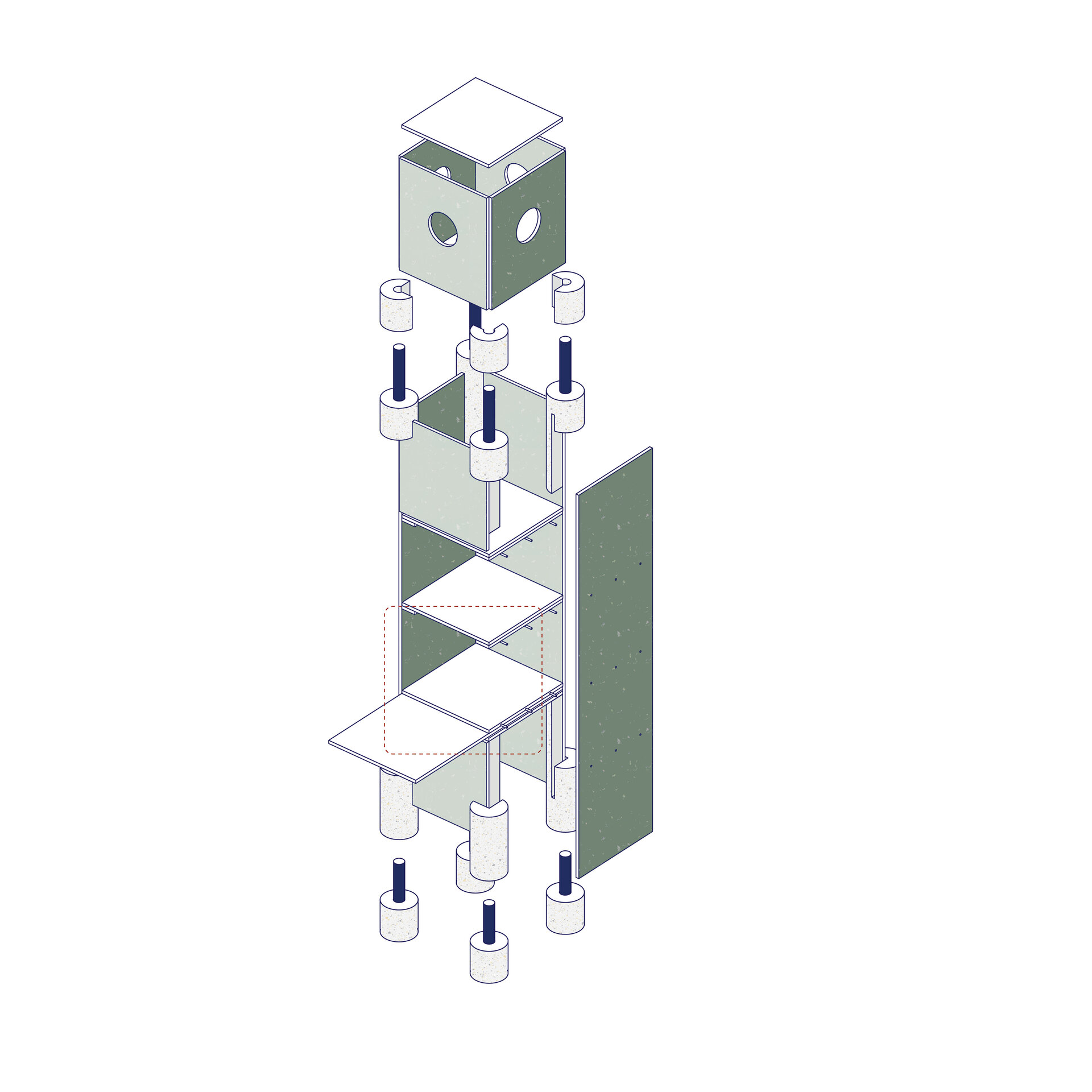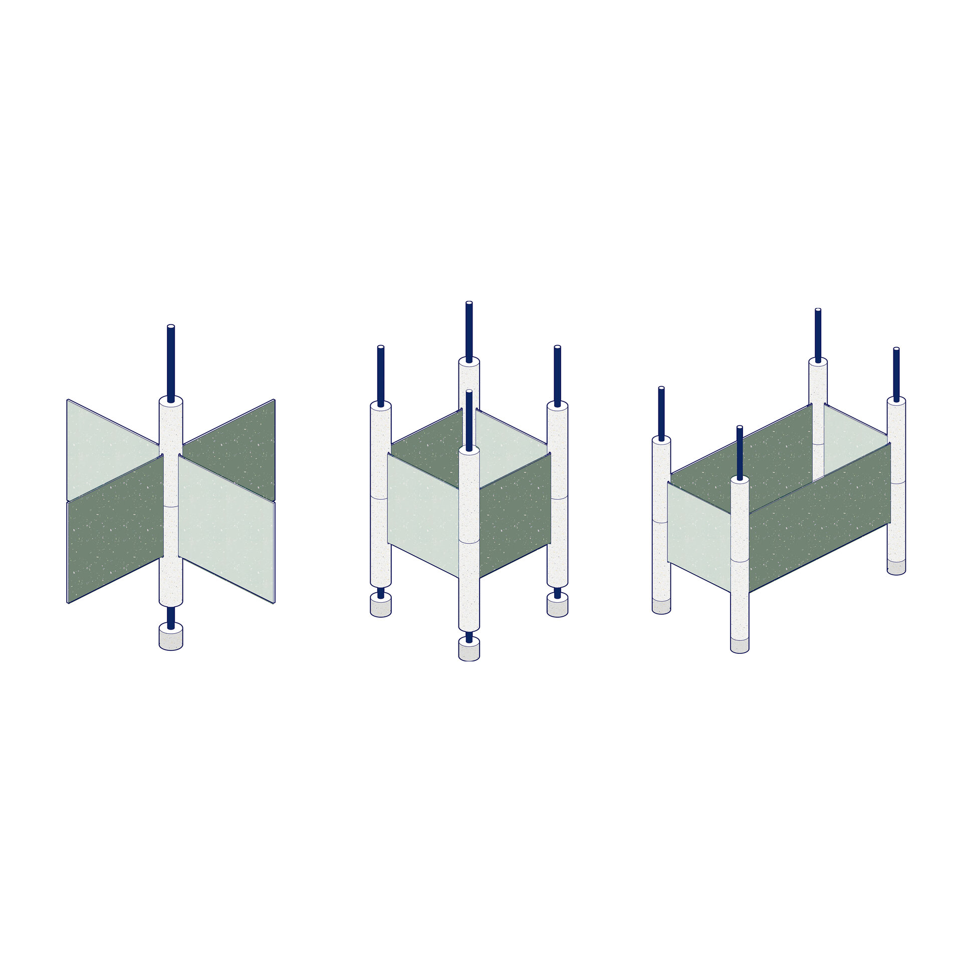 Structura este gândită pentru integrare armonioasă în spații naturale sau urbane, interior sau exterior. Sistemul de construcție interconectat permite asamblarea rapidă, fără unelte speciale sau materiale adiționale. Fiecare element este multifuncțional, standardizat și prevăzut cu perforații și puncte de prindere care permit multiple configurări: de la mobilier urban, la scene temporare sau expoziții interactive. Această flexibilitate permite reconfigurarea, relocarea sau reinterpretarea spațiului în funcție de context, transformând Polyvert într-un instrument educațional și social adaptabil. Prin modularitate, pavilionul optimizează spațiul și funcționalitatea și devine un exemplu de arhitectură sustenabilă, capabilă să răspundă nevoilor în continuă schimbare ale spațiilor publice.