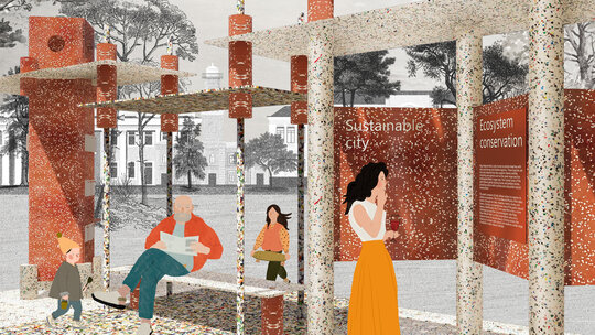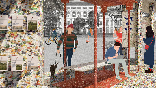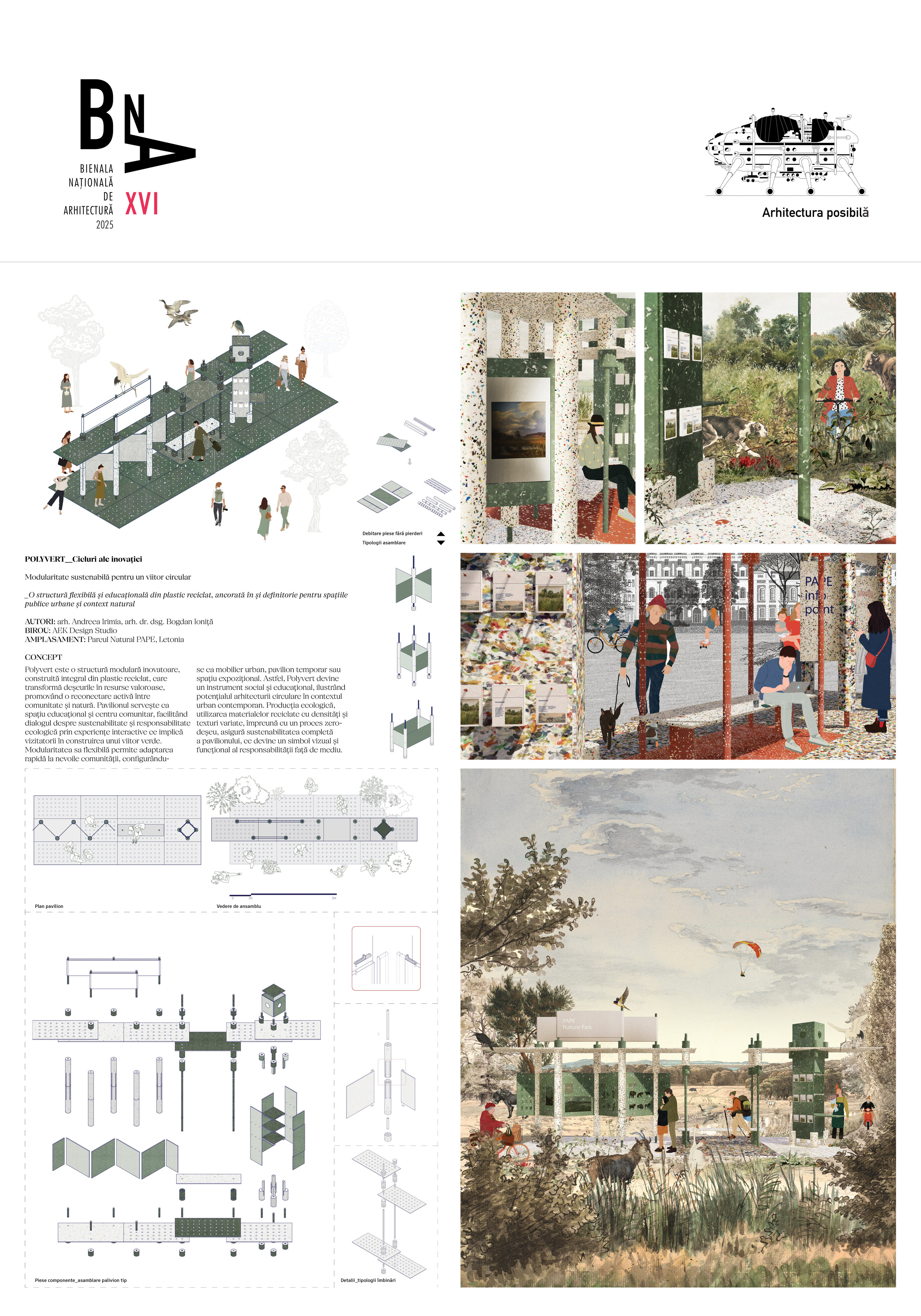 Ideea de transformare continuă și inovație este exprimată chiar prin numele pavilionului, Polyvert, o structură modulară, realizată integral din plastic reciclat, ce transformă deșeurile în resurse valoroase. Propune o reconectare a comunității cu natura și promovează reciclarea ca soluție urbană sustenabilă. Pavilionul funcționează ca spațiu educațional și centru comunitar, facilitând dialogul despre sustenabilitate și responsabilitate ecologică. Experiențele interactive oferite încurajează implicarea activă a vizitatorilor în construirea unui viitor verde. Flexibilitatea modulară permite adaptarea formei în funcție de nevoile comunității, demonstrând potențialul construcției circulare în peisajul urban contemporan.