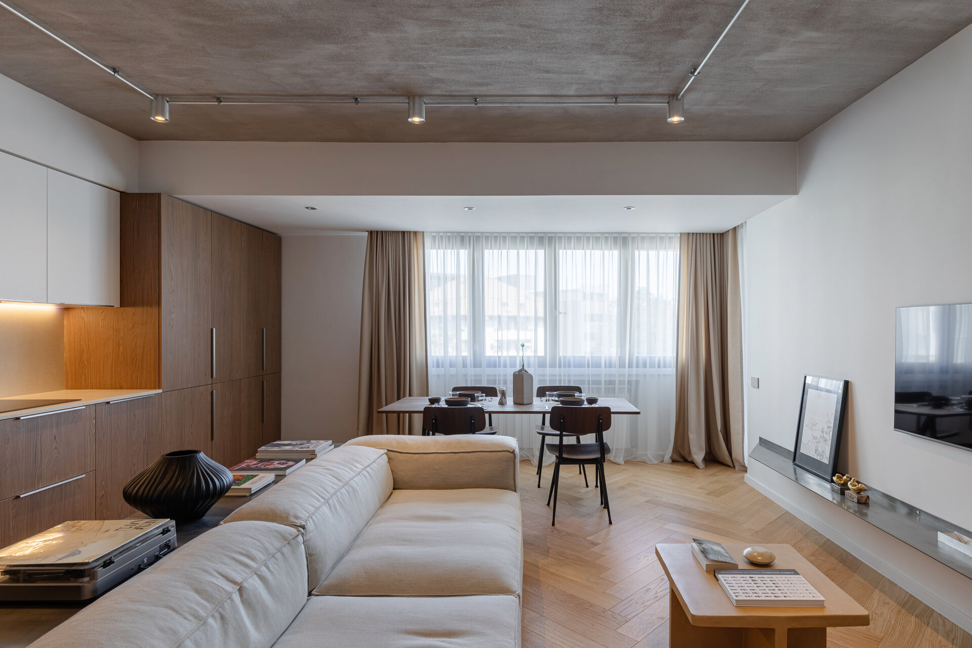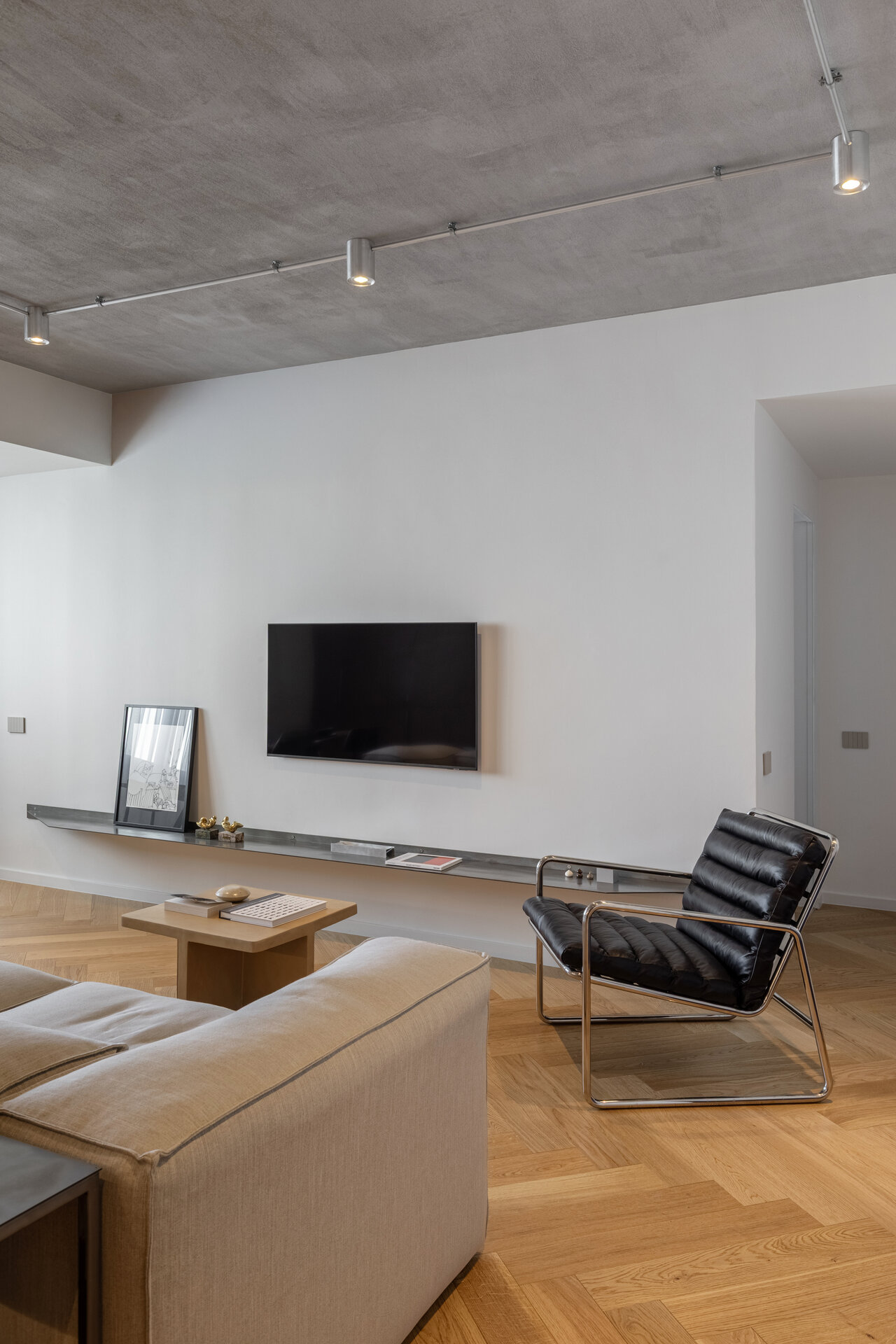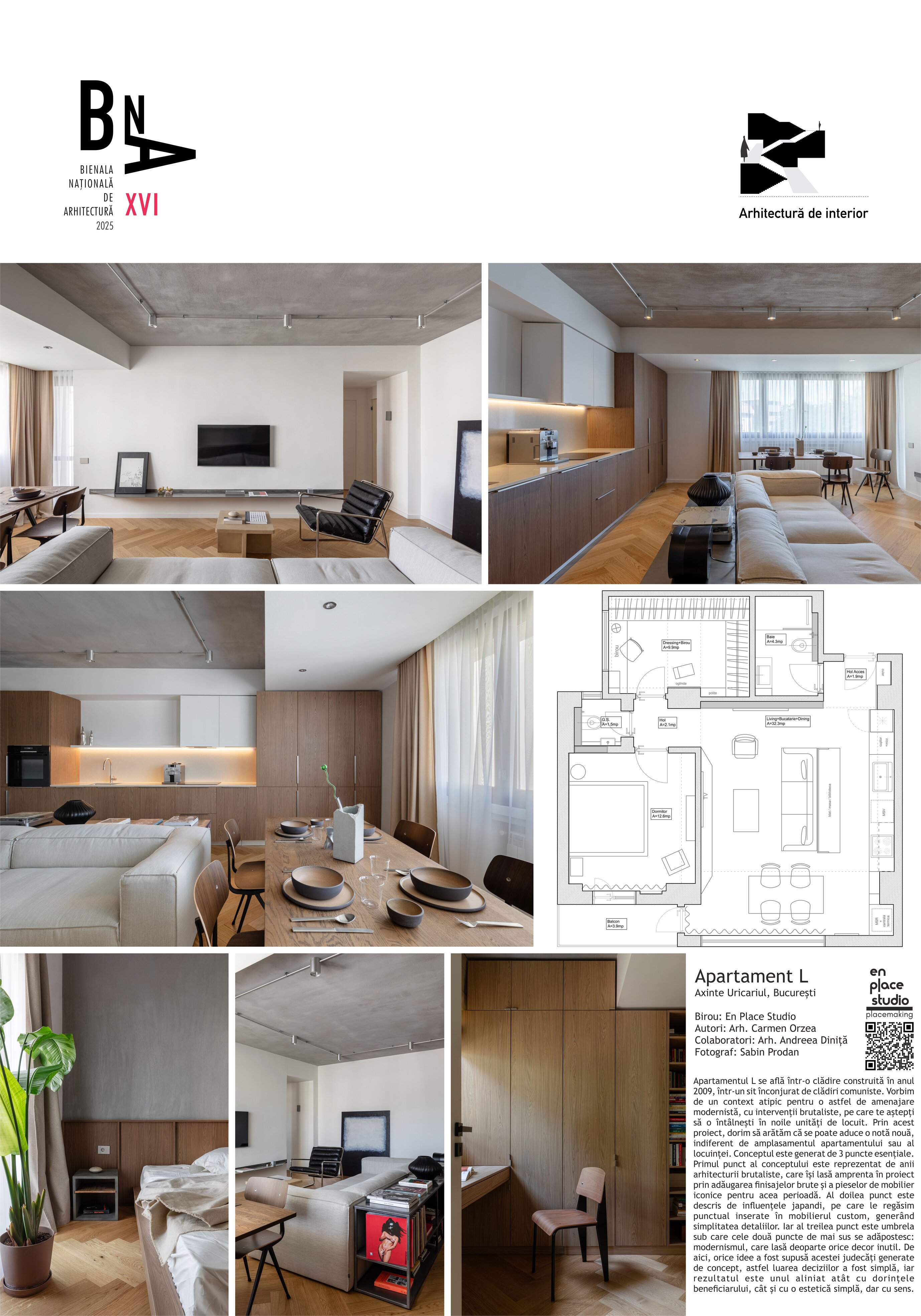 Apartamentul L se află într-o clădire construită în anul 2009, într-un sit înconjurat de clădiri comuniste. Vorbim de un context atipic pentru o astfel de amenajare modernistă, cu intervenții brutaliste, pe care te aștepți să o întâlnești în noile unități de locuit.