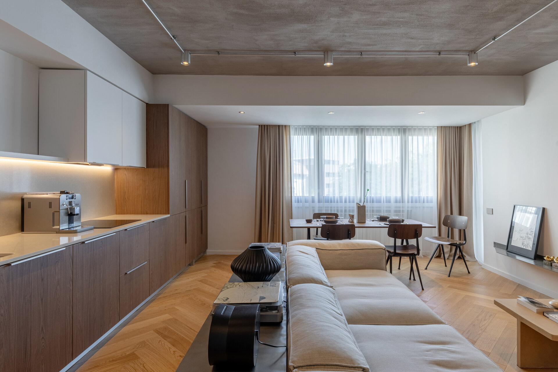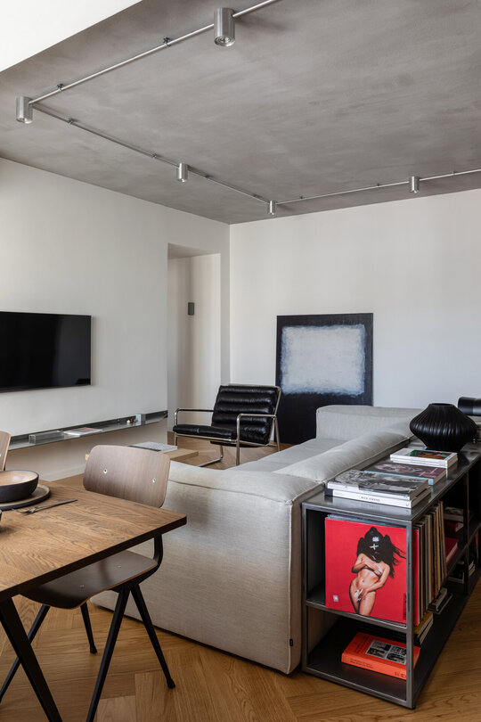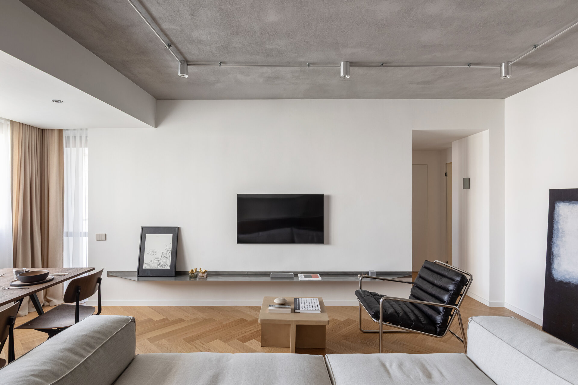 Apartamentul L se află într-o clădire construită în anul 2009, într-un sit înconjurat de clădiri comuniste. Vorbim de un context atipic pentru o astfel de amenajare modernistă, cu intervenții brutaliste, pe care te aștepți să o întâlnești în noile unități de locuit.