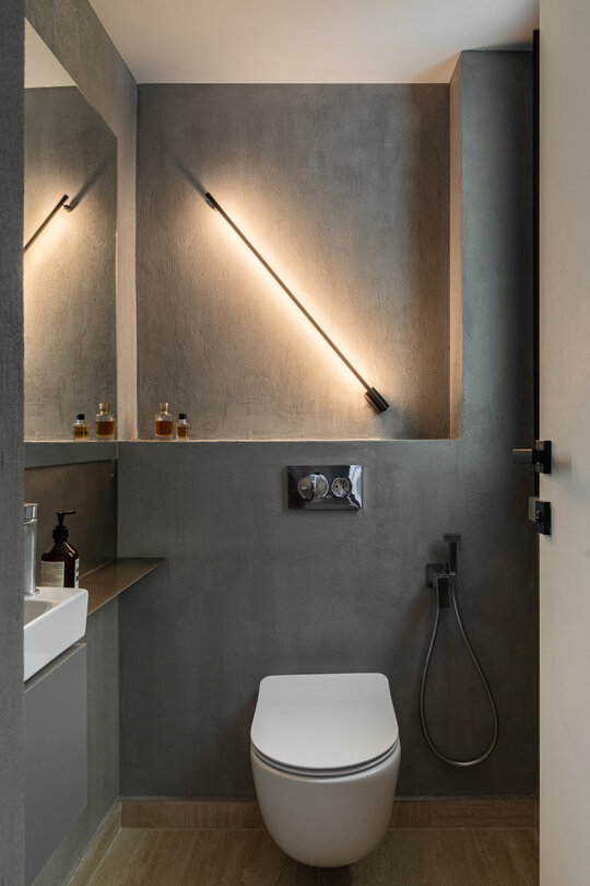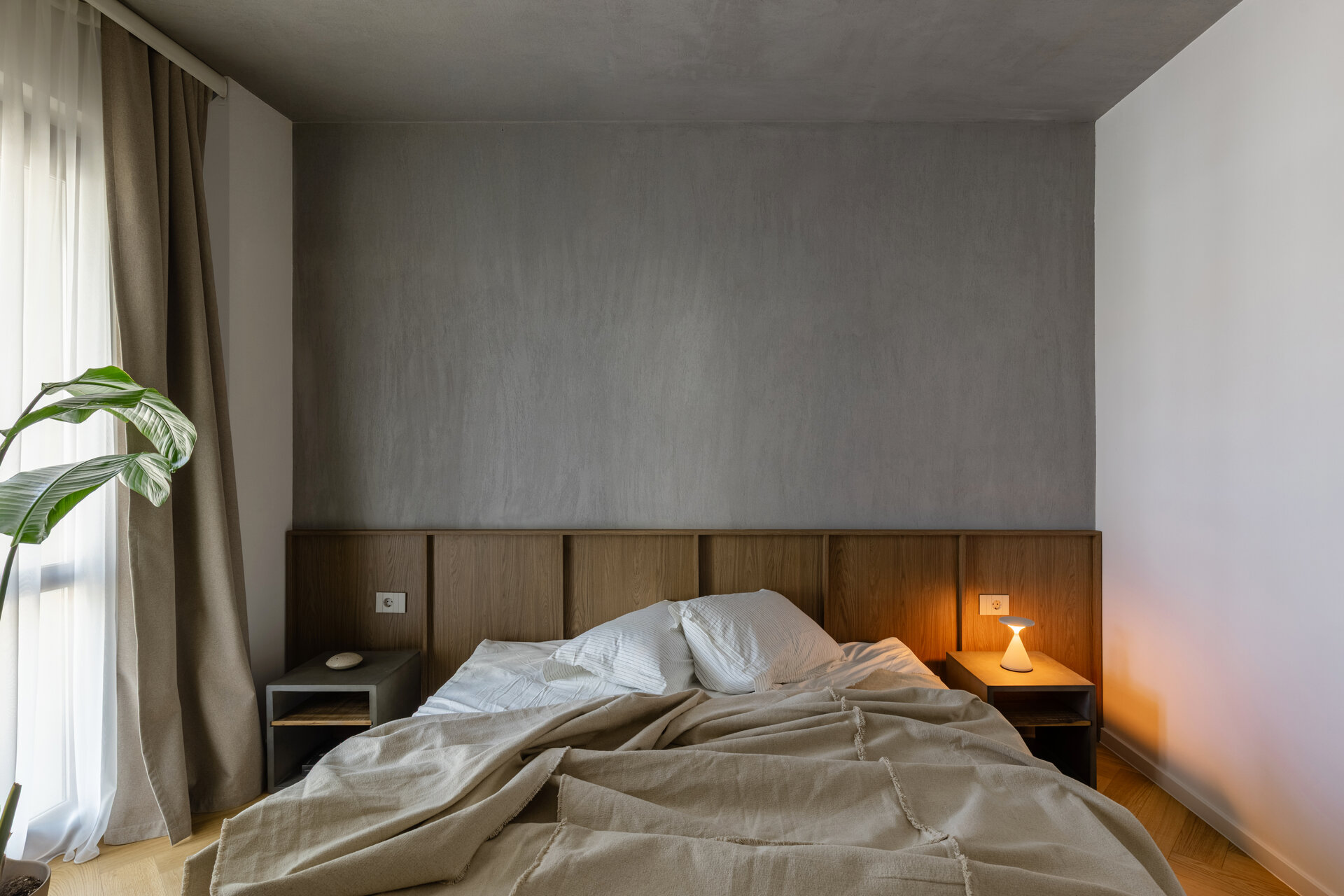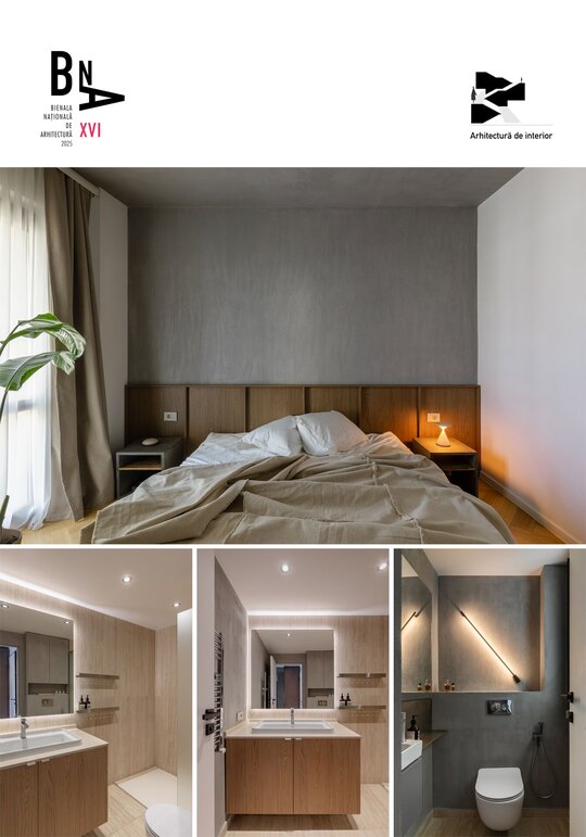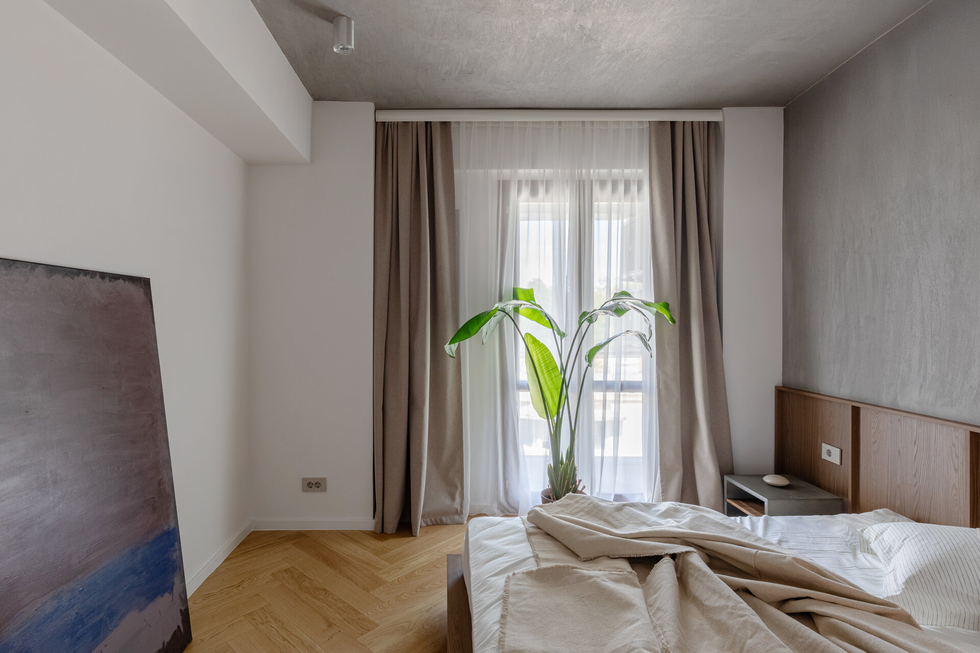 Trecem la finisaje, pe care le vom detalia pe rând. Am dorit o inserție de beton, iar ceea ce am putut face a fost să construim un caroiaj simetric pe tavan și să creăm astfel o zonă bine marcată, pe care să o finisăm cu o tencuială decorativă care imită cimentul. Am continuat cu același finisaj pentru peretele capăt de perspectivă al patului și pereții din grupul sanitar mic. Pentru grupul sanitar mare, am echilibrat finisajul de ciment cu o gresie și o faianță tip travertin, folosite în zonele umede, având la bază funcționalitatea, dar și echilibrul estetic pe care îl aduce. Ușoarele striații și venatura verticală înnobilează materialul și îi conferă importanță vizuală, dar și tactilă. Pentru restul pereților și tavanelor, am folosit o lavabilă cu o tentă de gri deschis, iar pentru pardoseală am ales un parchet natur, dublu stratificat. Am făcut instalația electrică aparentă și am trecut-o prin țeava metalică de aluminiu, tocmai pentru a obține detaliile brutaliste, ușor industriale.