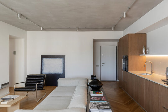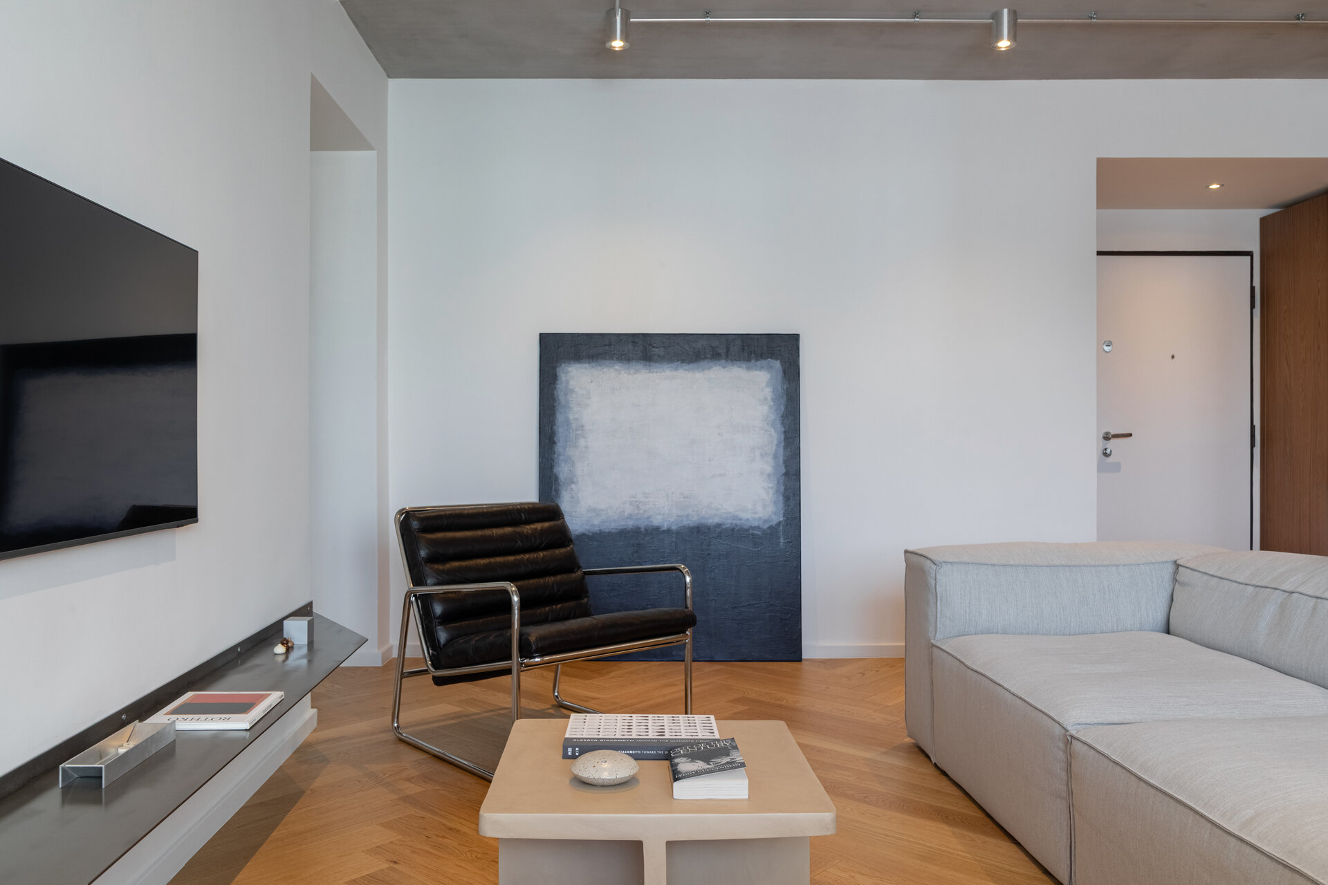 Corpurile de iluminat sunt argintii, iar astfel creează un tot unitar.Piesele de mobilier sunt custom, bucătăria are finisaje de lemn cu care ne-am dorit să echilibrăm toată tenta de gri dată de majoritatea materialelor. Patul este de inspirație japoneză, cu o ramă care iese în afara saltelei. Pentru living, am customizat din tablă de metal o comodă pentru zona televizorului și două piese de mobilier în spatele canapelei.