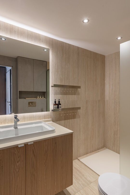 Ca funcționalitate, vorbim de un apartament open space, cu două grupuri sanitare amplasate incorect; cel mare este în proximitatea accesului, iar cel mic deservește dormitorul matrimonial. În mod normal, amplasarea lor este inversă, dar nu am avut cum să modificăm acest aspect, așa că ne-am adaptat. Am dorit să obținem din grupul sanitar mic unul foarte bine definit, cu personalitate. Dormitorul mic a fost transformat în dressing și birou, iar dormitorul matrimonial folosit ca atare.