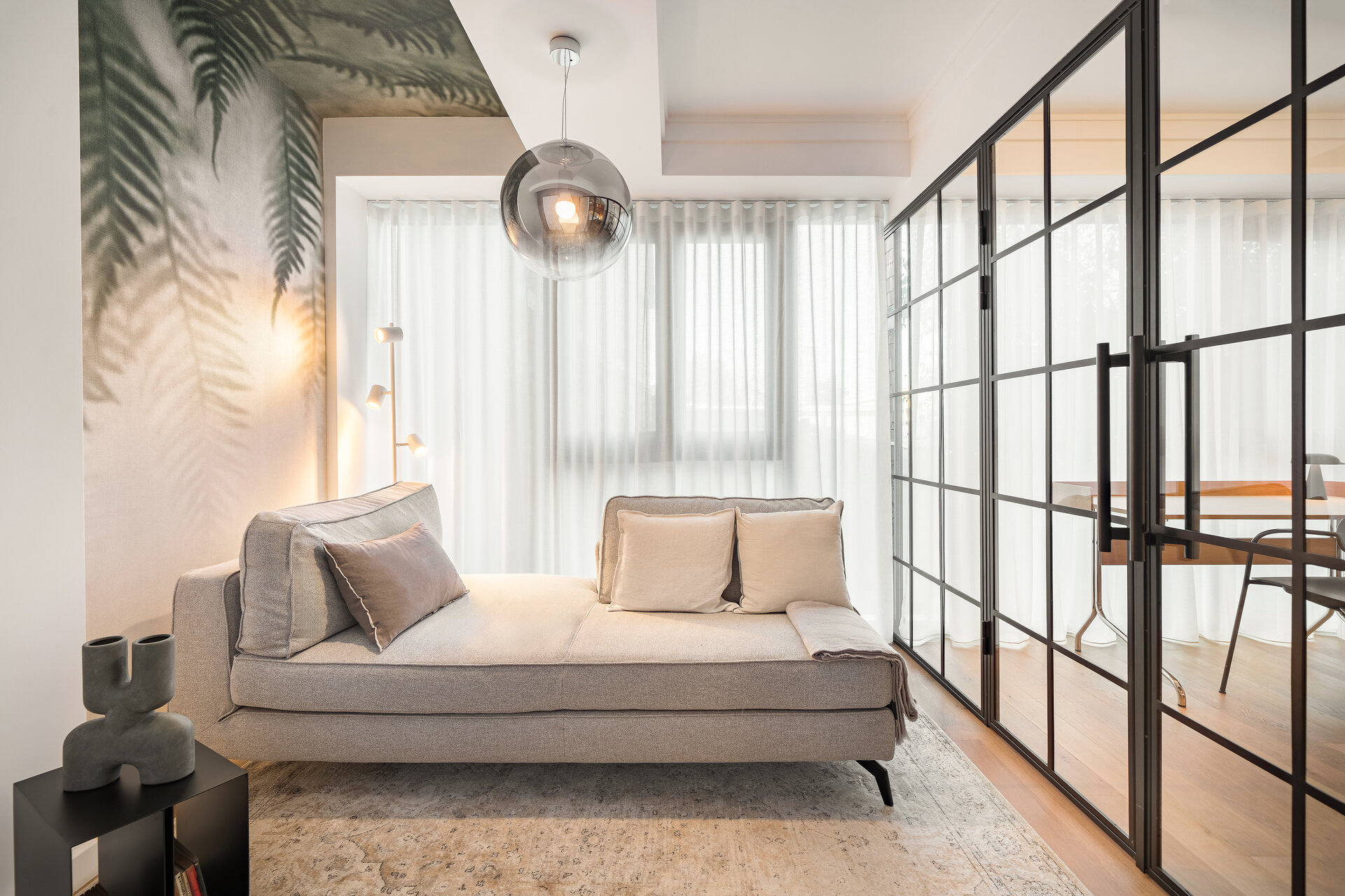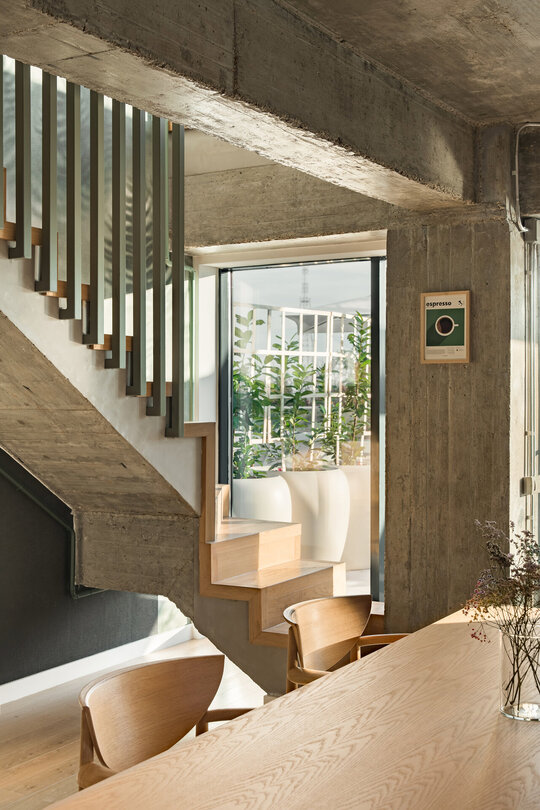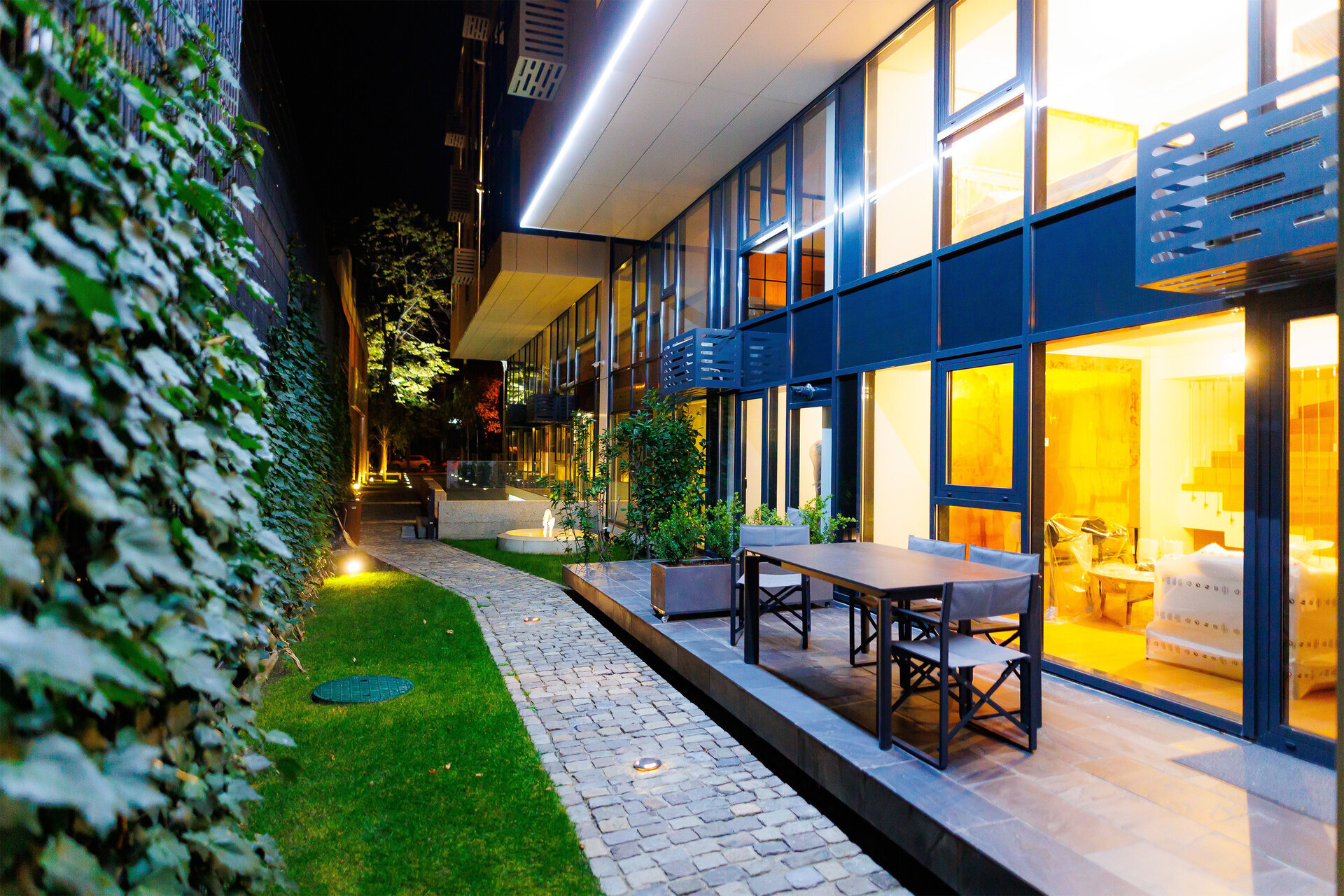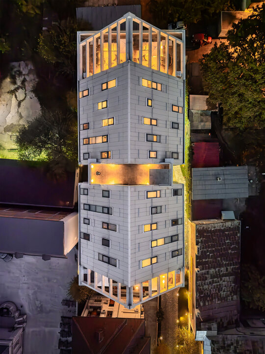 Apartamentele operate în sistem de booking au o amenajare minimală, tavane de beton aparent, pardoseli din rășină epoxidică sau lemn lamelar, placaje de tablă de cupru pe pereți și mobilier din metal.