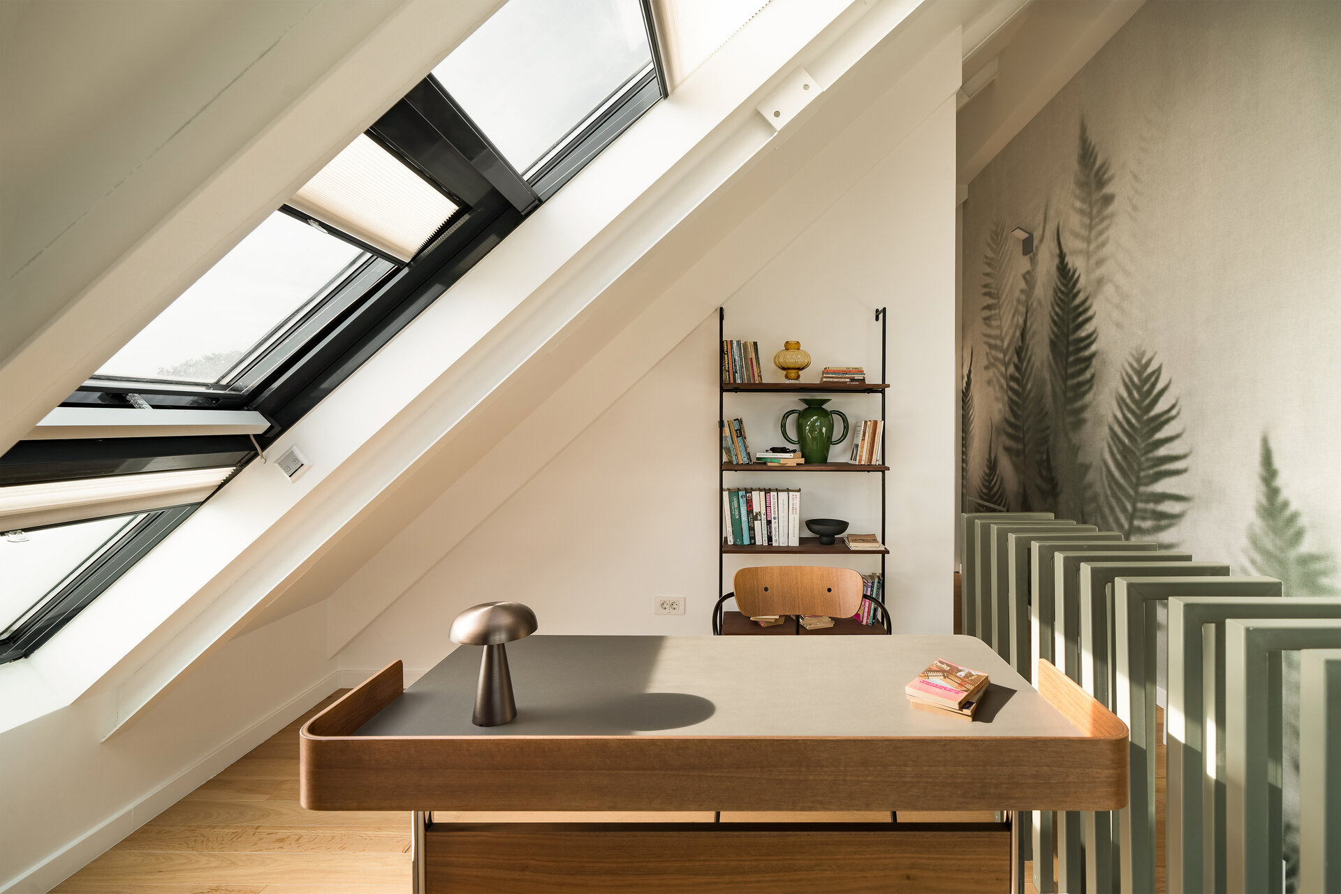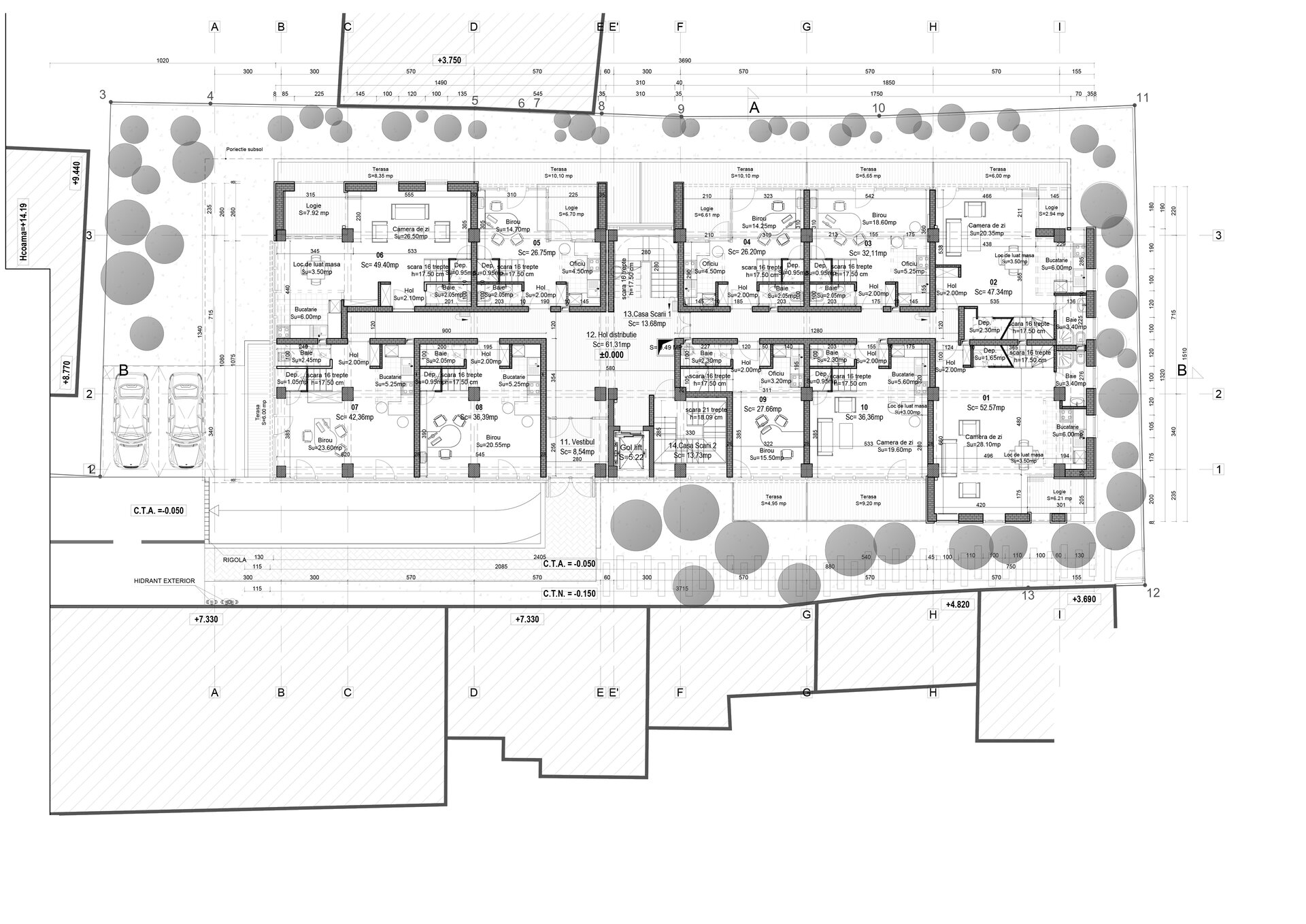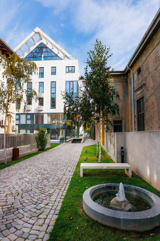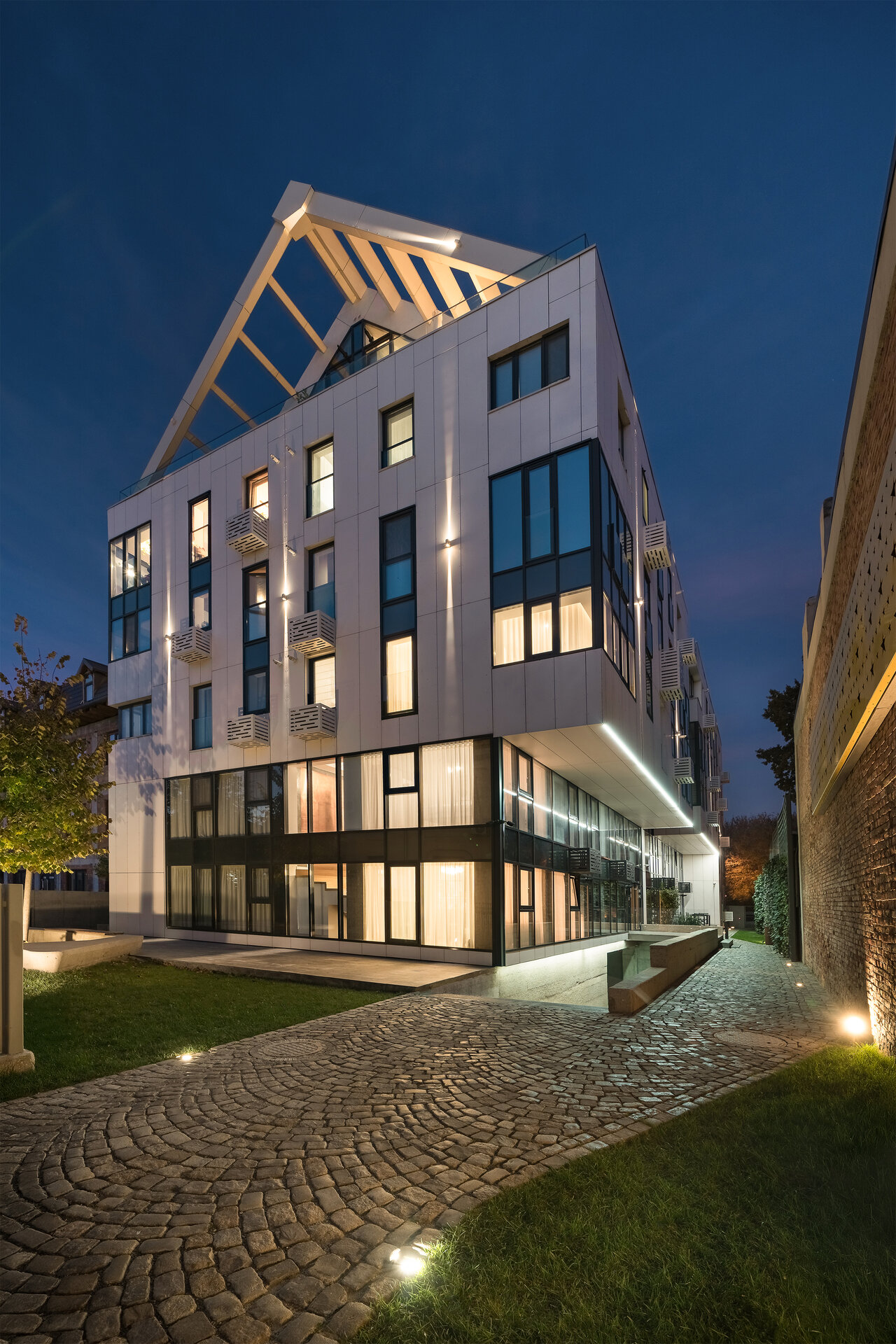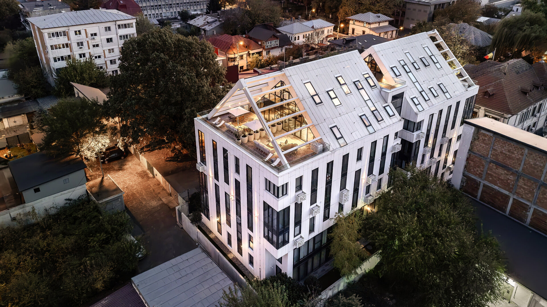 Transparența de la primele nivele de birouri, de la circulațiile verticale și terasele duplexurilor de la mansardă dă profunzime percepției exterioare, în relație cu plinurile traforate ale zonei rezidențiale.