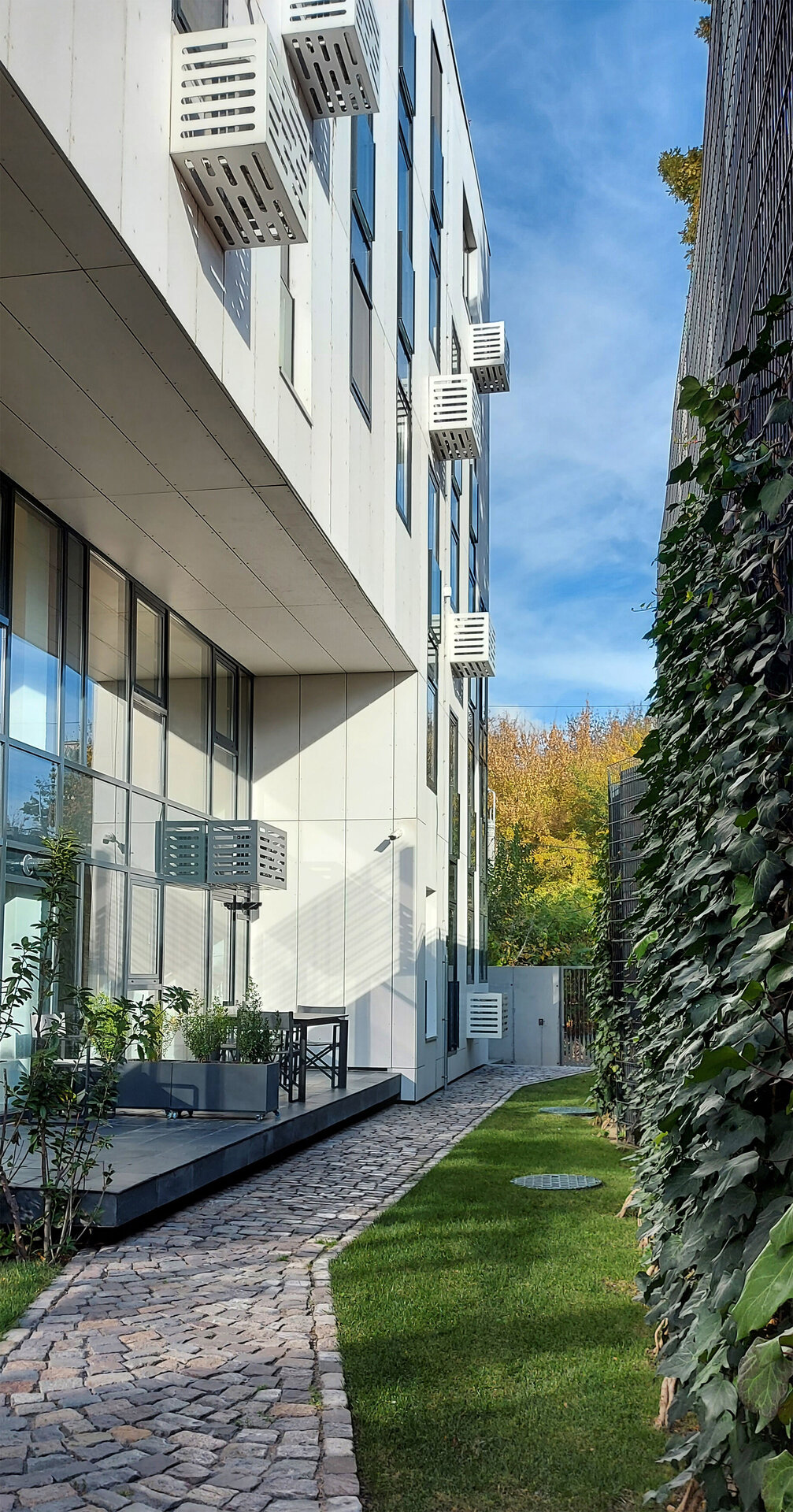 Accesul semicarosabil este tratat cu piatră cubică, mărginit de gazonul mobilat cu banchete, fântâni și corpuri de iluminat. Calcanele de pe limita de proprietate sunt îmbrăcate cu vegetație cățărătoare pe structură metalică.