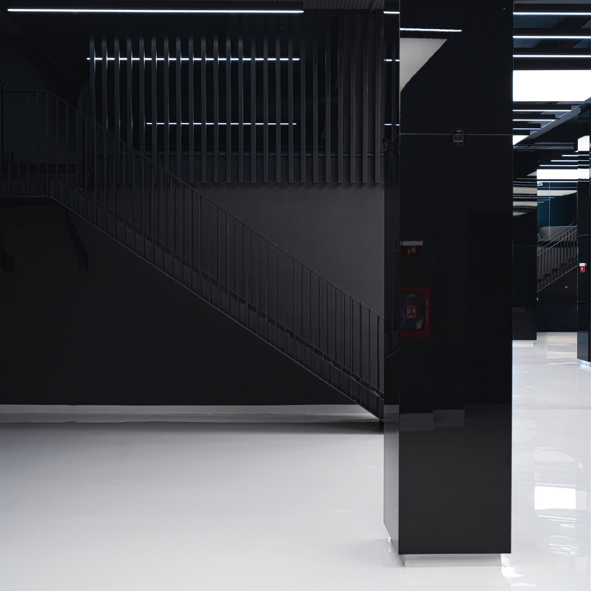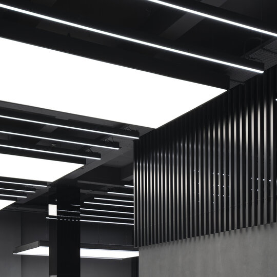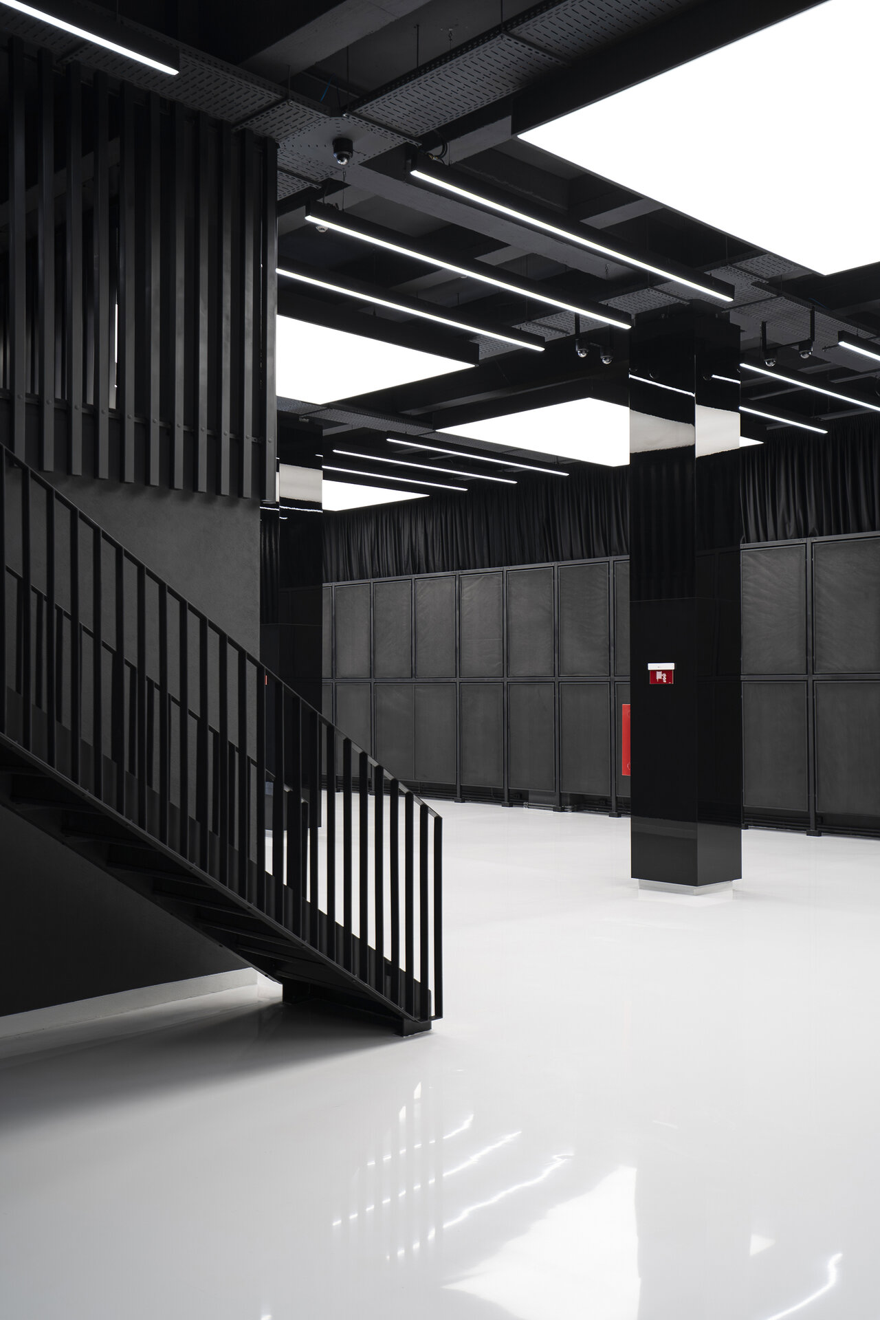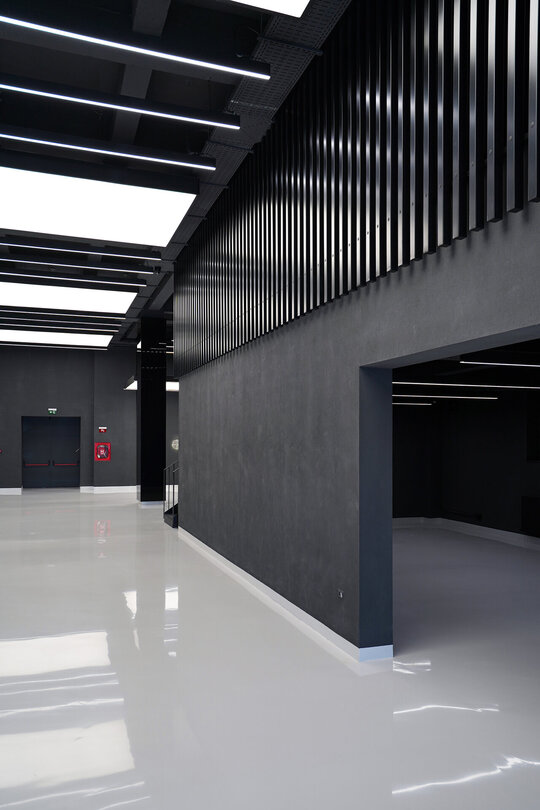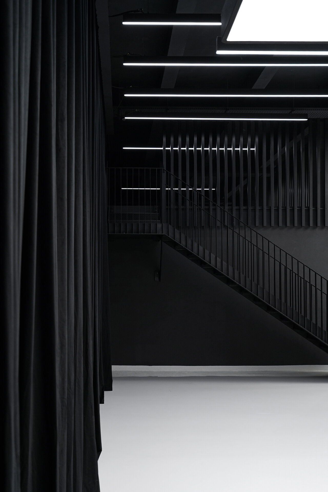 Atmosfera întunecată, teatrală, este echilibrată de compoziția corpurilor de iluminat, care amplifică proeminența longitudinală a spațiului principal și se așază pe plafon respectând logica structurală a traveilor existente. Suprafața luminoasă neobișnuit de mare pe care acestea o permit, asigură o plajă largă de contraste și scenarii de iluminare, necesare pentru lucru, pentru expoziții și pentru efecte cinematografice sau filmări deopotrivă.