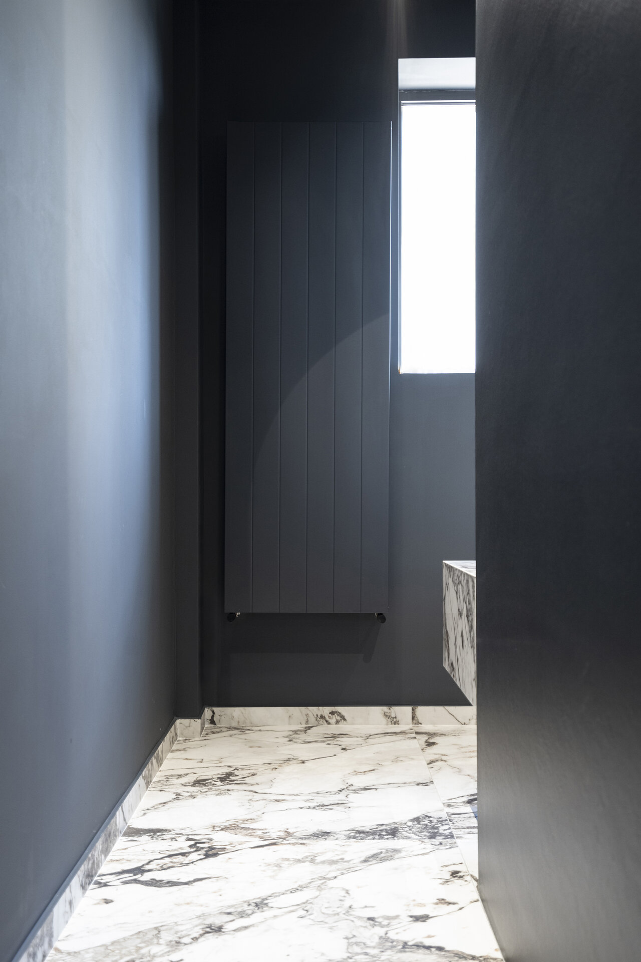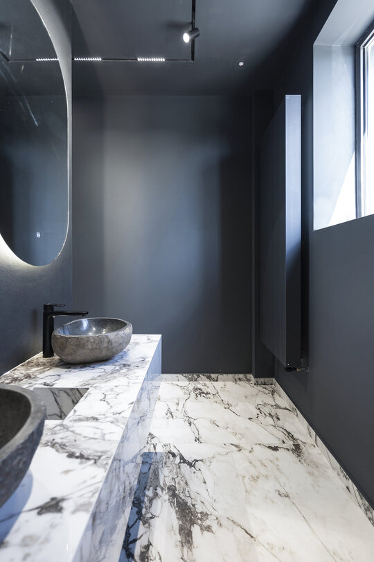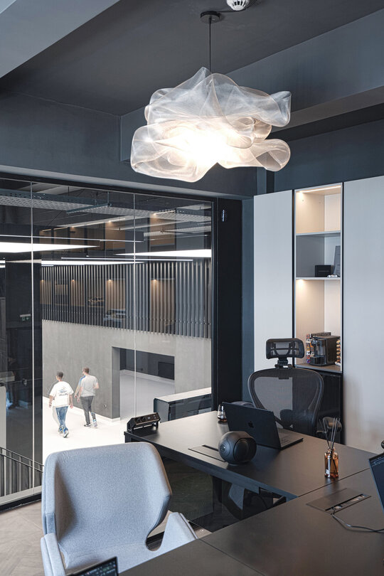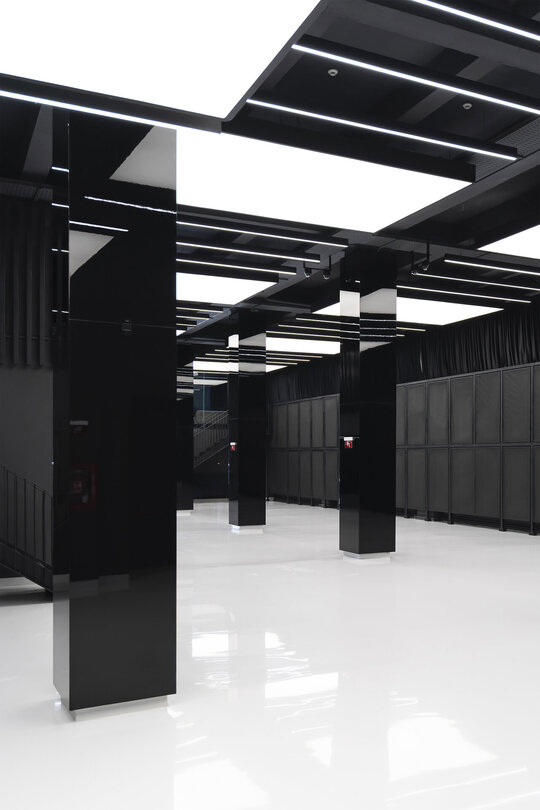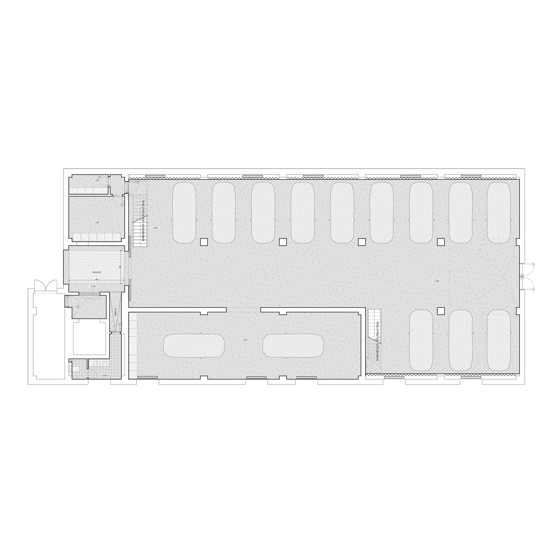 Atmosfera întunecată, teatrală, este echilibrată de compoziția corpurilor de iluminat, care amplifică proeminența longitudinală a spațiului principal și se așază pe plafon respectând logica structurală a traveilor existente. Suprafața luminoasă neobișnuit de mare pe care acestea o permit, asigură o plajă largă de contraste și scenarii de iluminare, necesare pentru lucru, pentru expoziții și pentru efecte cinematografice sau filmări deopotrivă.