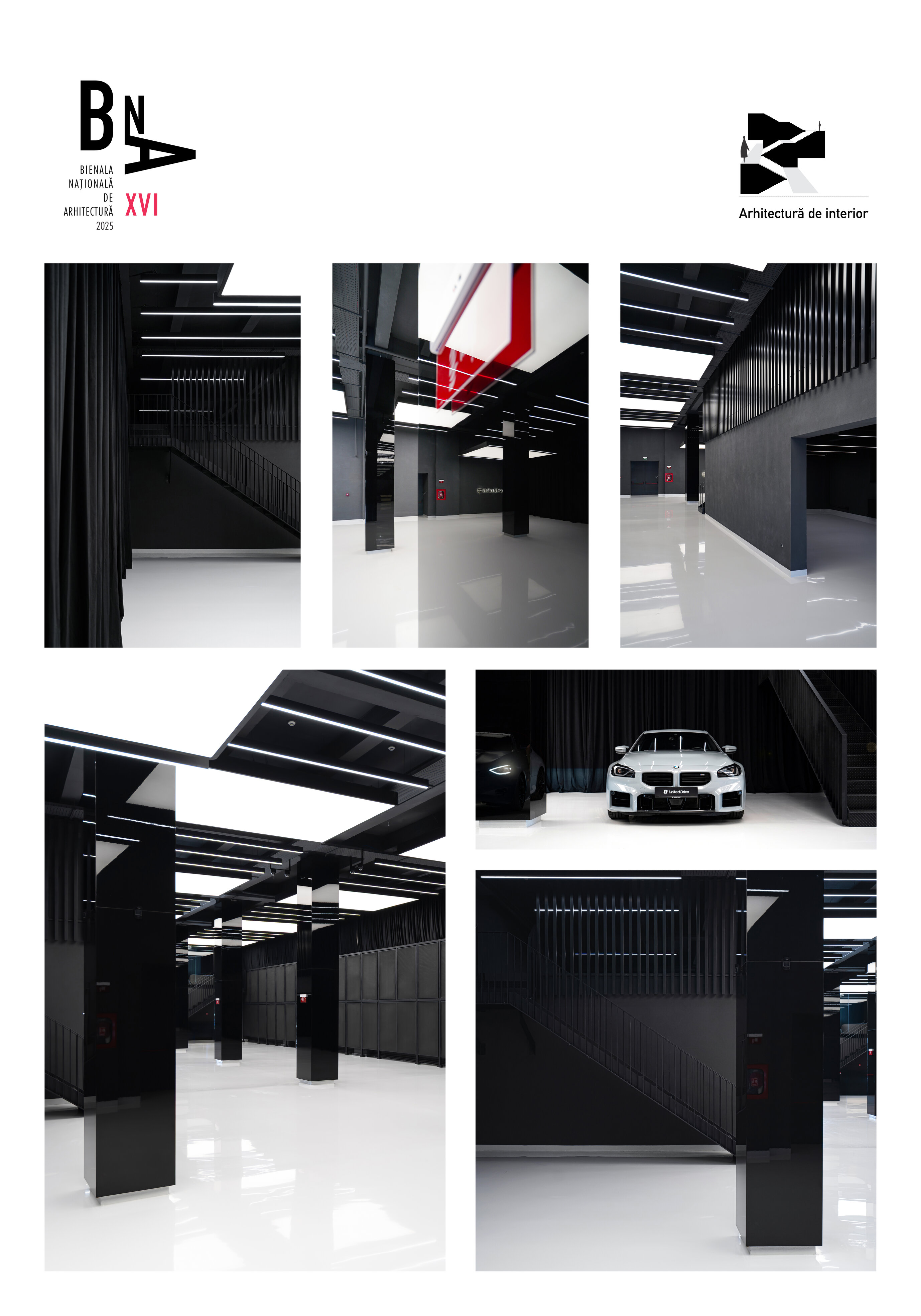 Spațiul principal al zonei de depozit este tratat mai degrabă ca o scenă secundară a showroom-ului propriu-zis, îndepărtându-se în mare măsură ambianța depozitului industrial strict utilitar. Noua organizare planimetrică urmărește o circulație fluidă și o ierarhie intuitivă a diferitelor zone solicitate în cadrul aceluiași open - space, fără a fi necesară redistribuția spațiilor interioare existente. Gândit ca un mediu imersiv pentru prezentarea automobilelor stocate temporar, sunt promovate și valorificate, în primul rând, subansamblurile aparente, ce formează un cadru unitar și echilibrat, cu accent pe contrastul impactului vizual. Zonele secundare adiacente sunt tratate într-o manieră similară, fără a întrerupe limbajul arhitectural principal. Două dintre aceste spații aflate la o cotă superioară, dar impropriu accesibile, sunt recuperate cu ajutorul a două scări metalice, asamblate folosind aceeași configurație vizuală a spațiului principal.