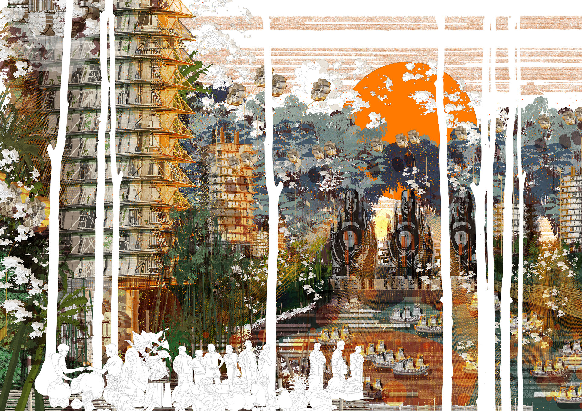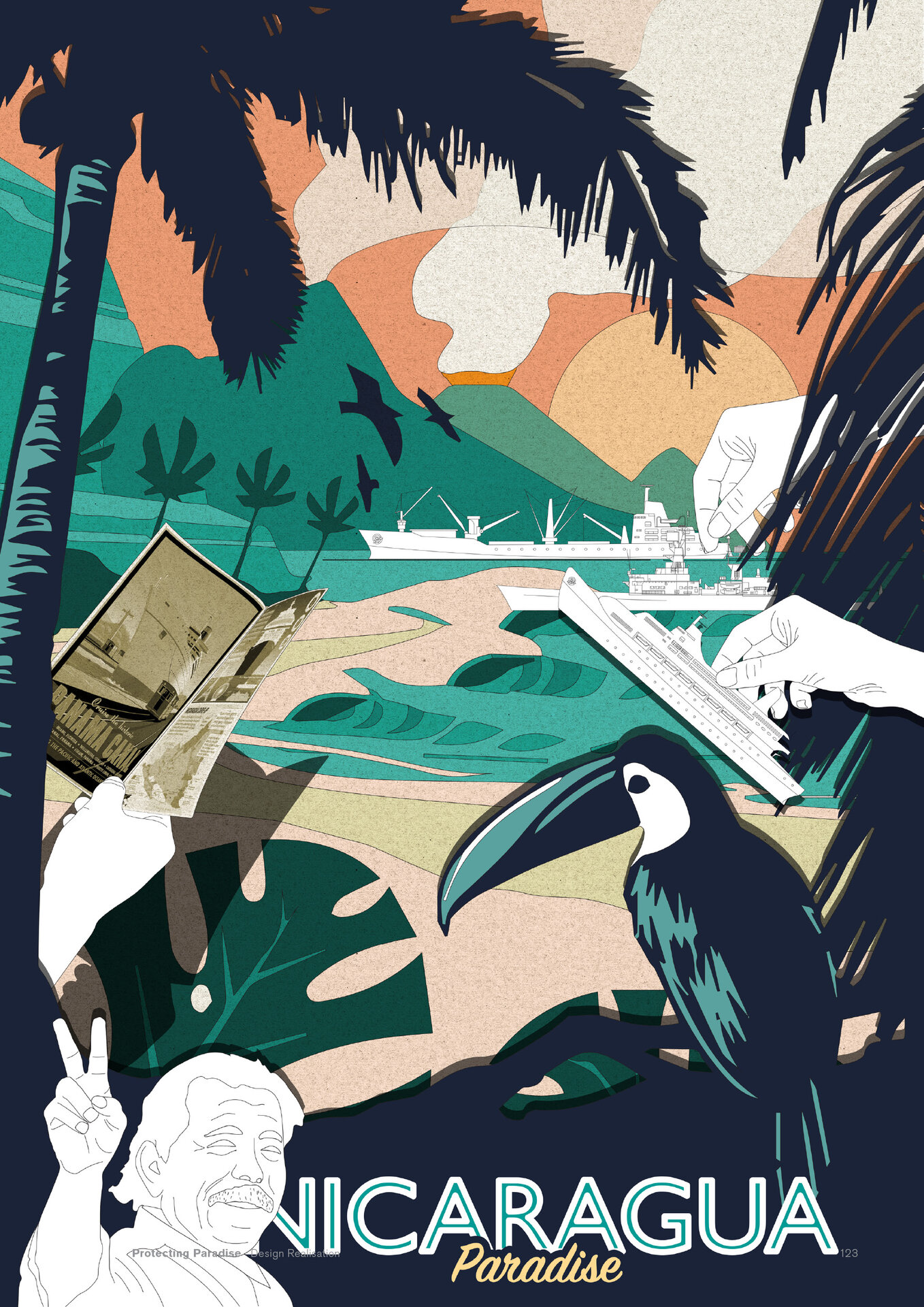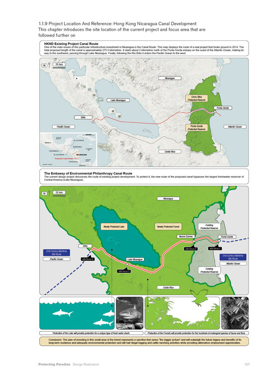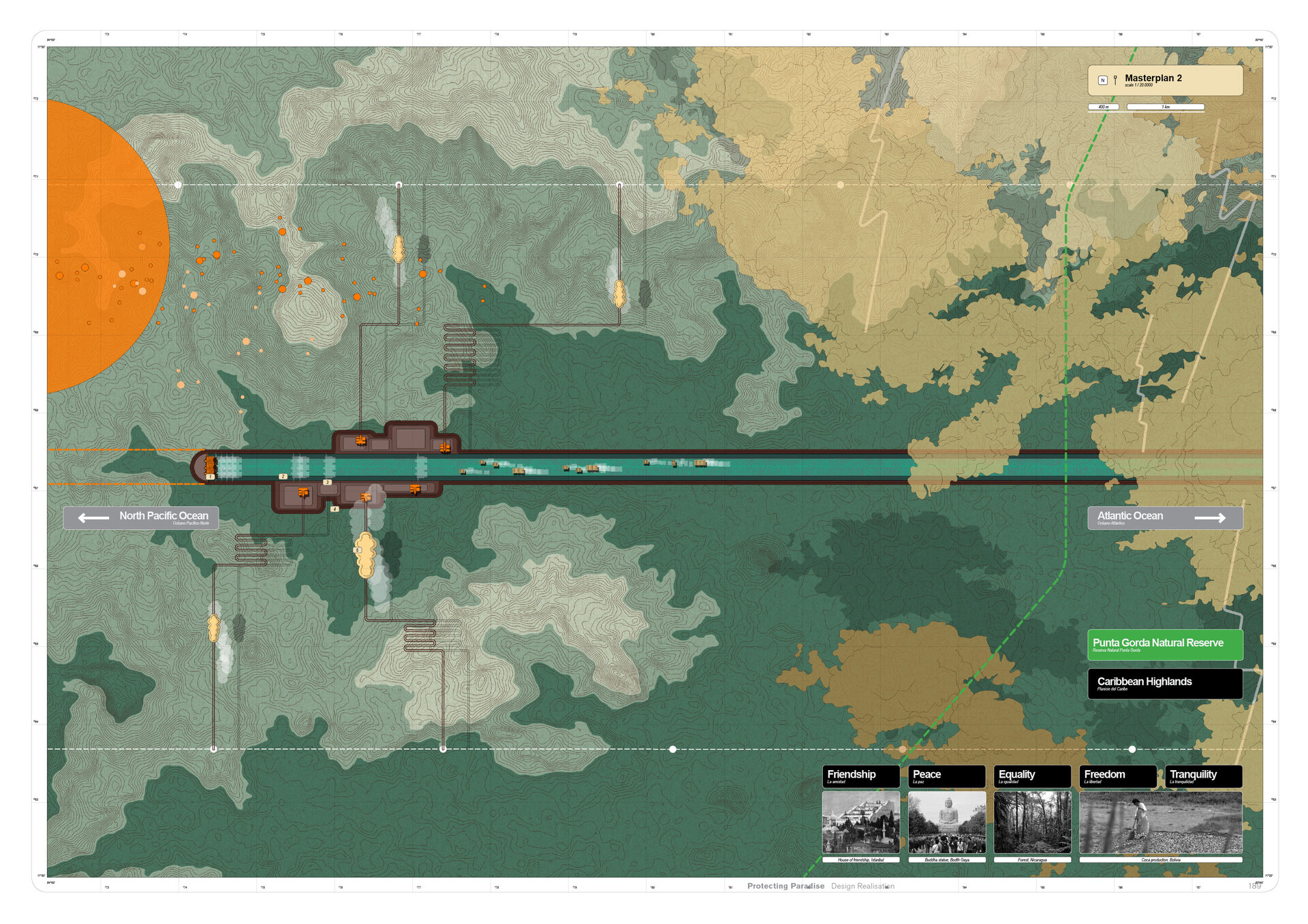 Inspirat de romanul clasic chinezesc Călătorie spre Vest (Wu Cheng’en sec. al XVI-lea), unde eroii luptă pentru a proteja cerurile, proiectul explorează cum pacea, egalitatea și libertatea pot deveni instrumente democratice de proiectare pentru a proteja Paradisul – cea mai extinsă pădure tropicală din America Centrală. Protecting Paradise: The Embassy of Environmental Philanthropy interpretează un acord diplomatic și economic bilateral între China și Nicaragua, apărut în contextul extinderii „Noului Drum Maritim al Mătăsii” din secolul XXI. Această „ambasadă” simbolică cultivă protecția mediului, autoritatea etică și încrederea politică, propunând o alternativă sustenabilă la infrastructura canalului inter-oceanic din Nicaragua – una dintre cele mai controversate investiții ale ultimului deceniu. Proiectul aduce în prim-plan o critică geopolitică a investițiilor răsăritene în țările în curs de dezvoltare, propunând în schimb practici de protecție ecologică și responsabilitate socială. Turiștii și comunitățile locale se întâlnesc într-un cadru guvernat de cinci principii ale coexistenței pașnice: prietenie, pace, egalitate, liniște și libertate. Masterplanul funcționează ca o investigație spațială: valorifică modul în care aceste principii pot fi aplicate la diferite scări – de la protecția peisajului la organizarea comunităților. Operațiunile de săpare a canalului devin, paradoxal, ocazia de a regândi resursele: pământul excavat și pădurile defrișate sunt reutilizate pentru a crea noi programe sustenabile – locuințe, spații productive și infrastructuri ecologice. Astfel, Paradisul nu rămâne doar în zona ficțiunii arhitecturale, ci devine un scenariu critic și o narațiune a construirii. El demonstrează că marile infrastructuri globale pot fi reimaginate nu ca gesturi de distrugere, ci ca moșteniri etice și ecologice, capabile să lase în urmă păduri și lacuri reziliente.