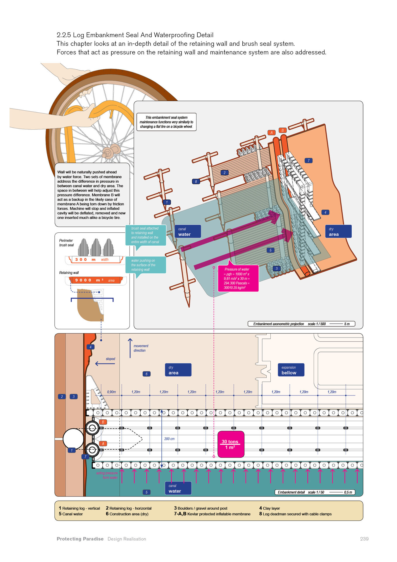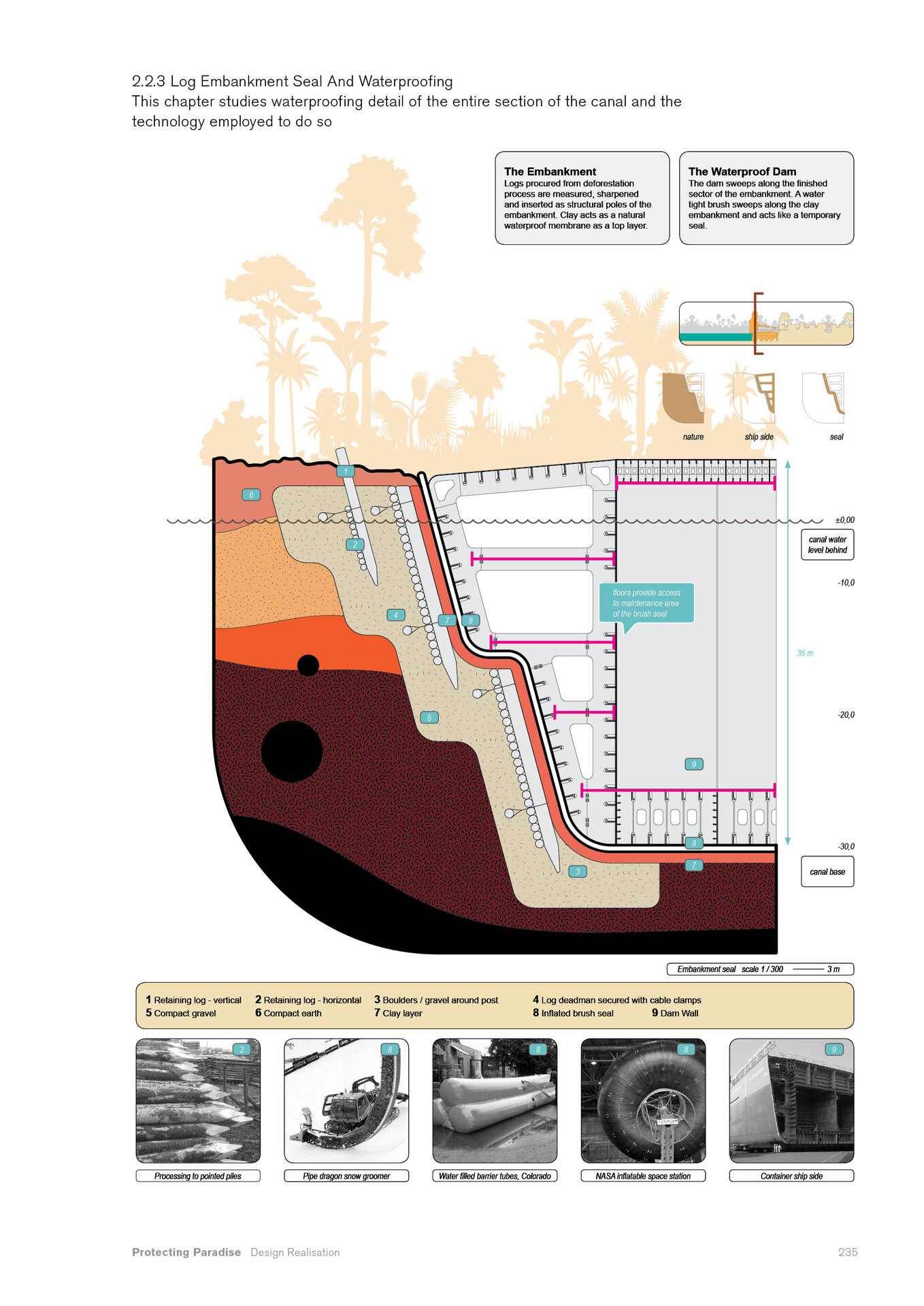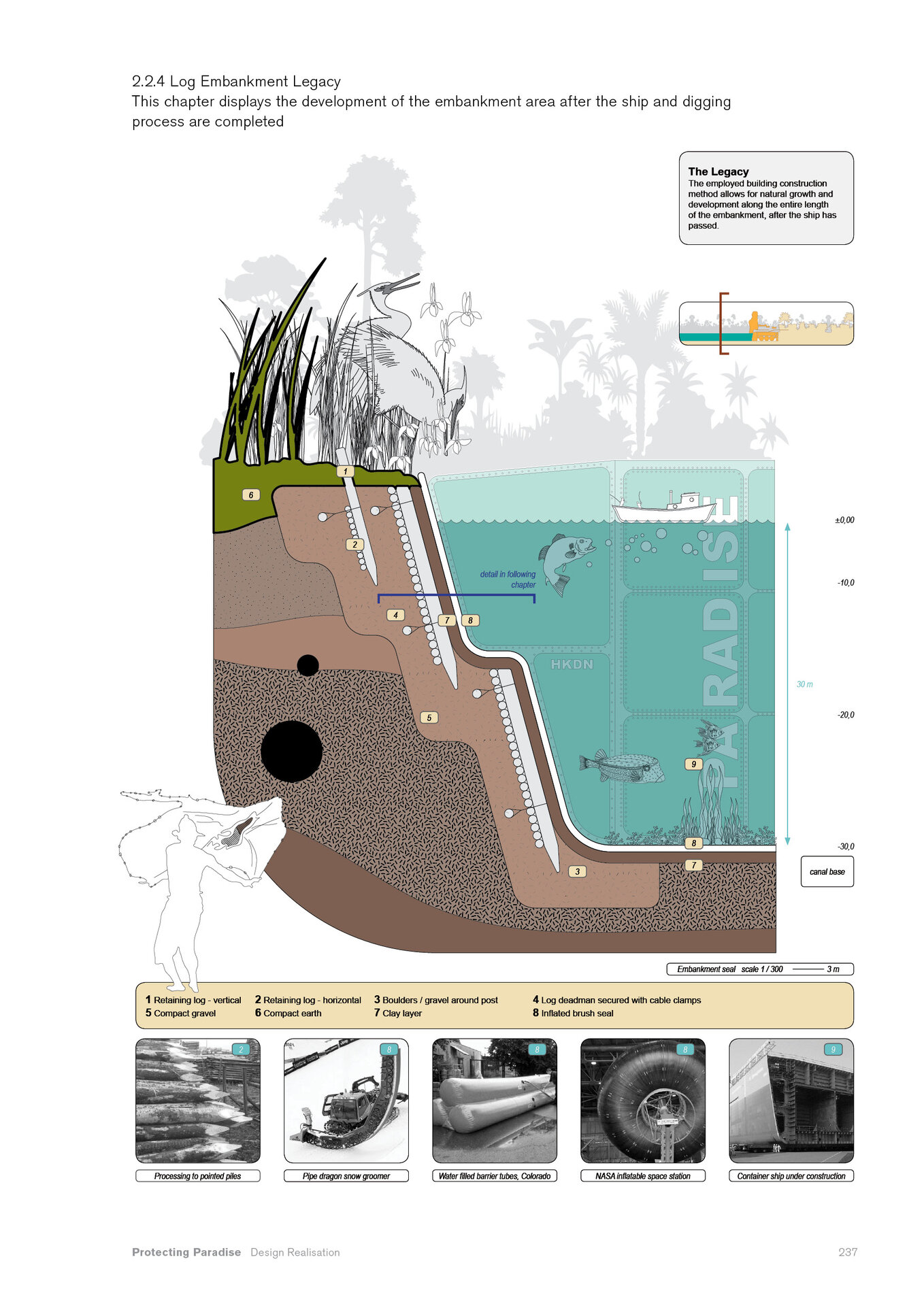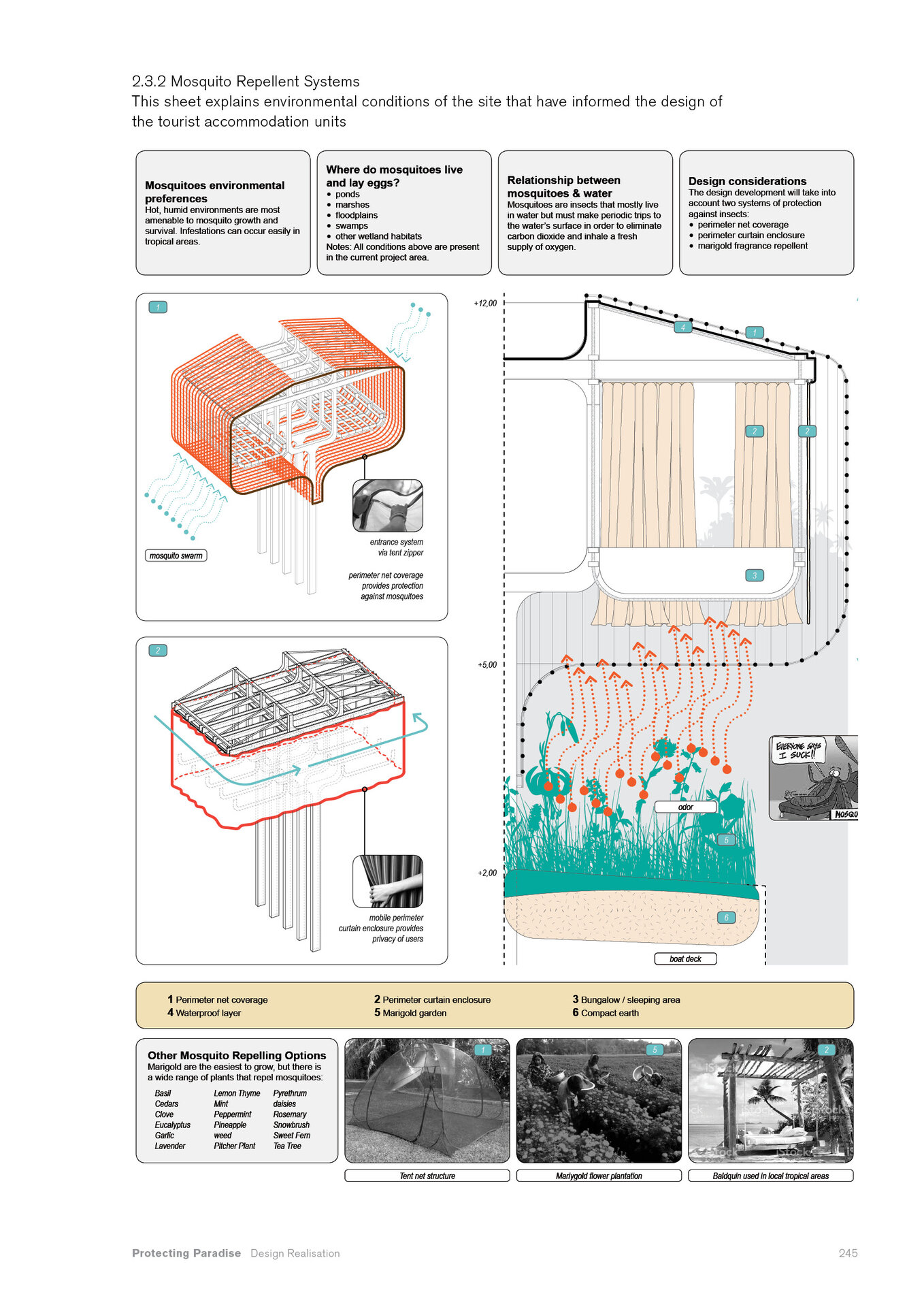 Proiectul investighează sustenabilitatea și provocările generate de schimbările climatice, precum și beneficiile reciproce ale abordării simultane a riscului și a modelării orașelor. Arhitectura devine un instrument care răspunde unei urgențe globale, dar o face printr-o combinație de narațiuni speculative și cunoaștere științifică actuală despre impactul mediului asupra societății. Efectele schimbărilor climatice asupra arhitecturii nu se reduc doar la variațiile meteorologice, ci implică transformări în comportament, demografie și presiuni economice. În acest sens, proiectul tratează clima ca pe o problemă de securitate, ceea ce obligă la regândirea sistemelor de arhitectură și urbanism într-o manieră radicală, multi-funcțională și inovatoare. Desenele nu documentează doar soluții, ci construiesc o poetică a viitorului. Ele cultivă optimism și o vitalitate impredictibil fragmentată, mai degrabă decât o unitate evidentă. Spațiul și elementele sale sunt prezentate în multiple registre de citire, devenind în același timp simbolice, speculative și tehnic viabile. Reprezentările utilizează alăturări de structuri narative, simboluri, ficțiune și instrumente de expunere tehnică pentru a genera arhitecturi sustenabile cu impact social și spațial. Ele arată că arhitectura, prin intermediul reprezentării, poate să articuleze noi moduri de viață și noi infrastructuri urbane, transformând criza climatică din amenințare iminentă în fascinație creativă. Protecting Paradise a fost distins în 2019 cu Premiul KRob pentru excelență în tehnică digitală și reprezentare hibridă acordat de American Institute of Architects, precum și cu Premiul de Bronz al Asociației Ilustratorilor Japonezi.