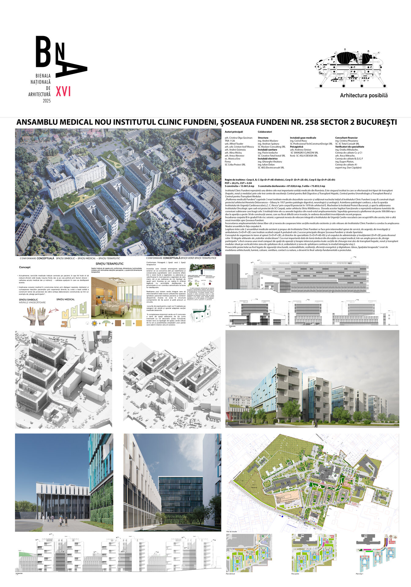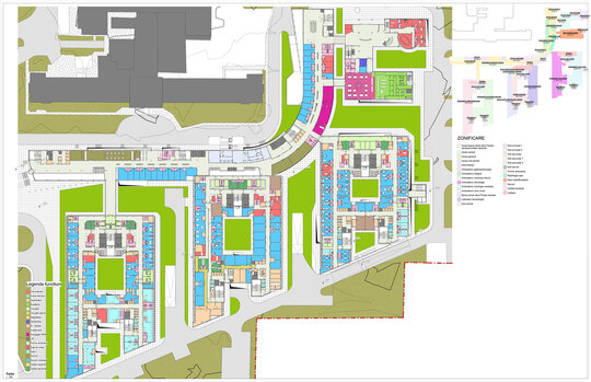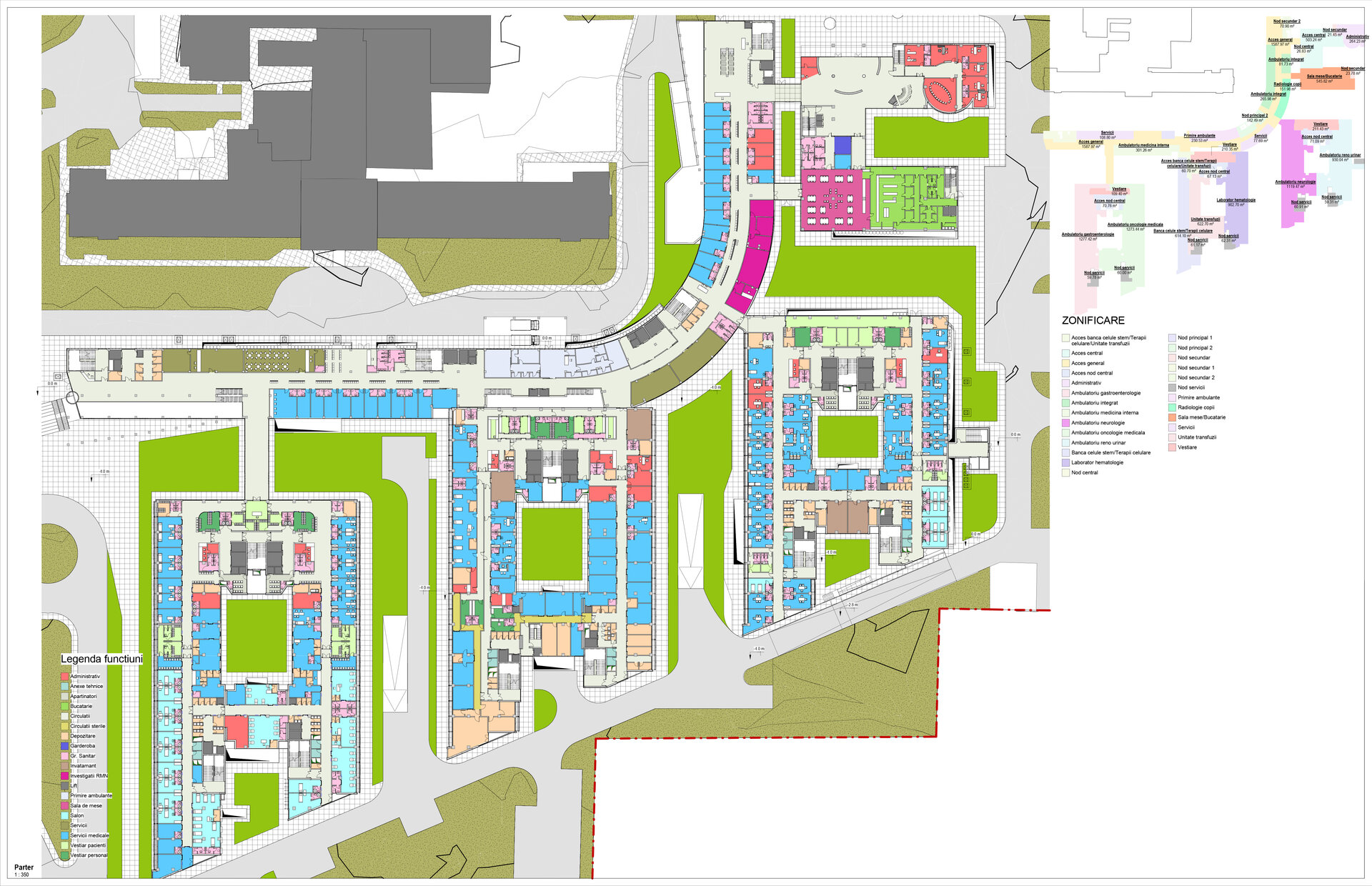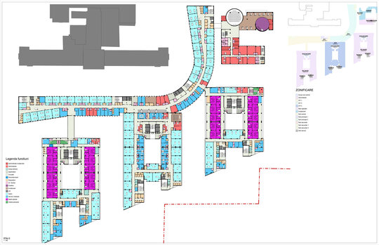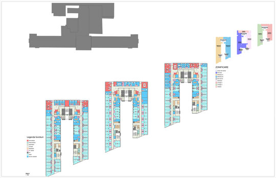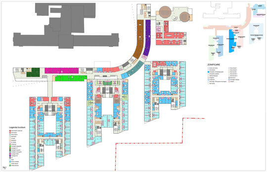 Conceptul de organizare în teren al spinei (S+D+P+2E), al clinicilor de specialitate (S+D+P+6E+Et) și al corpului de administrație și învățământ (D+P+2E) preia desenul celor 10 degete alăturate ale „mâinilor vindecătoare”. Cea mai importantă dată de temă dedusă din discuțiile cu corpul medical, într-un amplu proces de „design participativ” a fost crearea unui nivel compact de spații de operații și terapie intensivă pentru toate secțiile de chirurgie mai ales de transplant hepatic, renal și transplant medular situat pe verticală între zona de spitalizare de zi, ambulatorii și zona de spitalizare continuă, la nivelul întregului etaj 2.