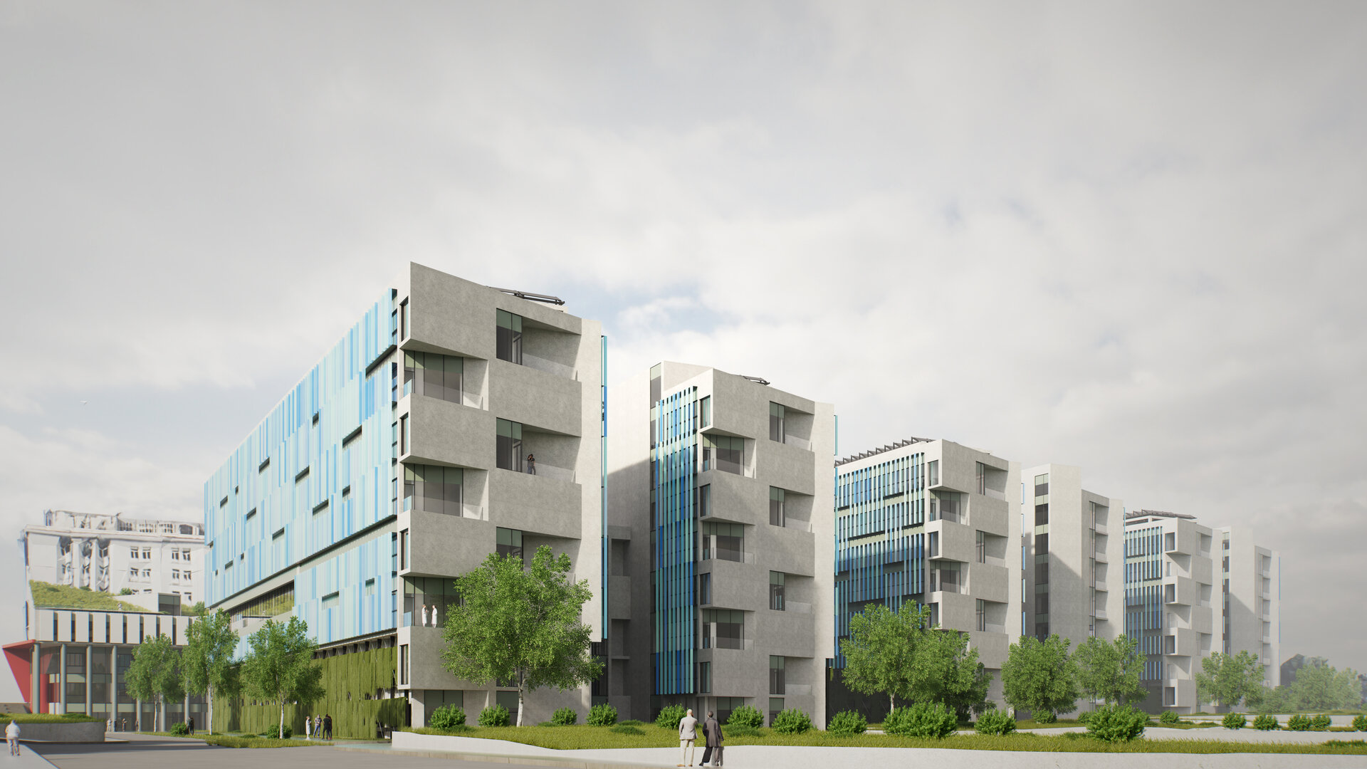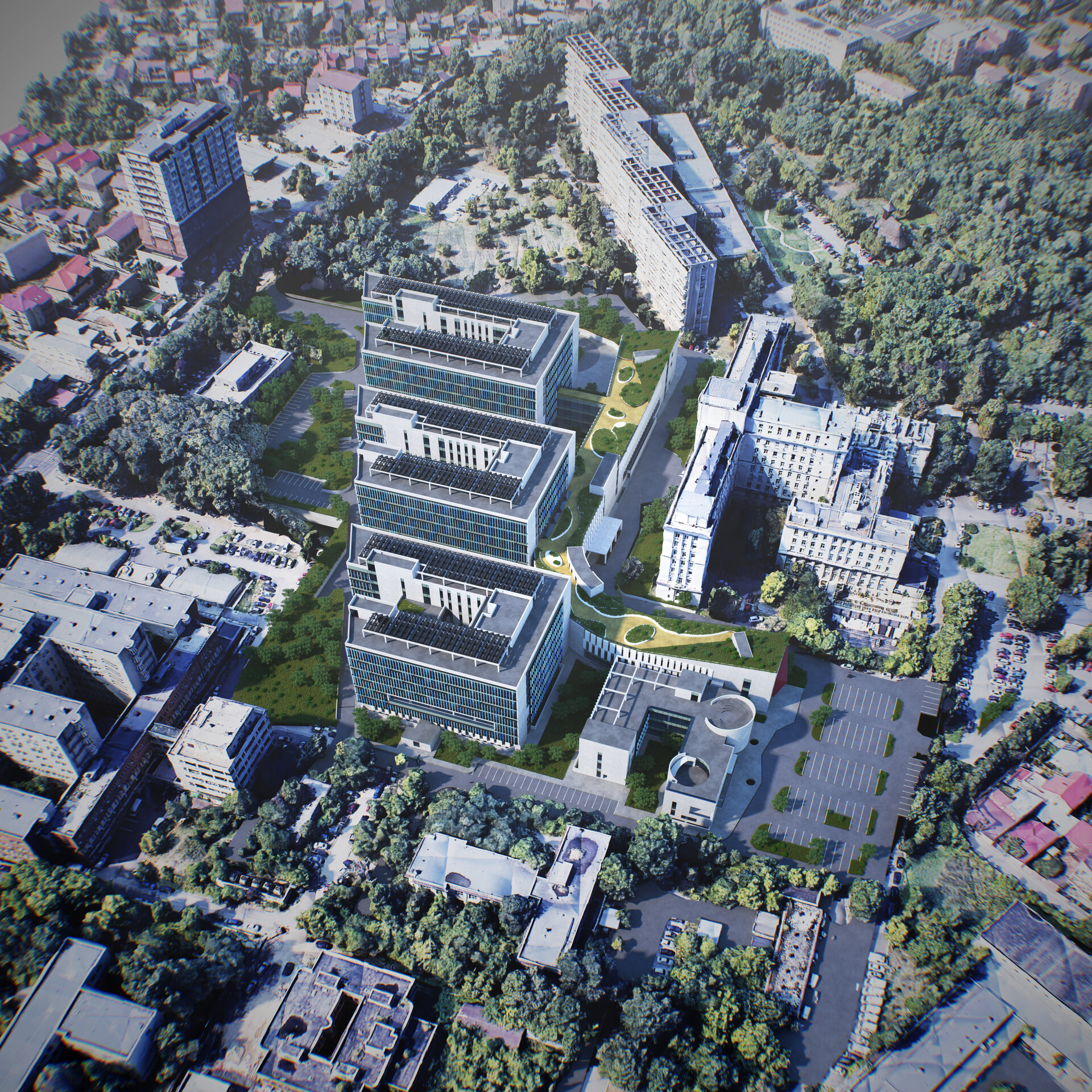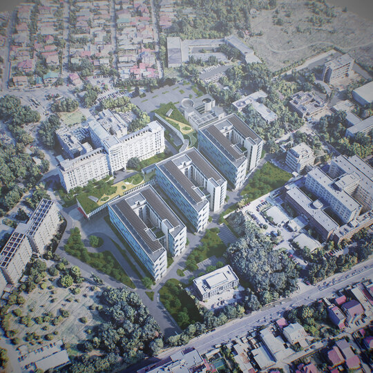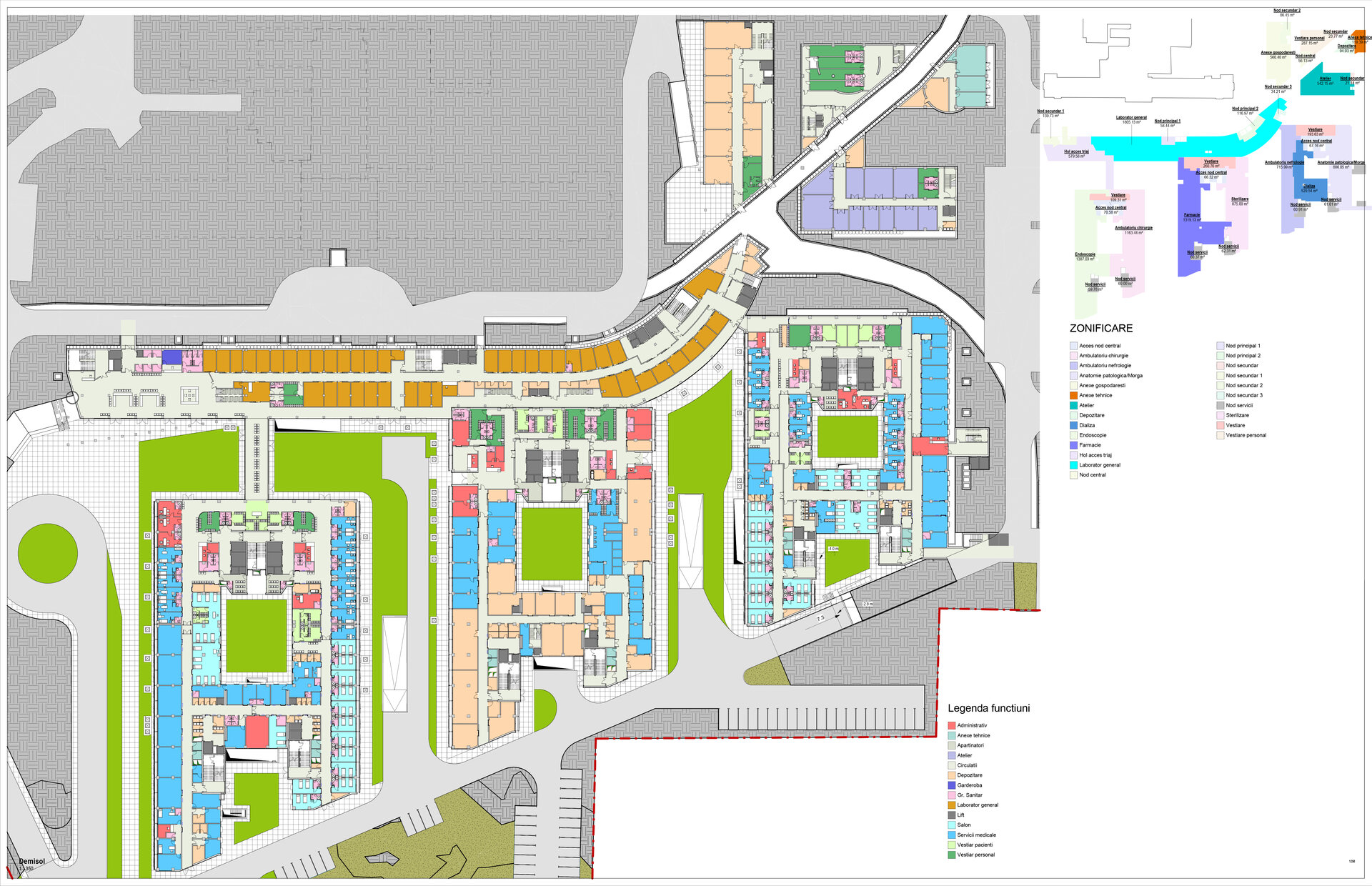Conceptul de organizare în teren al spinei (S+D+P+2E), al clinicilor de specialitate (S+D+P+6E+Et) și al corpului de administrație și învățământ (D+P+2E) preia desenul celor 10 degete alăturate ale „mâinilor vindecătoare”. Cea mai importantă dată de temă dedusă din discuțiile cu corpul medical, într-un amplu proces de „design participativ” a fost crearea unui nivel compact de spații de operații și terapie intensivă pentru toate secțiile de chirurgie mai ales de transplant hepatic, renal și transplant medular situat pe verticală între zona de spitalizare de zi, ambulatorii și zona de spitalizare continuă, la nivelul întregului etaj 2.