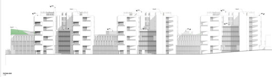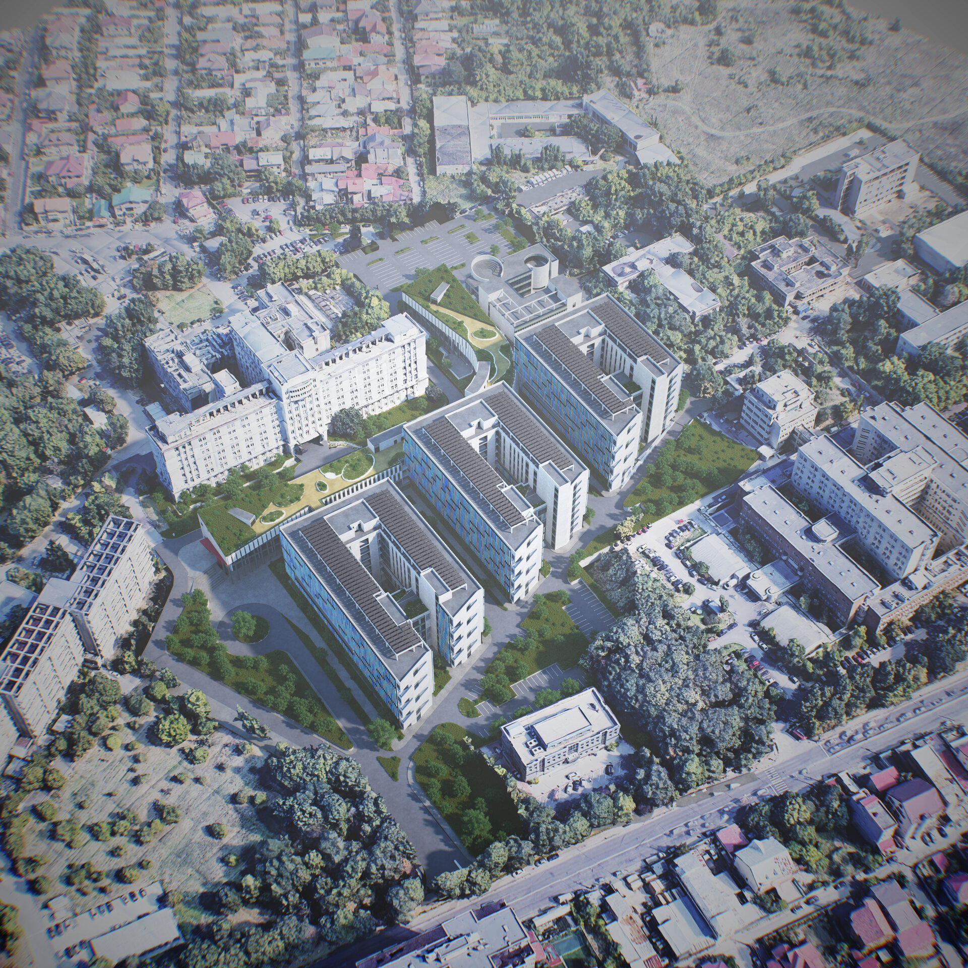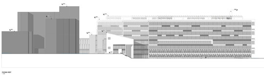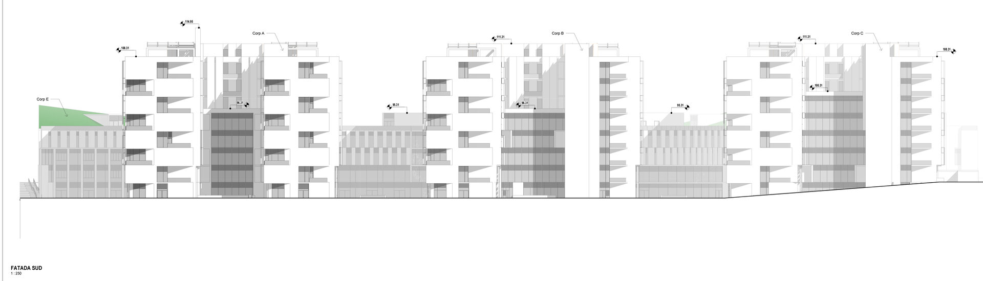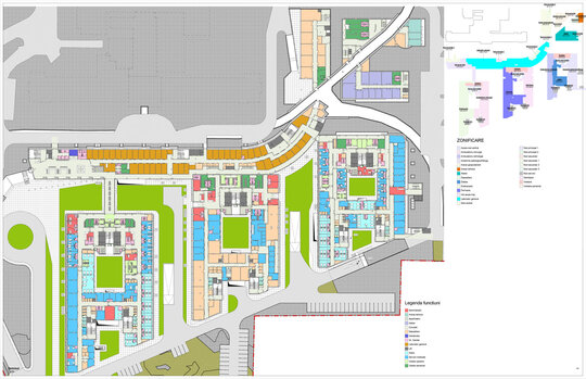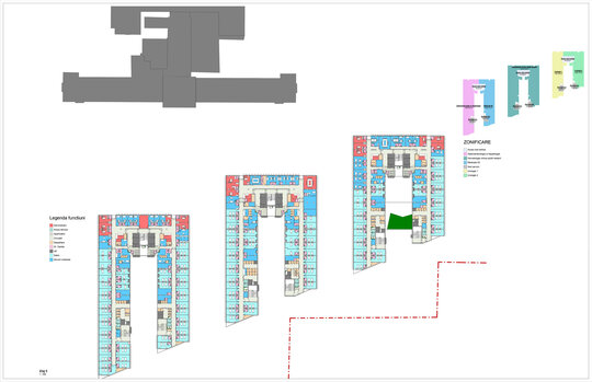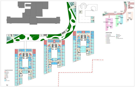 Încorsetarea amplasamentului rămas liber cât și nevoia de cooperare între secțiile medicale existente și cele viitoare ale Institutului Clinic Fundeni a condus la amplasarea Noului ansamblu în fața corpului A.