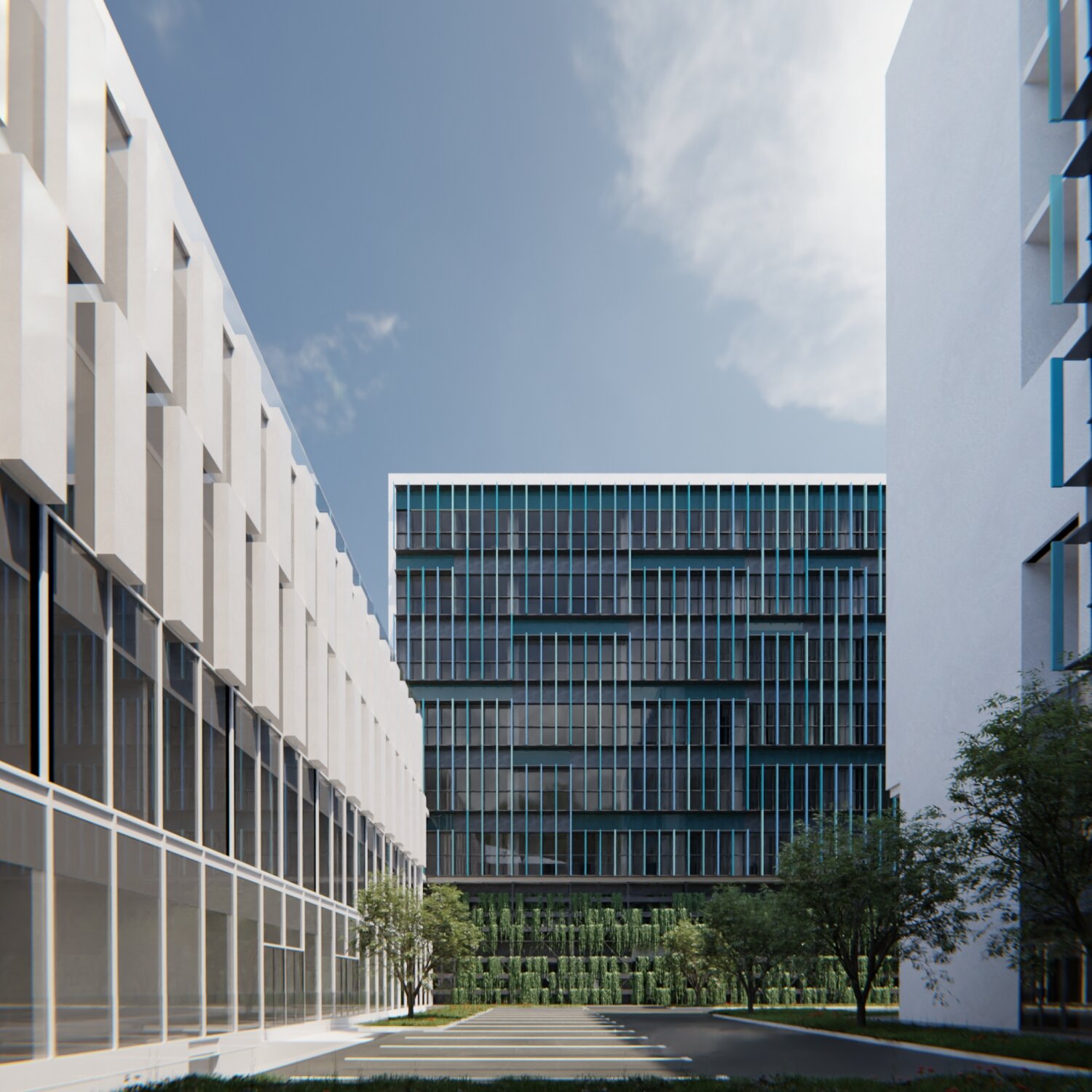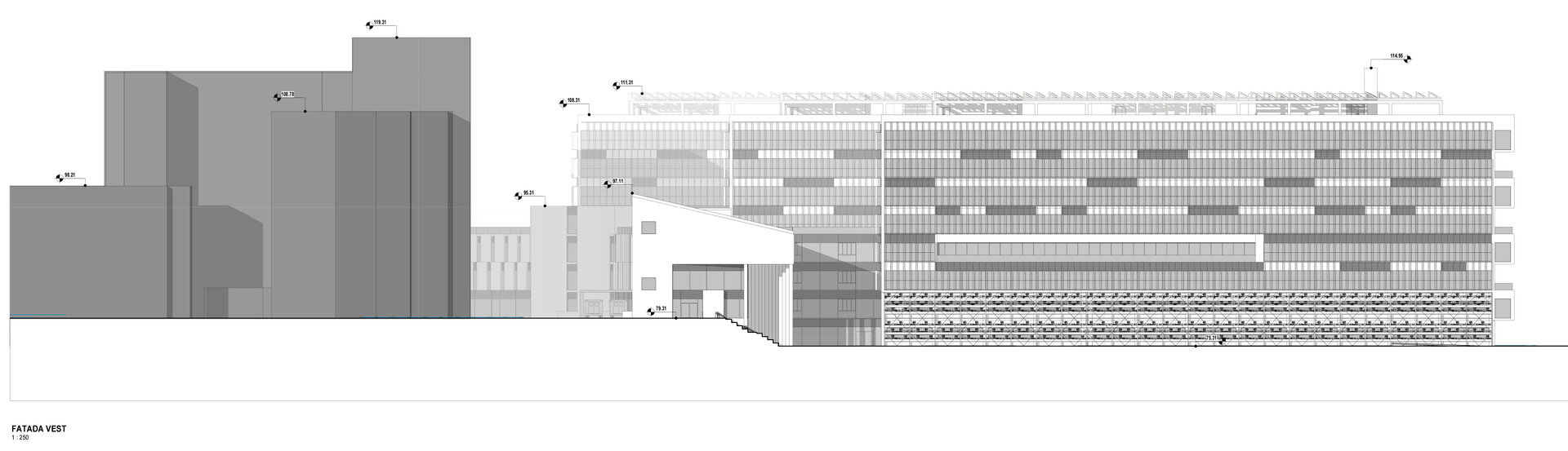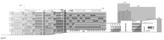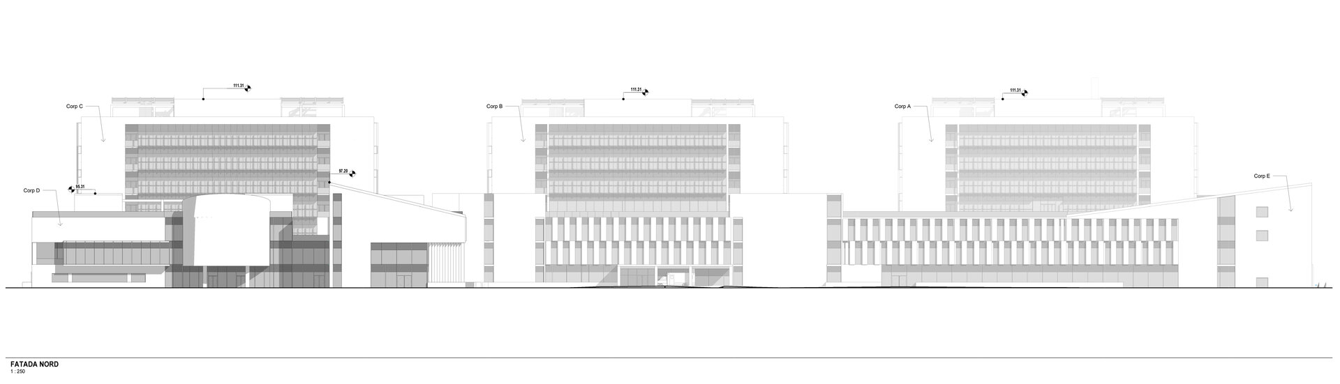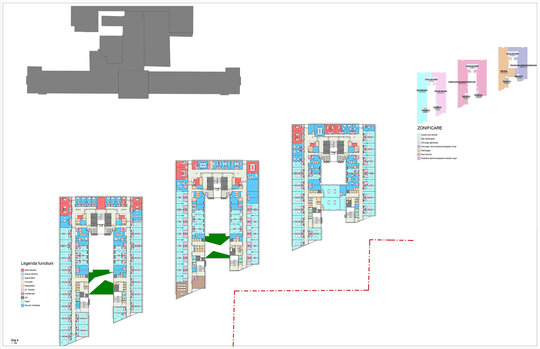 Legătura între cele 2 ansambluri medicale existent și propus ale Institutului Clinic Fundeni se face prin intermediul spinei de servicii, de urgență, de investigații și ambulatoriu (S+D+P+2E) care învăluie ocolind corpul A preluând cele 2 accese principale dinspre Șoseaua Fundeni și strada Sportului.