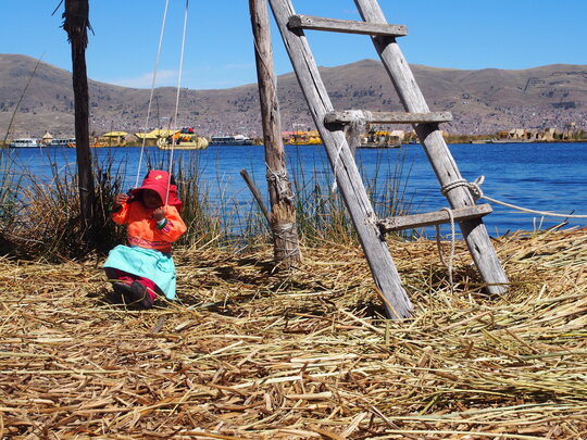 5 – 2016, Un copil jucându-se la soare pe una dintre insulele plutitoare ale populației Uros de pe Lacul Titicaca, Bolivia