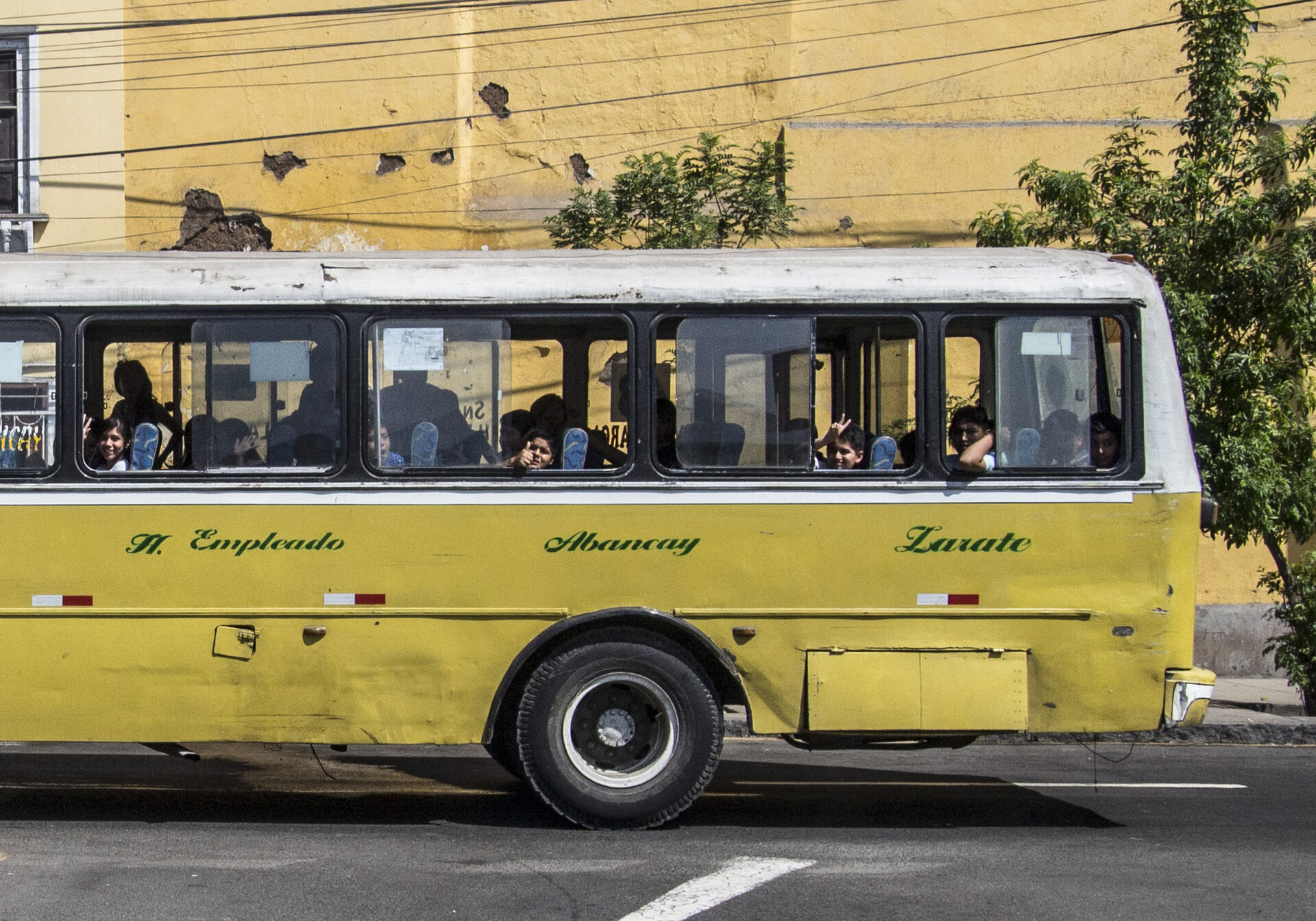 6 – 2016, Copii în autobuzul școlar salutând prietenește pe o stradă, Buenos Aires, Argentina