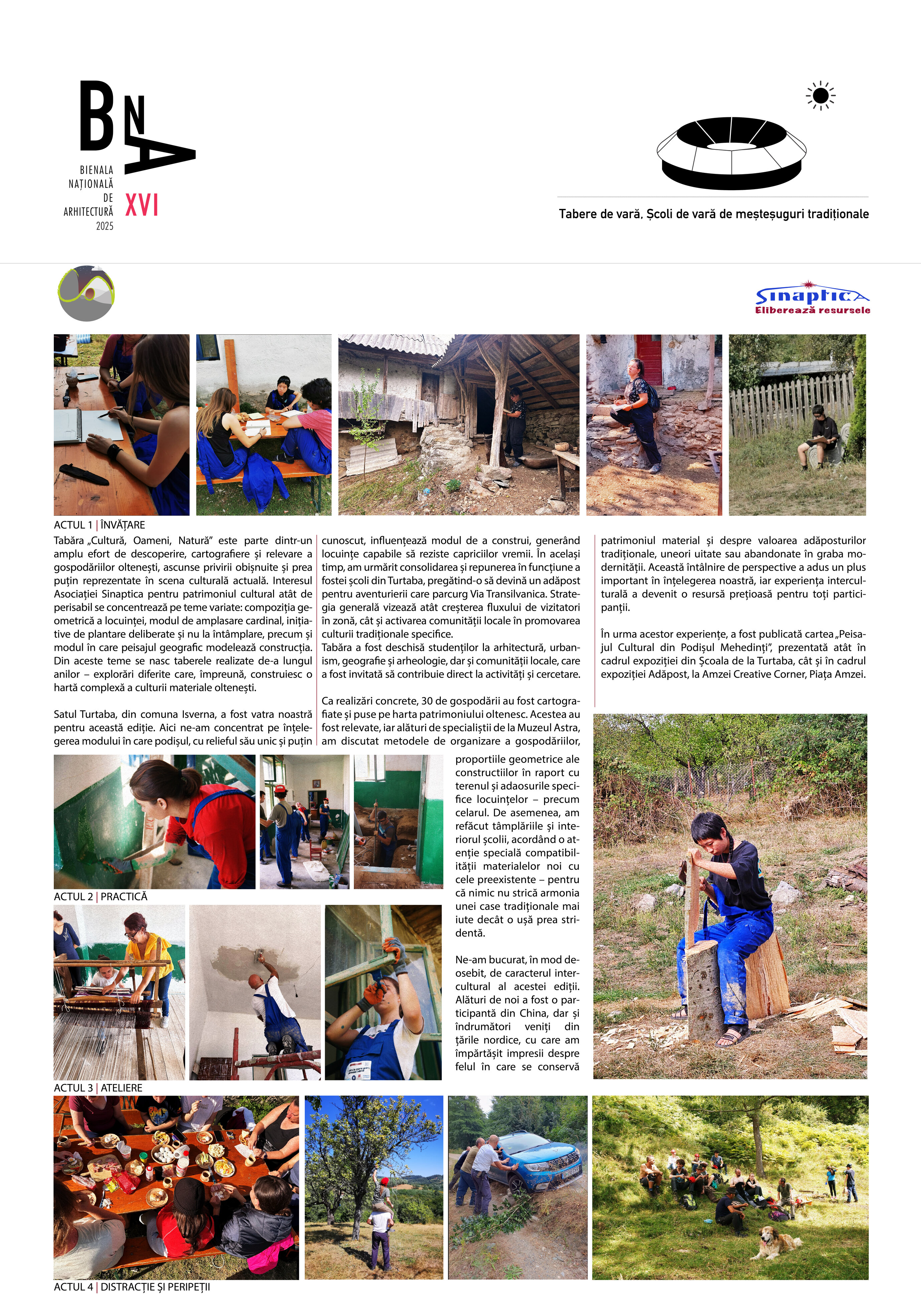 Interesul Asociației Sinaptica pentru patrimoniul cultural atât de perisabil se concentrează pe teme variate: compoziția geometrică a locuinței, modul de amplasare cardinal, inițiative de plantare deliberate și nu la întâmplare, precum și modul în care peisajul geografic modelează construcția. Din aceste teme se nasc taberele realizate de-a lungul anilor – explorări diferite care, împreună, construiesc o hartă complexă a culturii materiale oltenești.