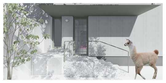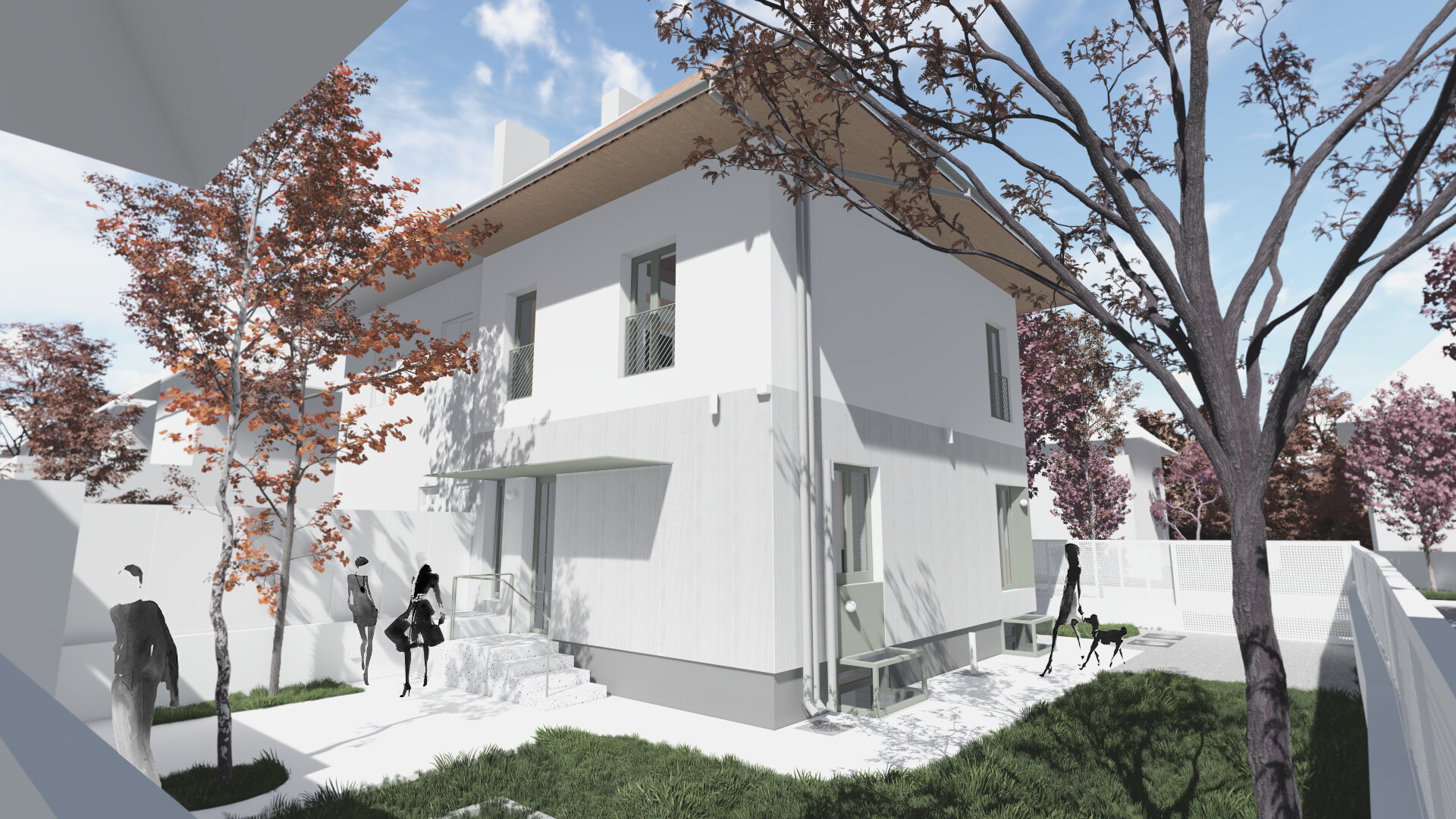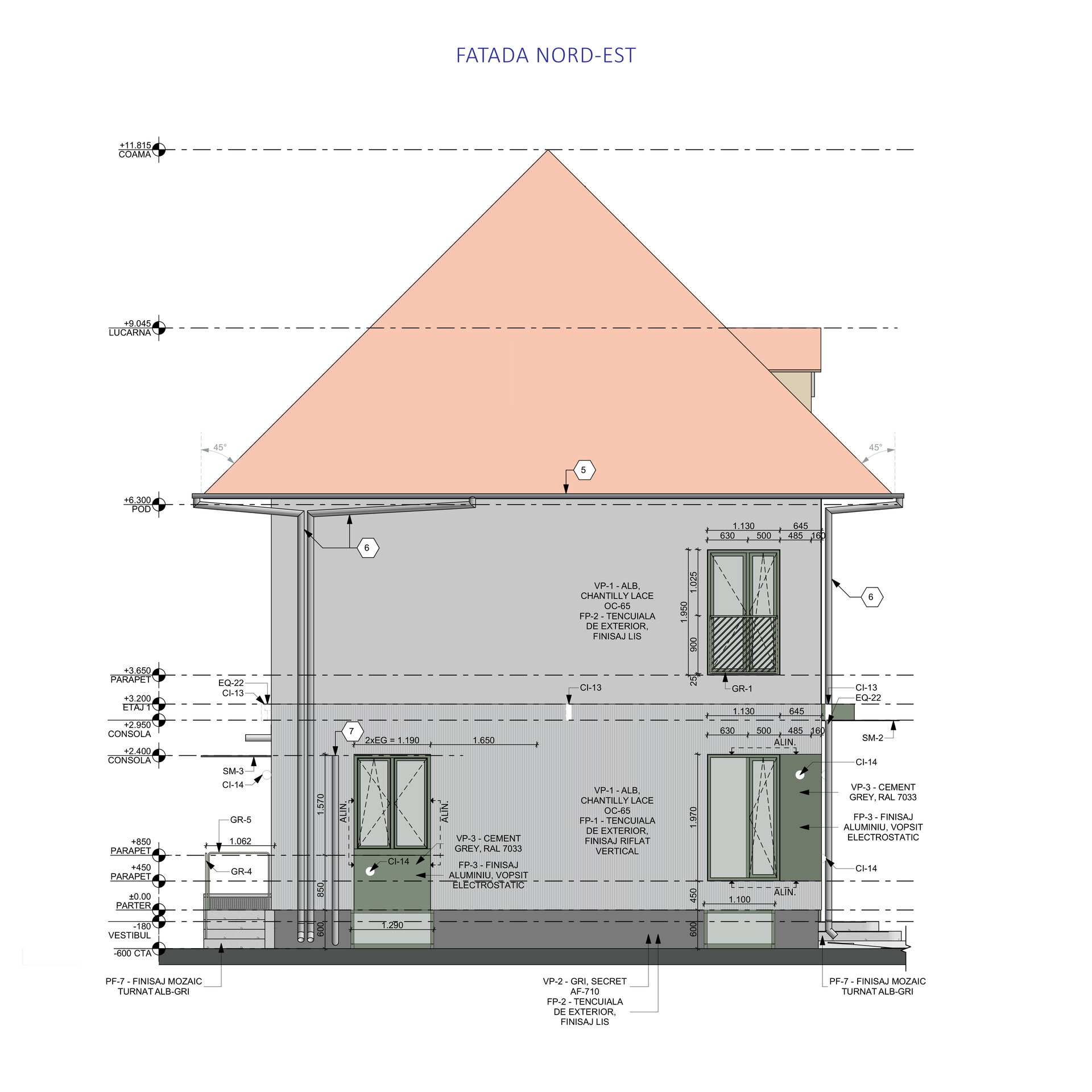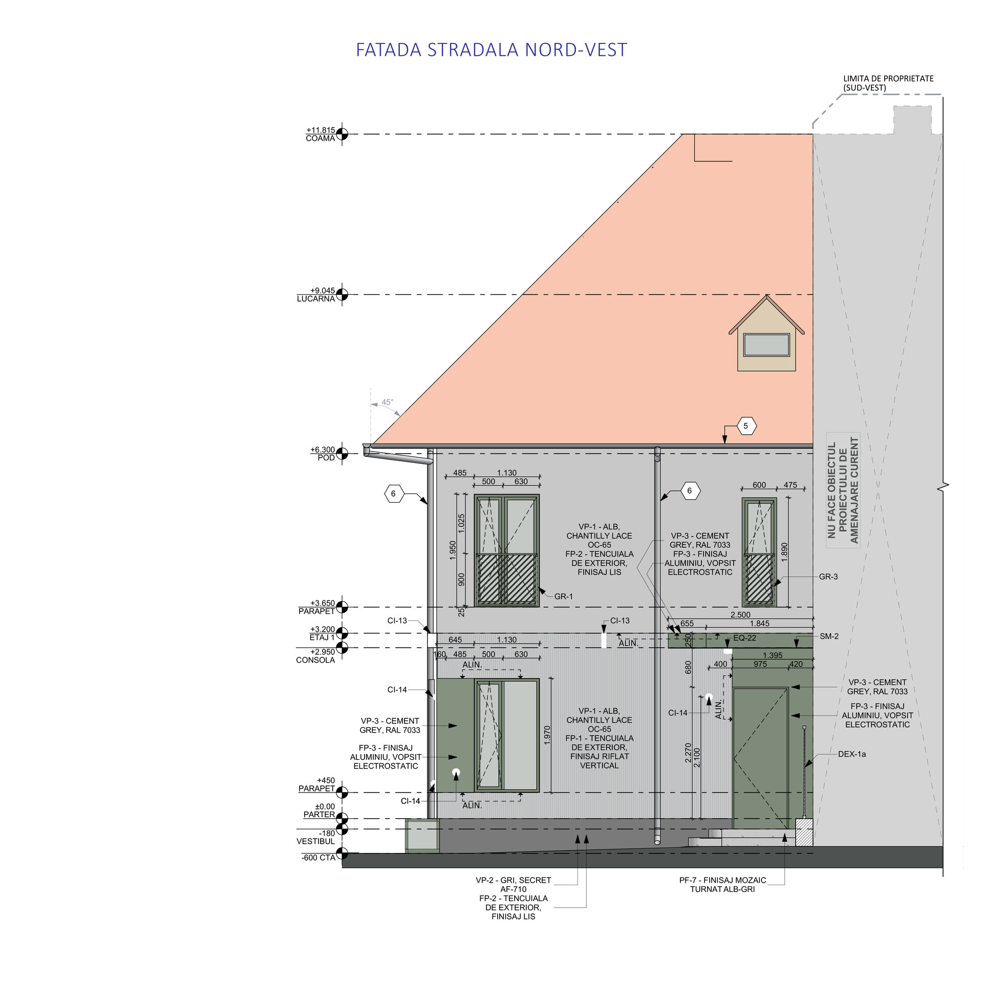 Colțul de Nord al imobilului este evidențiat prin prezența a patru ferestre suprapuse, câte două la fiecare etaj. Am perceput acest element ca o oportunitate și l-am transformat într-un accent arhitectural amplificat.