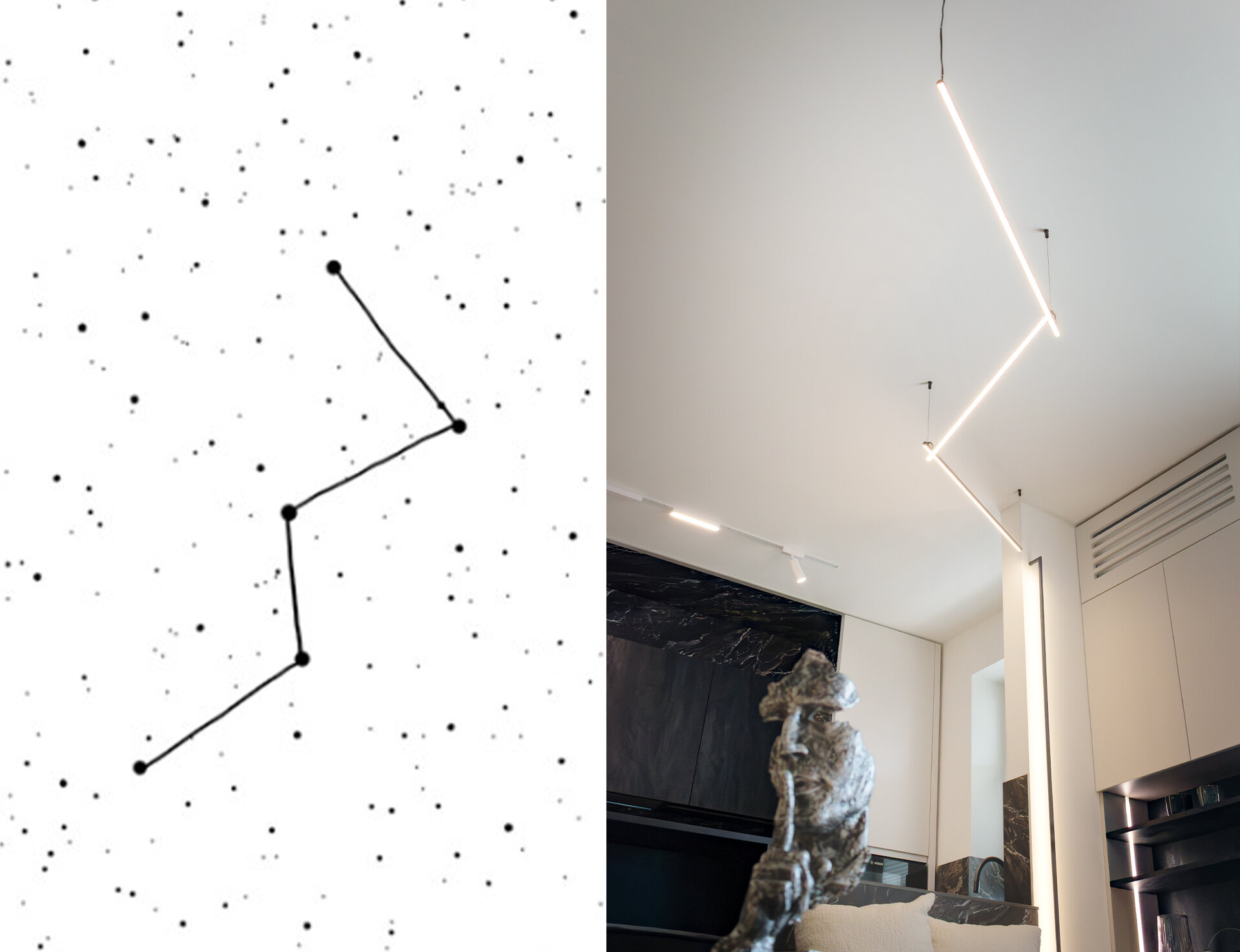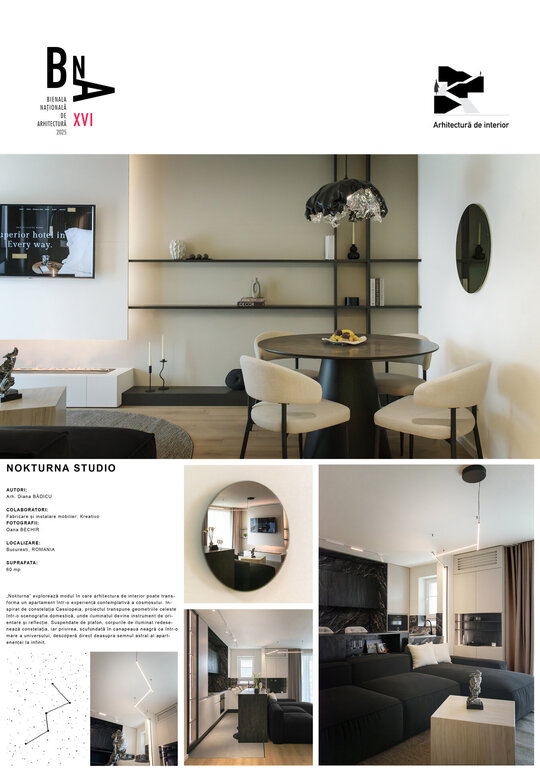 „Nokturna” explorează modul în care arhitectura de interior poate transforma un apartament într-o experiență contemplativă a cosmosului. Inspirat de constelația Cassiopeia, proiectul transpune geometriile celeste într-o scenografie domestică, unde iluminatul devine instrument de orientare și reflecție. Suspendate de plafon, corpurile de iluminat redesenează constelația, iar privirea, scufundată în canapeaua neagră ca într-o mare a universului, descoperă direct deasupra semnul astral al apartenenței la infinit.