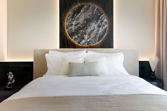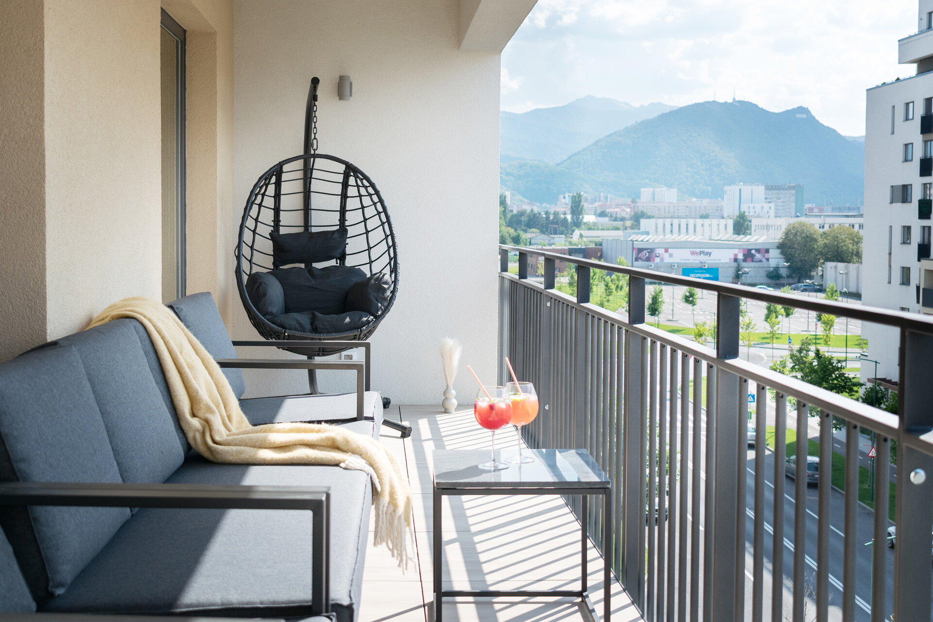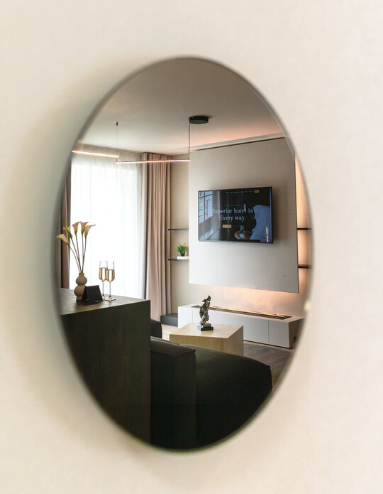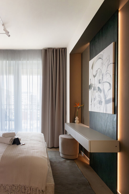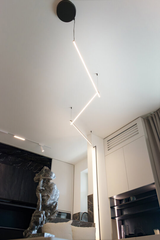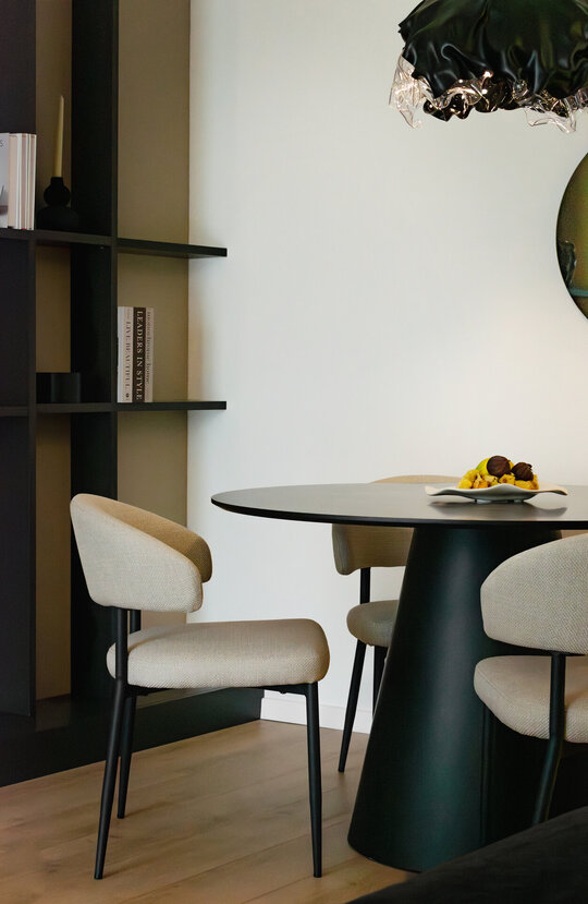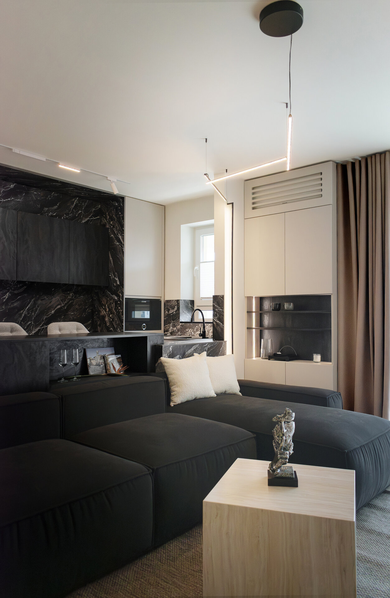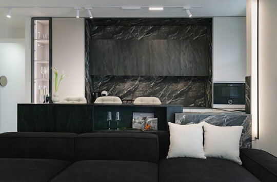 Mobilierul este redus la esențial și devine parte din scenografie: canapeaua neagră, masivă, este centrul gravitațional al experienței, locul din care constelația devine lizibilă. Depozitările sunt integrate discret, mascate de suprafețe tratate în texturi închise și luciu controlat, pentru a nu întrerupe fluxul percepției.