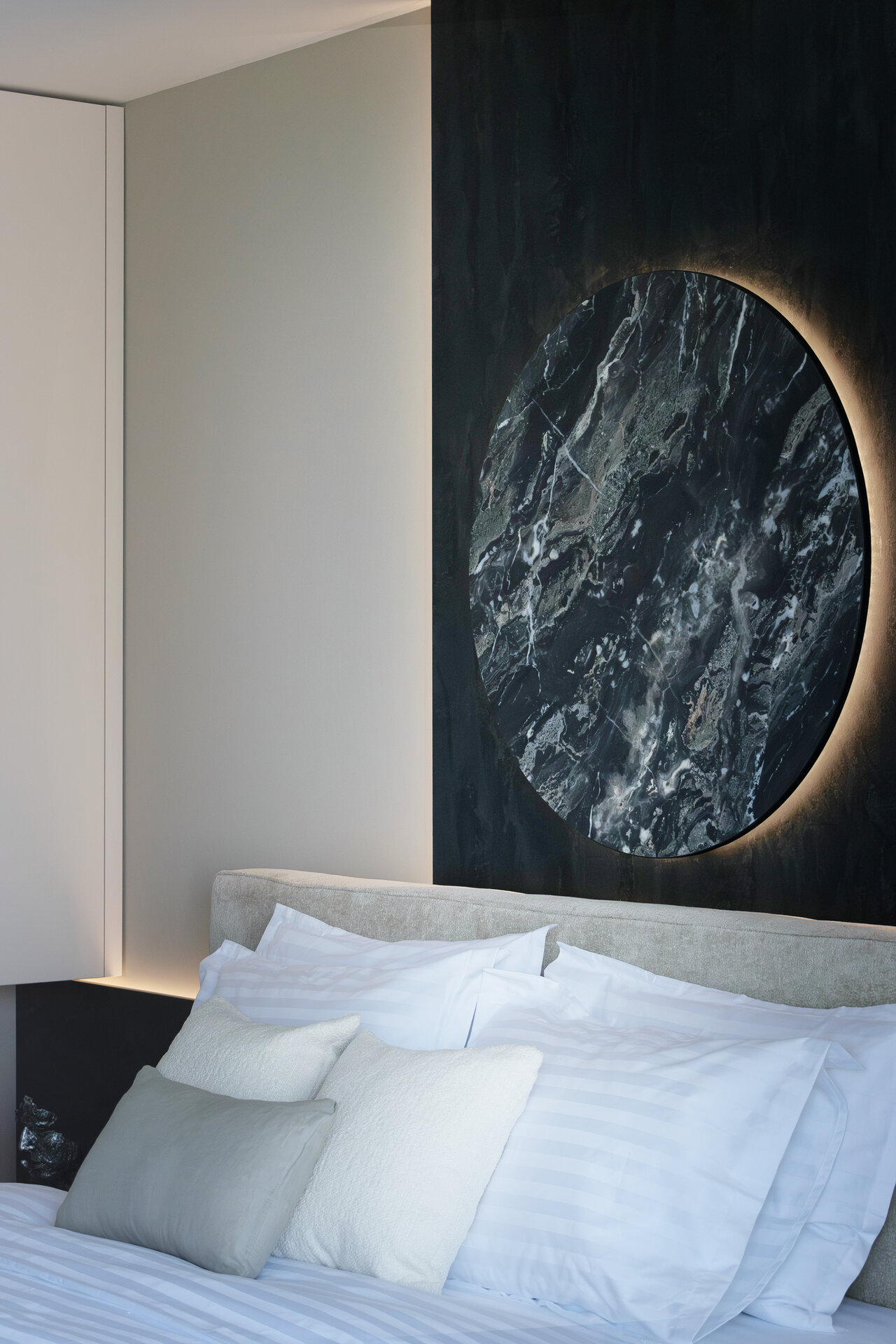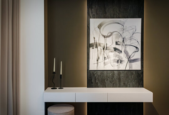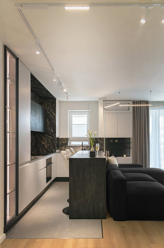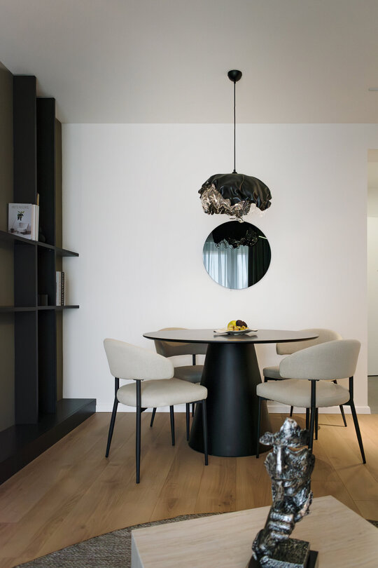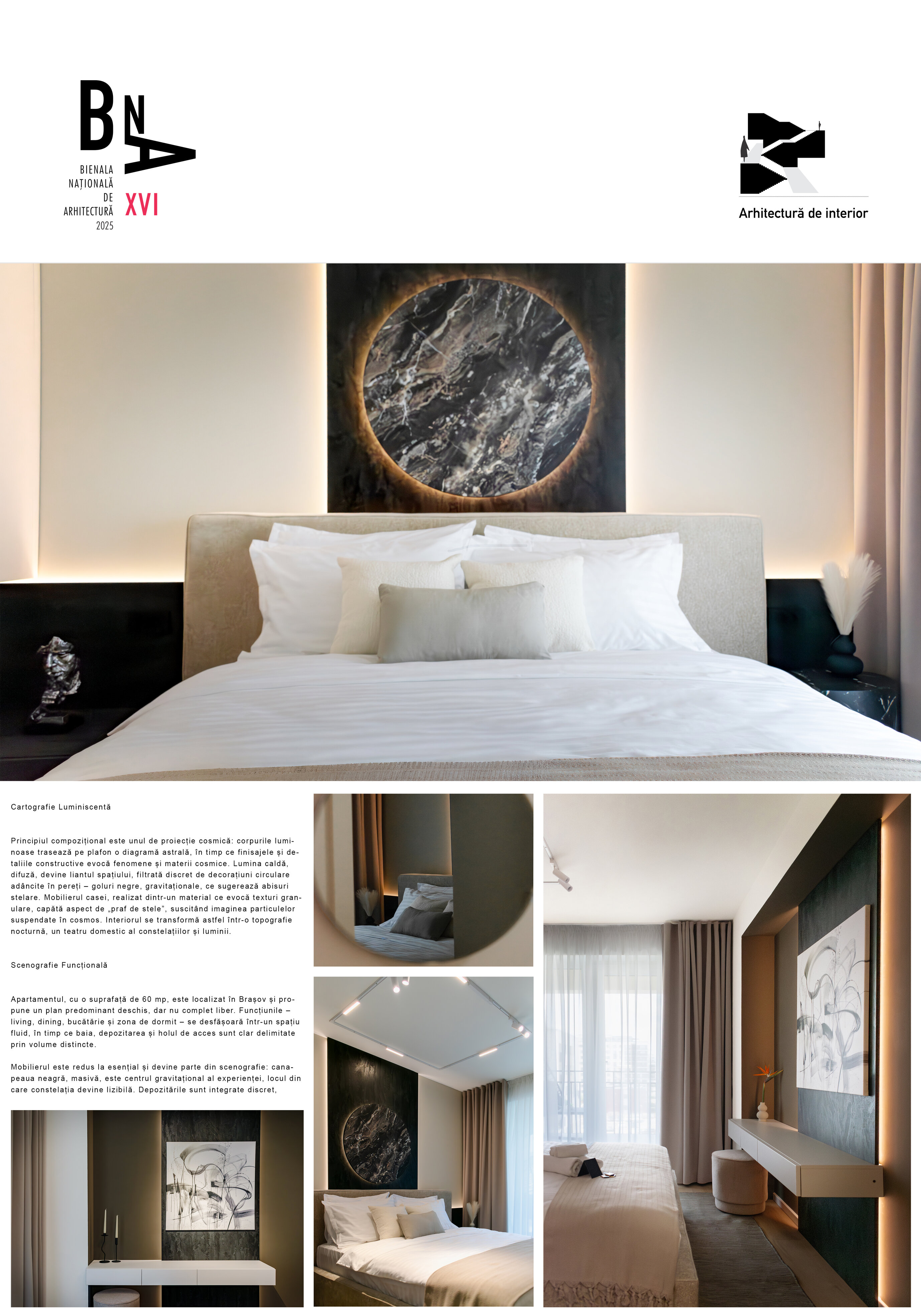 Paleta materialelor evocă materia cosmică, într-un dialog permanent între întuneric și lumină, între solid și efemer. Astfel, apartamentul devine o scenografie de contemplare nocturnă – un univers redus la scară domestică, unde locuirea se suprapune cu experiența astrală.