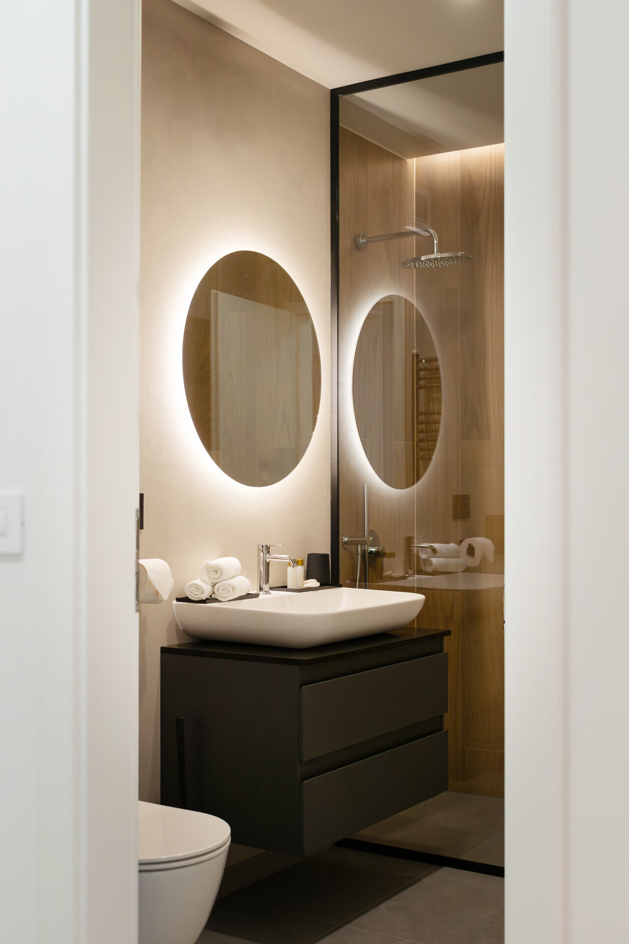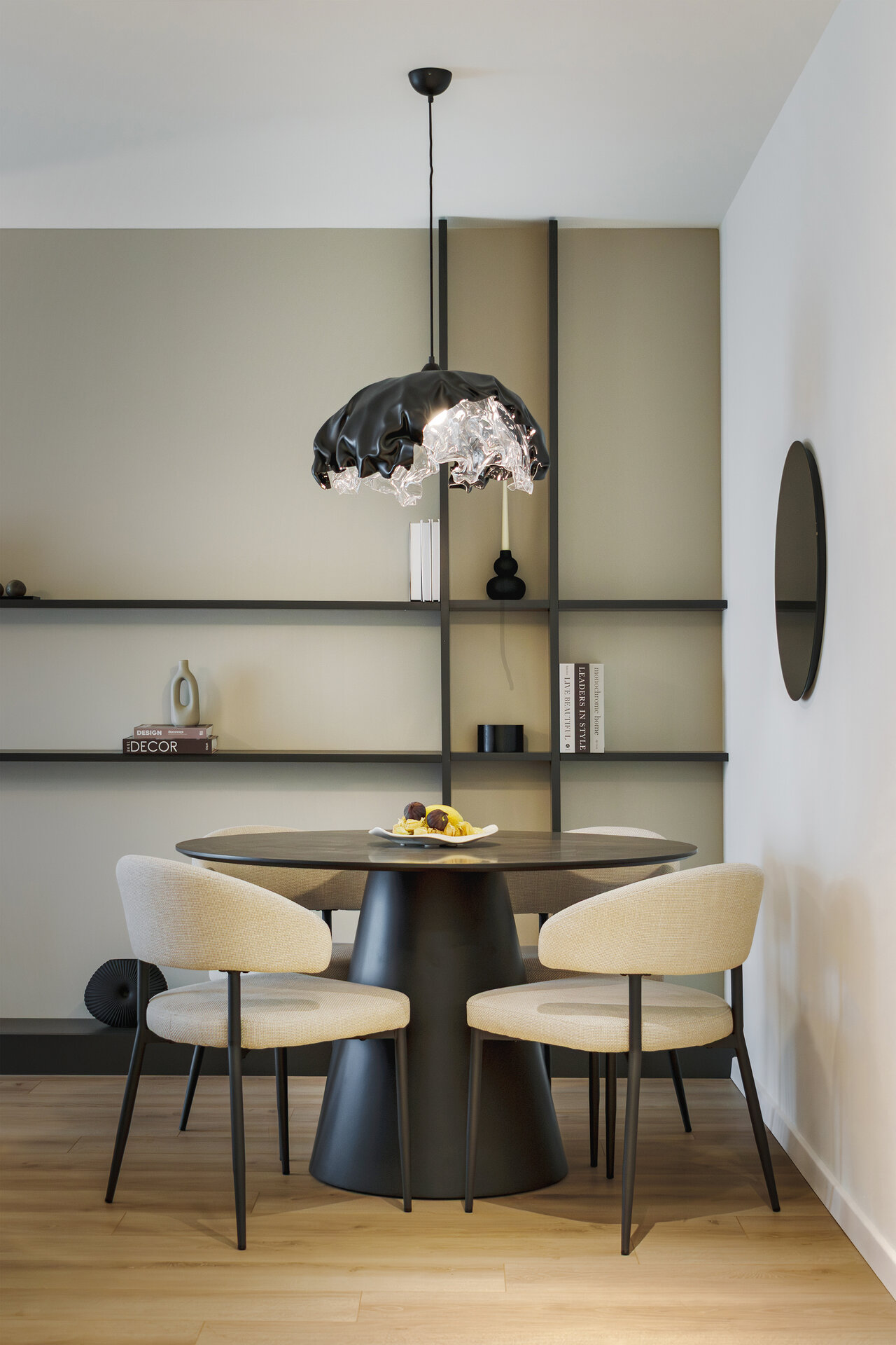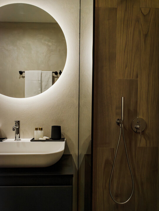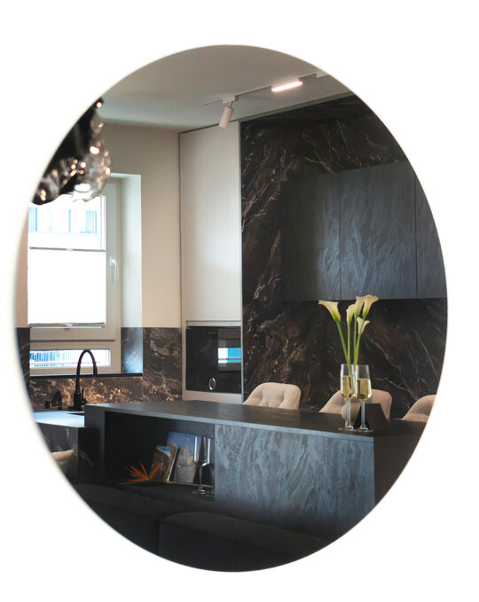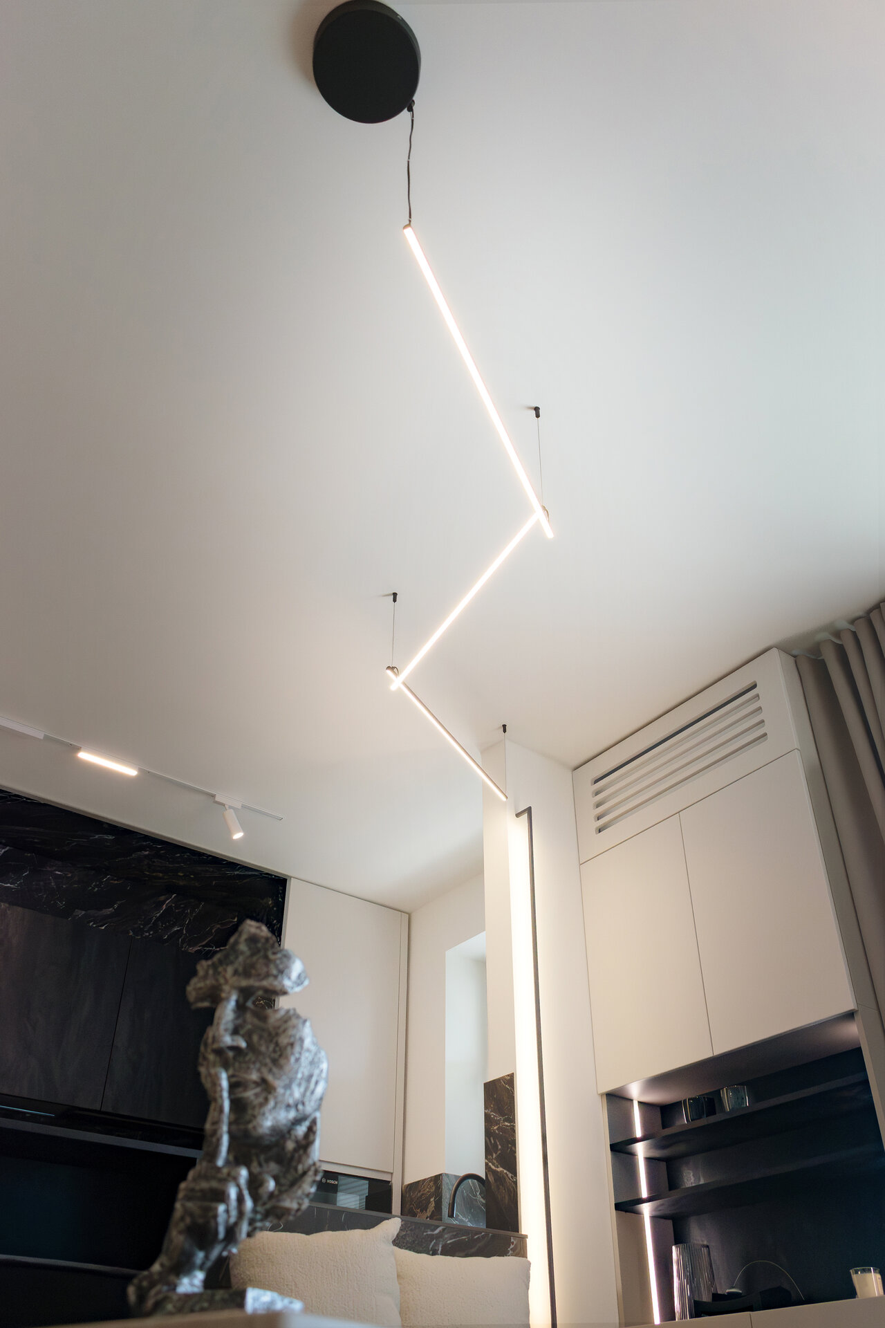 Paleta materialelor evocă materia cosmică, într-un dialog permanent între întuneric și lumină, între solid și efemer. Astfel, apartamentul devine o scenografie de contemplare nocturnă – un univers redus la scară domestică, unde locuirea se suprapune cu experiența astrală.