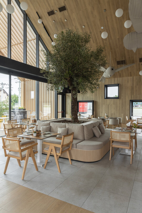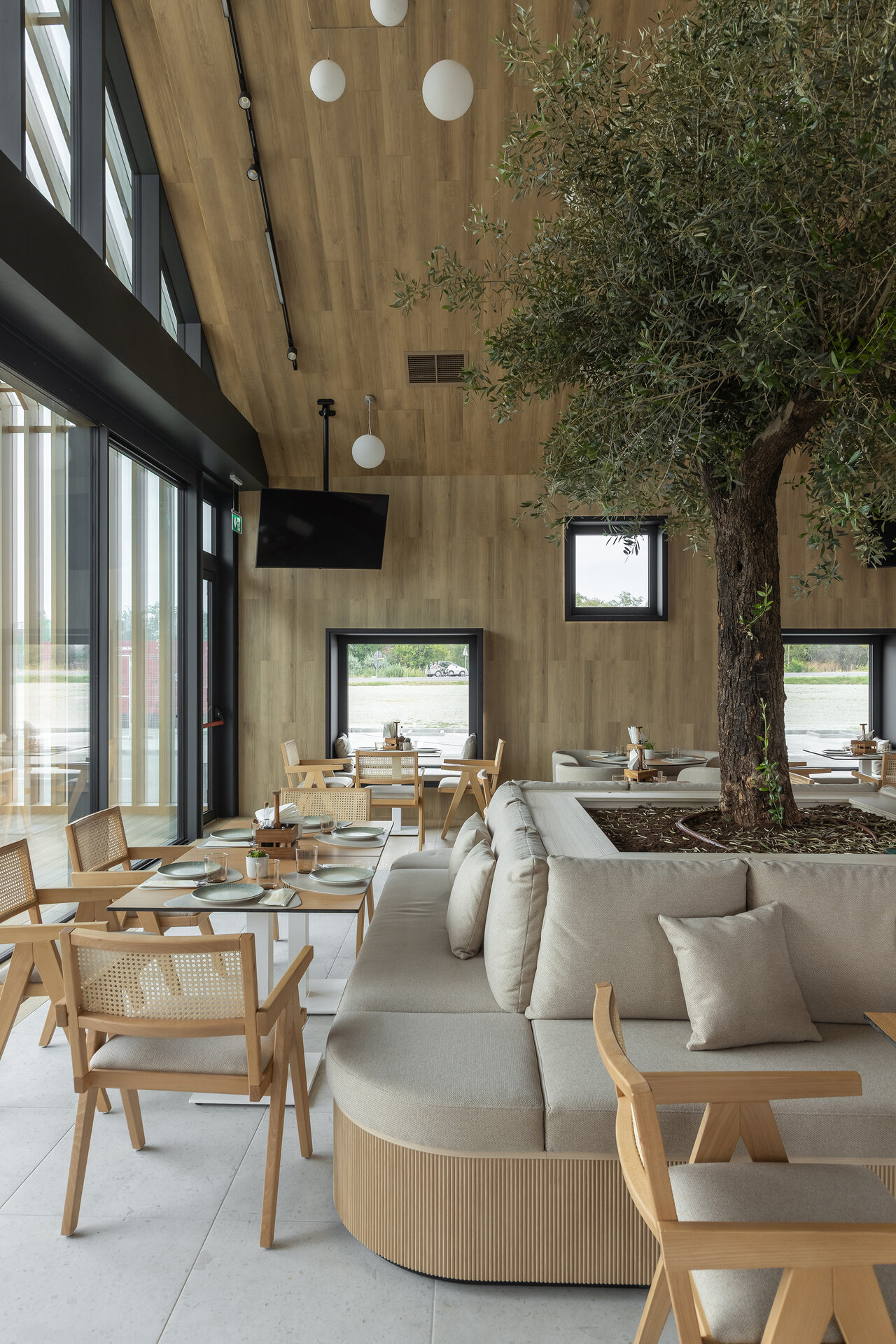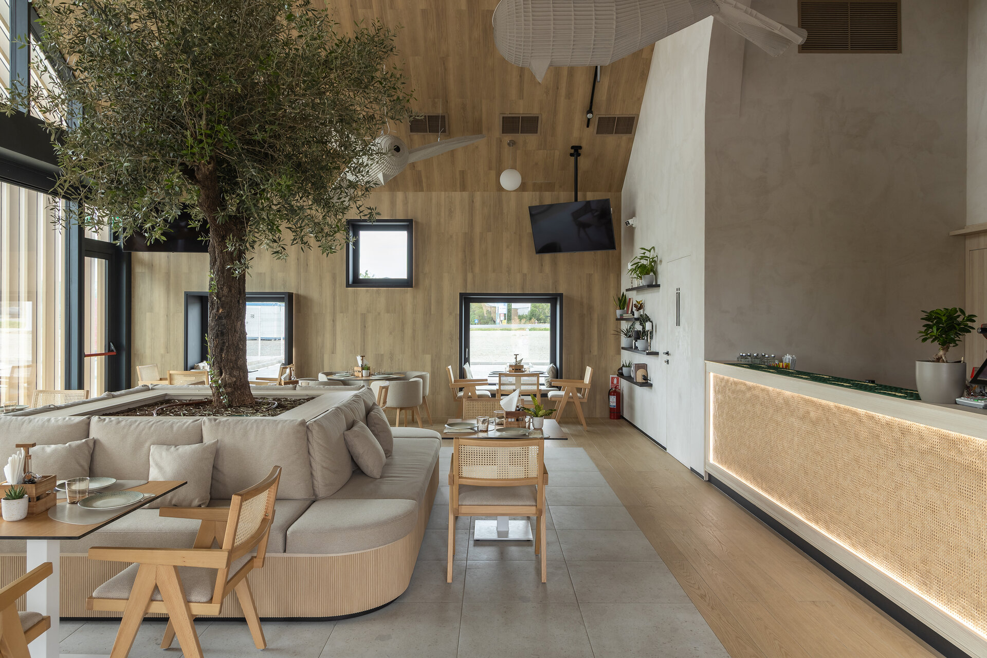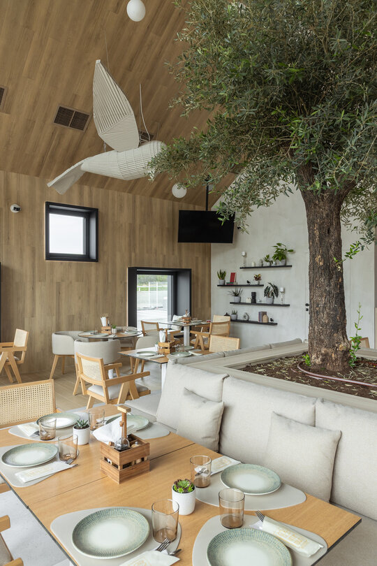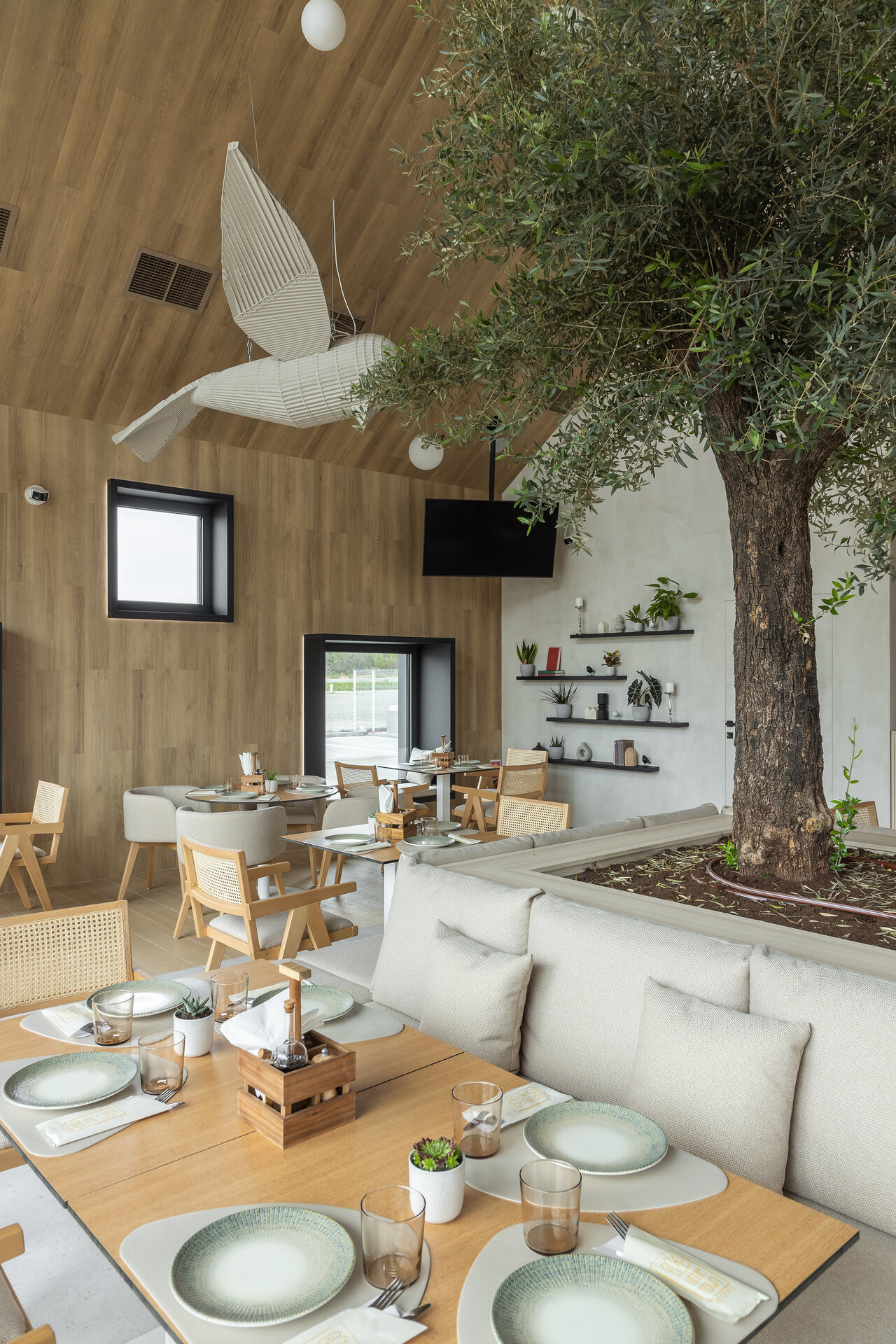 Piesa centrală a spațiului este un măslin matur, simbol al longevității și al conexiunii cu pământul, integrat în mijlocul zonei de ședere. În jurul lui, mobilierul creează un nucleu de întâlnire și socializare, accentuând legătura dintre interior și natură. Paleta cromatică se inspiră din tonurile pământului, bejuri, nuanțe de lemn și accente verzui, menită să transmită echilibru și confort.
