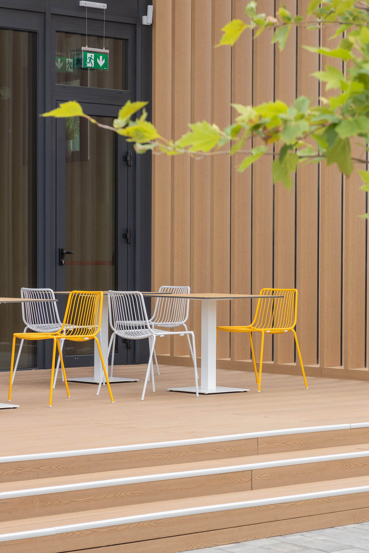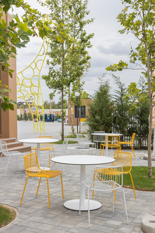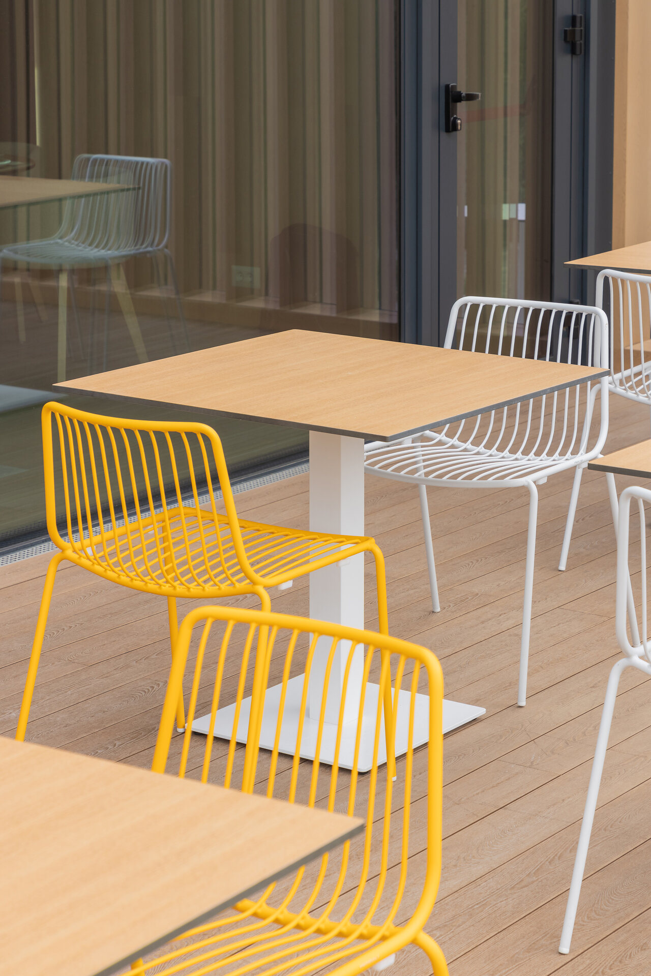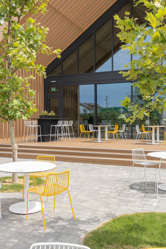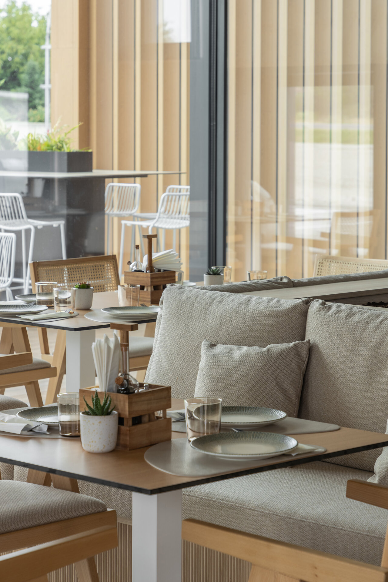 Restaurantul beneficiază și de o terasă generoasă, atât acoperită, cât și descoperită, înconjurată de vegetație abundentă, care extinde experiența spre exterior și adaugă un plus de prospețime și vitalitate.
