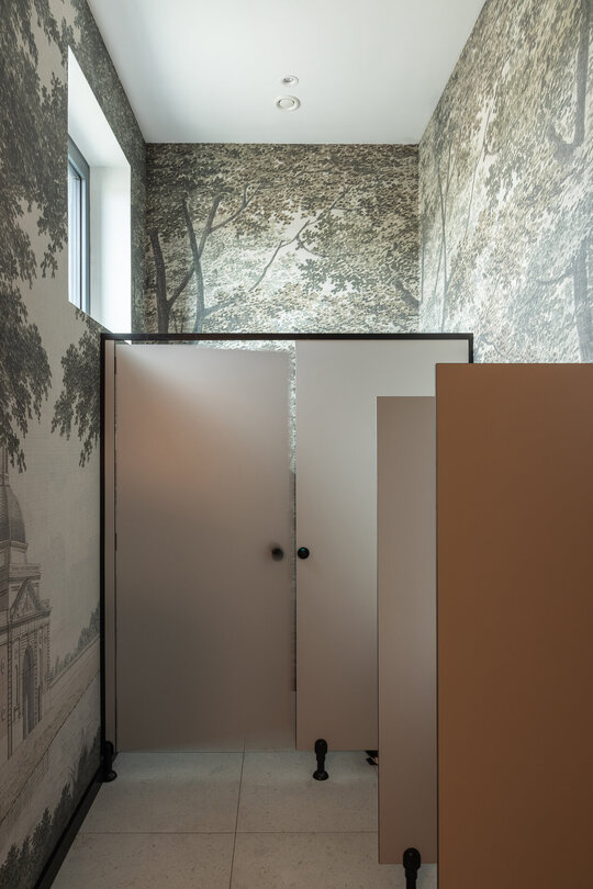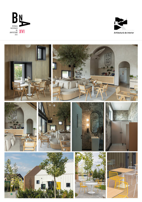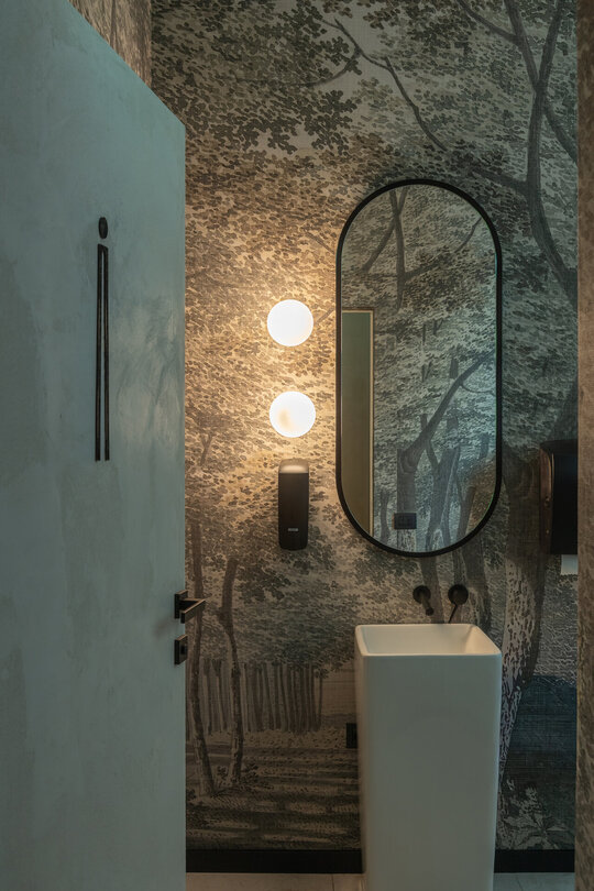 Pe tavan, păsările supradimensionate realizate prin print 3D adaugă un contrapunct poetic, dinamizând spațiul și introducând un element ludic, în timp ce plantele naturale completează subtil atmosfera. Experiența se prelungește până în spațiile adiacente, unde grupurile sanitare sunt tratate cu un tapet rezistent, cu tematică forestieră, care creează impresia unei păduri imersive.
