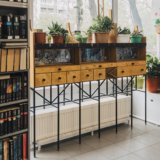 Realizat din placaj de lemn și metal, Ierbarul este pe de o parte inspirat din mobilierul tip pentru biblioteci din anii 1970, iar pe de alta încearcă să aducă în peisajul mobilierului existent al bibliotecii un design nou. Identitatea vizuală este accentuată și de scrisul decupat din platbanda de metal de la partea superioară a mobilierului, realizat din același font ca literele volumetrice din anii 1980 de pe fațada bibliotecii, printre puținele care s-au mai păstrat. Construcția obiectului a fost executată de o echipă de arhitecți transformați în tâmplari care a gândit creativ toate detaliile.