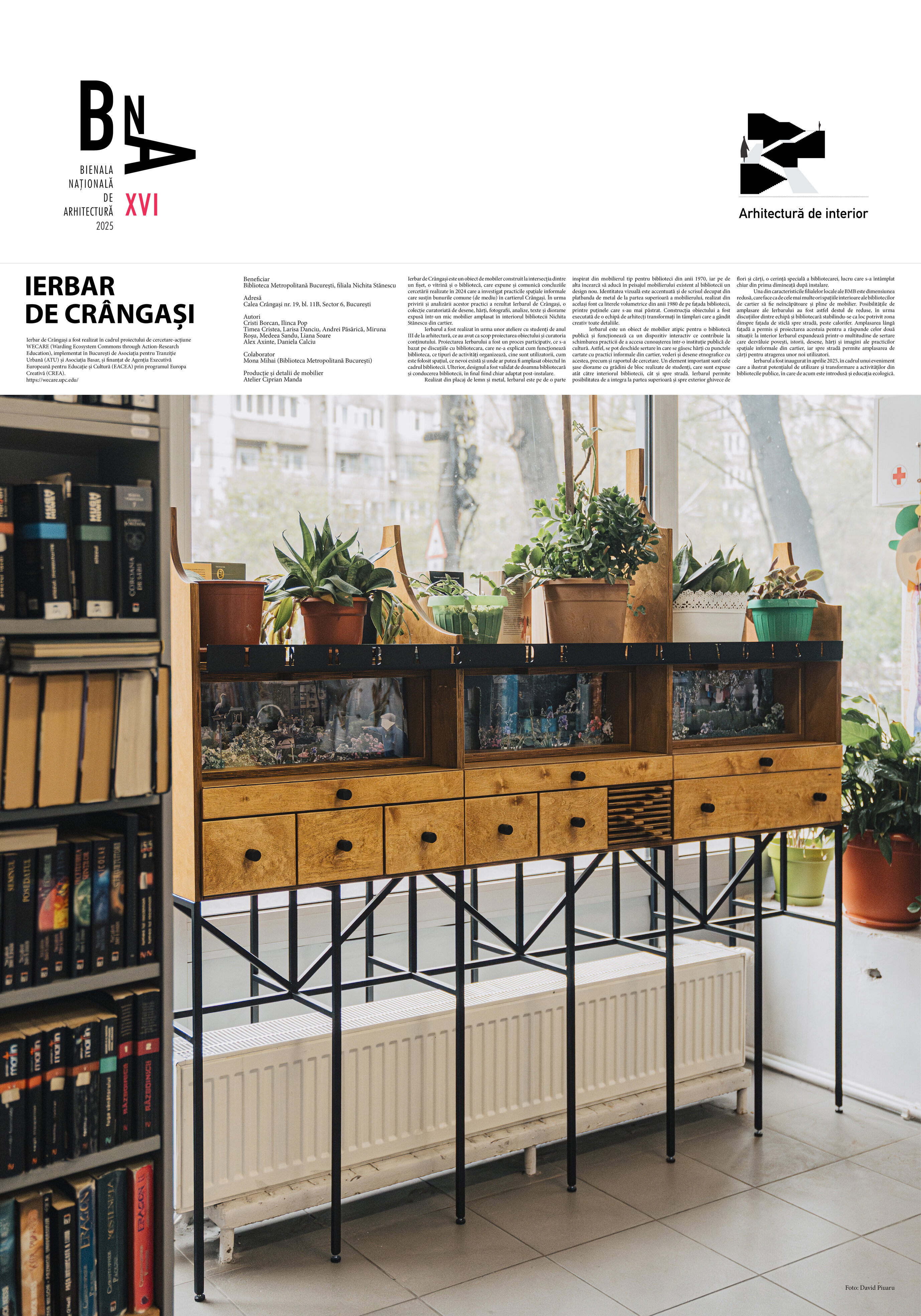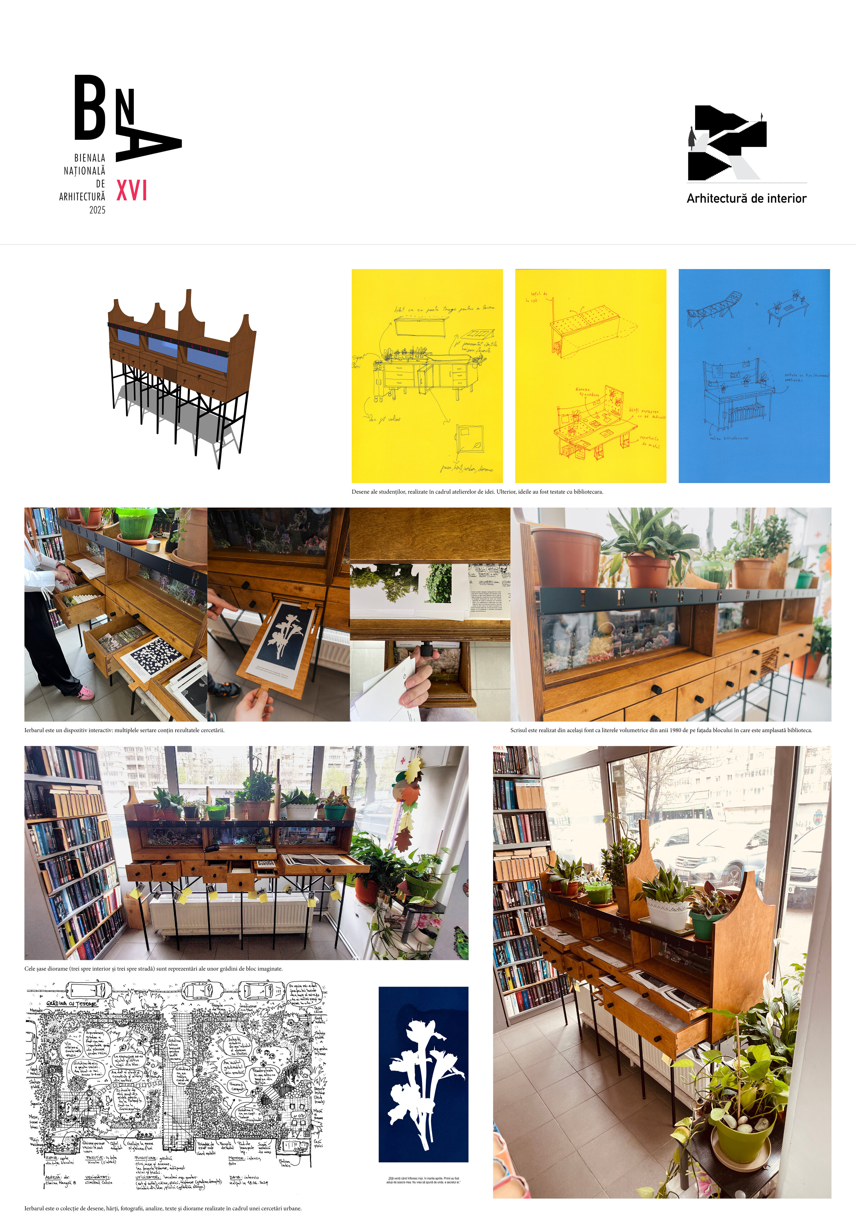 Ierbarul a fost realizat în urma unor ateliere cu studenți de anul III de la arhitectură, ce au avut ca scop proiectarea obiectului și curatoria conținutului. Proiectarea Ierbarului a fost un proces participativ, ce s-a bazat pe discuțiile cu bibliotecara, care ne-a explicat cum funcționează biblioteca, ce tipuri de activități organizează, cine sunt utilizatorii, cum este folosit spațiul, ce nevoi există și unde ar putea fi amplasat obiectul în cadrul bibliotecii. Ulterior, designul a fost validat de doamna bibliotecară și conducerea bibliotecii, în final fiind chiar adaptat post-instalare.