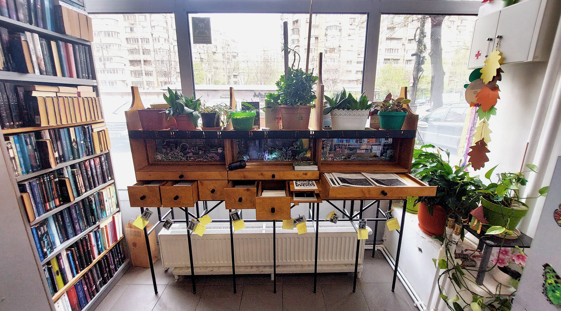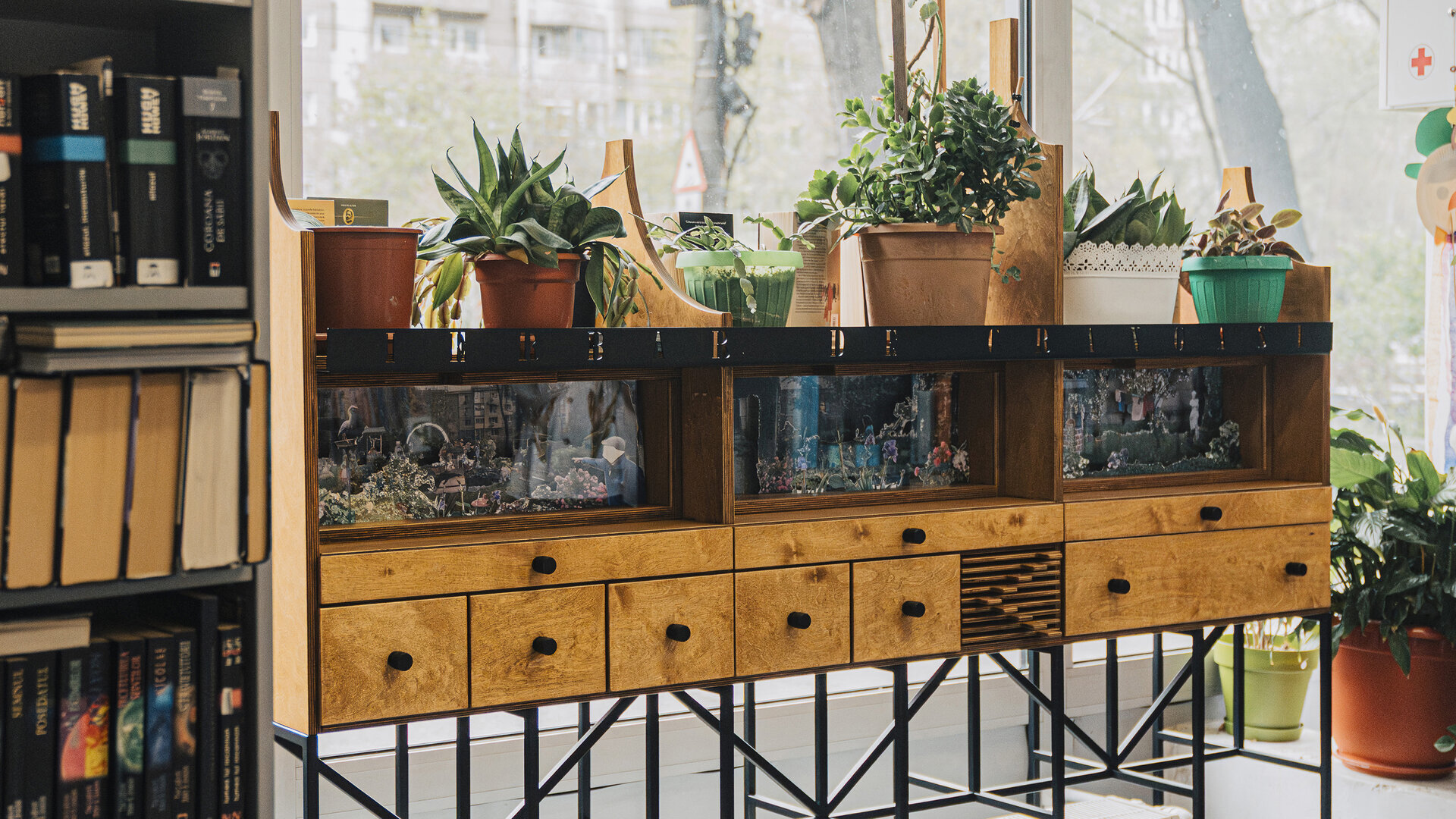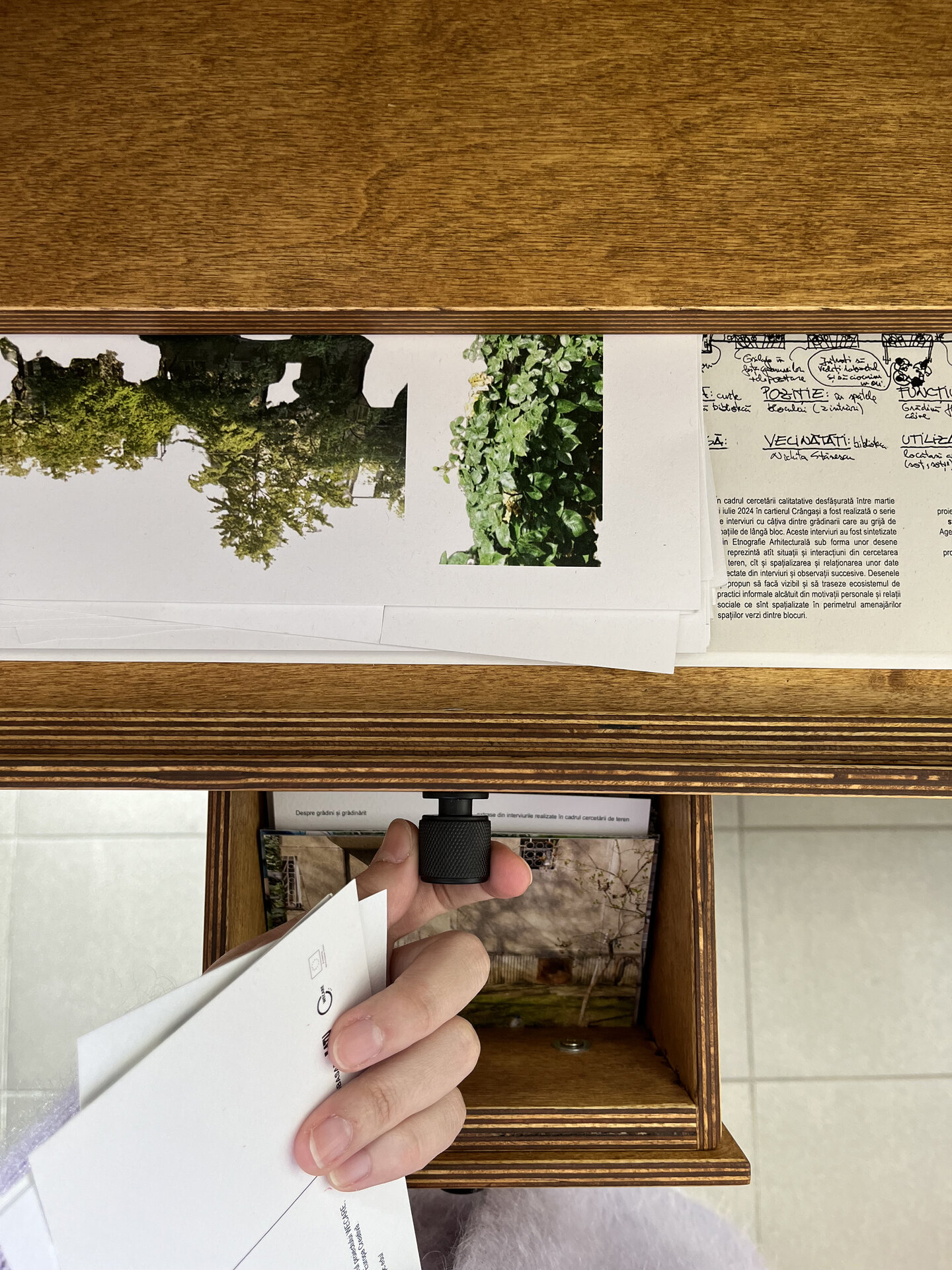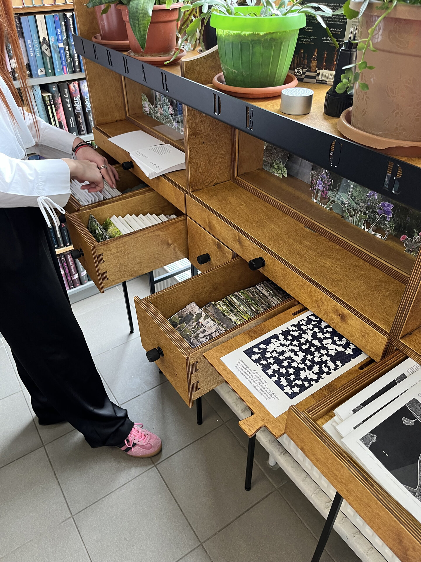 Ierbarul este un obiect de mobilier atipic pentru o bibliotecă publică și funcționează ca un dispozitiv interactiv ce contribuie la schimbarea practicii de a accesa cunoașterea într-o instituție publică de cultură. Astfel, se pot deschide sertare în care se găsesc hărți cu punctele cartate cu practici informale din cartier, vederi și desene etnografice cu acestea, precum și raportul de cercetare. Un element important sunt cele șase diorame cu grădini de bloc realizate de studenți, care sunt expuse atât către interiorul bibliotecii, cât și spre stradă. Ierbarul permite posibilitatea de a integra la partea superioară și spre exterior ghivece de flori și cărți, o cerință specială a bibliotecarei, lucru care s-a întâmplat chiar din prima dimineață după instalare.