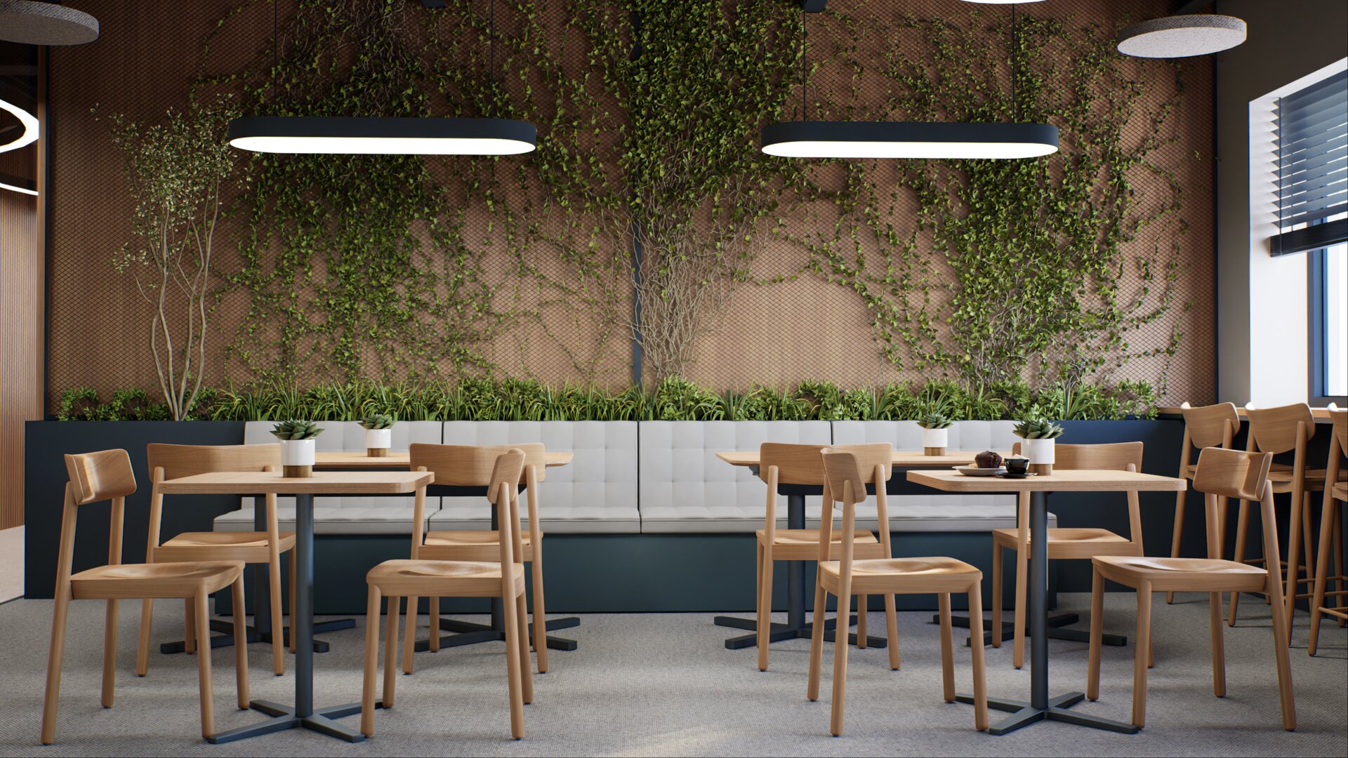 Amenajarea îmbină echilibrat natura și tehnologia, materialele tactile și suprafețele moderne, lumina naturală și scenografia ambientală. Vegetația reală este nu doar un element decorativ, ci parte activă din experiența spațiului, contribuind la o atmosferă reconfortantă, calmă și conectată cu ritmurile naturale.