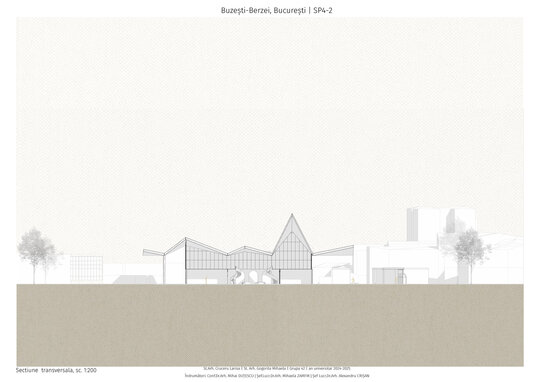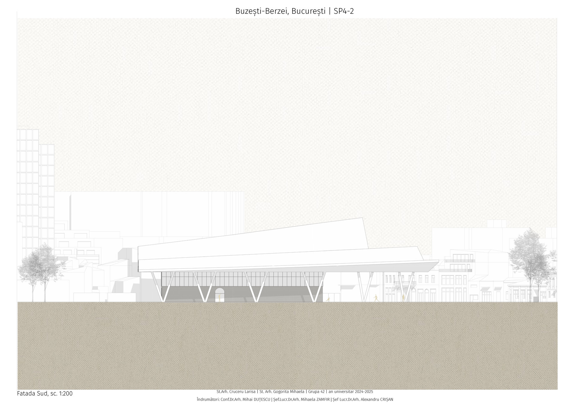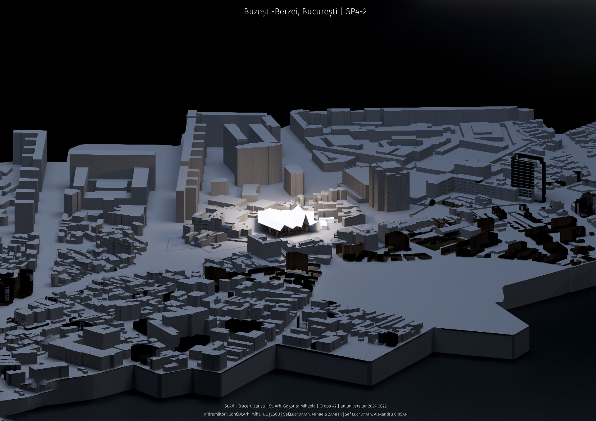 Dinspre Buzești spre Berzei, piața se înscrie într-un fundal dominat de arhitectura tradițională, menținând coerența vizuală și memoria locului. Privind invers, dinspre Berzei spre Buzești, intervenția se așază firesc într-un peisaj marcat de turnurile de birouri, propunând un dialog echilibrat între vechi și nou. Reconfigurarea zonei ca spațiu pietonal permeabil, articulat prin piațete, zone verzi și mobilier urban, întărește caracterul comunitar și susține mobilitatea sustenabilă prin integrarea nodurilor de transport public.