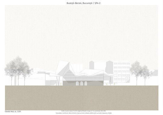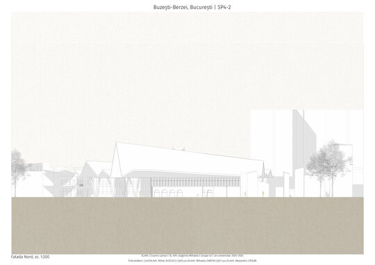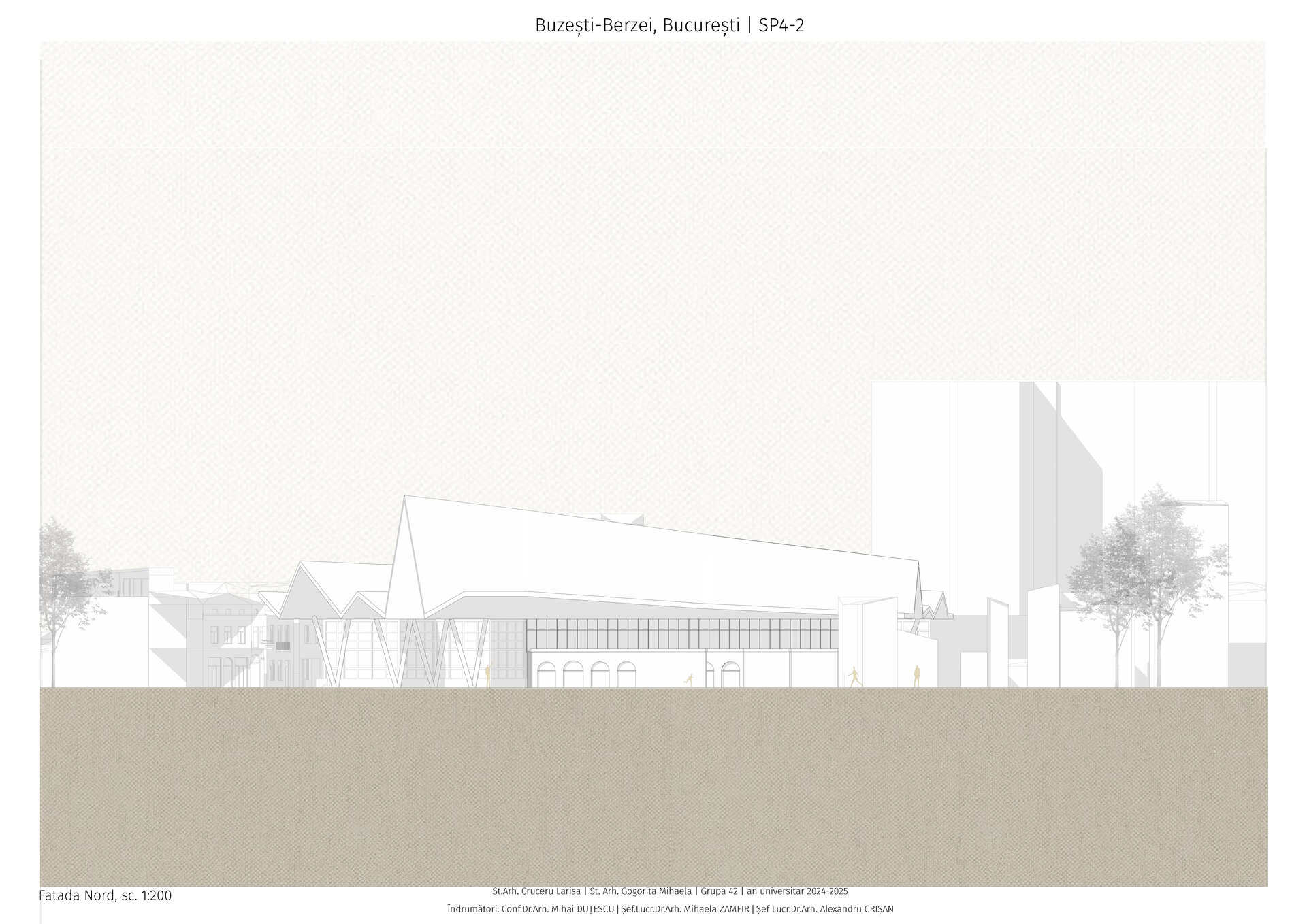 Întreaga compoziție este articulată de o învelitoare care urmărește linia locuințelor adiacente, crescând progresiv spre bulevard. Această gestică volumetrică creează o tranziție naturală între scara mică a caselor tradiționale și dimensiunea amplă a arterei moderne. Fațada tratată în cărămidă evocă estetica halei Matache, reintroducând un limbaj material recognoscibil și oferind noii intervenții un strat de continuitate vizuală și simbolică.