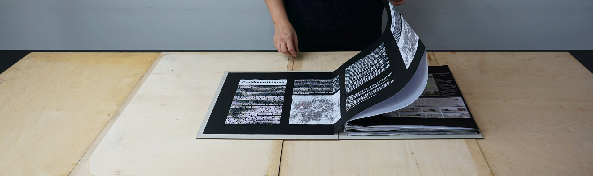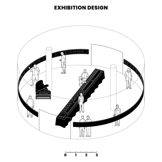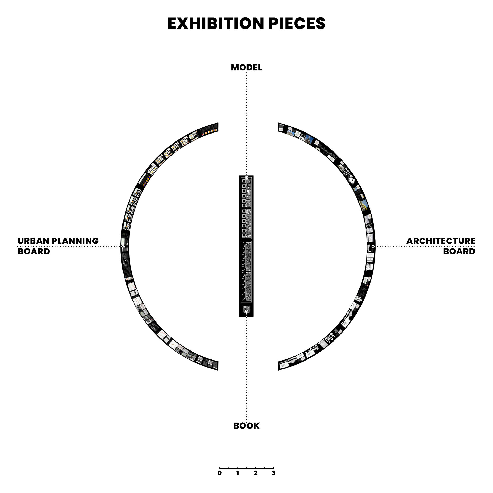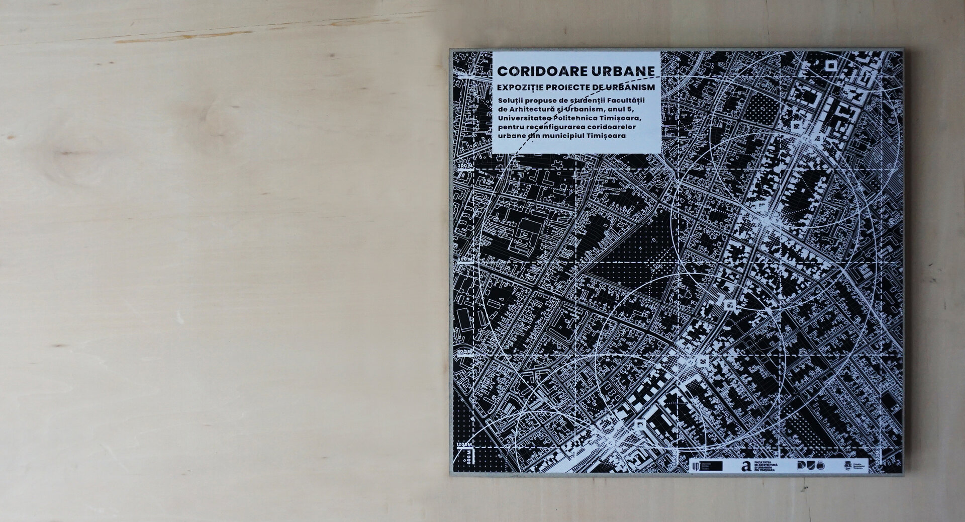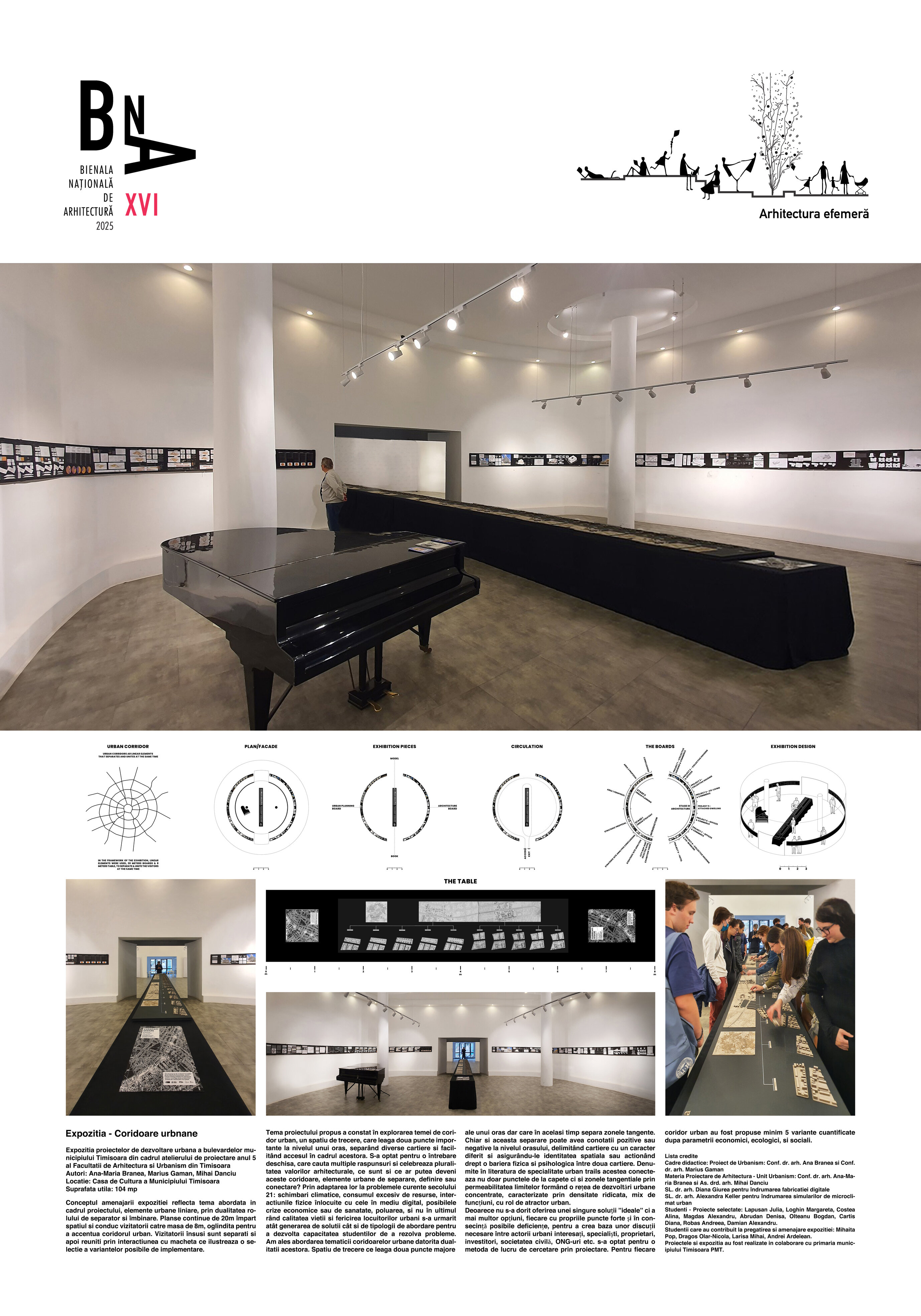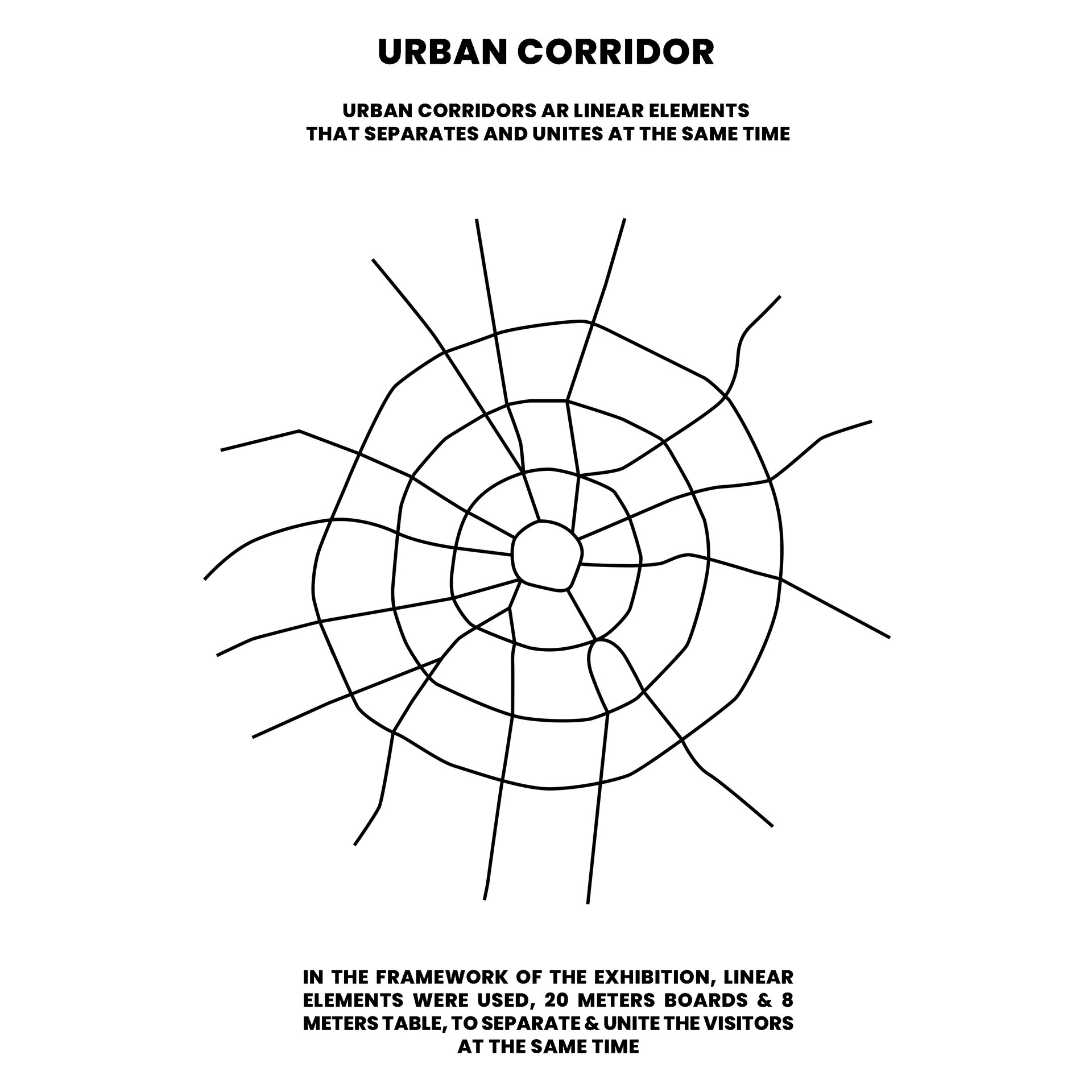 Conceptul amenajarii expozitiei reflecta tema abordata in cadrul proiectului, elemente urbane liniare, prin dualitatea rolului de separator si îmbinare. Planse continue de 20m împart spatiul si conduc vizitatorii catre masa de 8m, oglindita pentru a accentua coridorul urban. Vizitatorii însusi sunt separati si apoi reuniti prin interactiunea cu macheta ce ilustreaza o selectie a variantelor posibile de implementare.