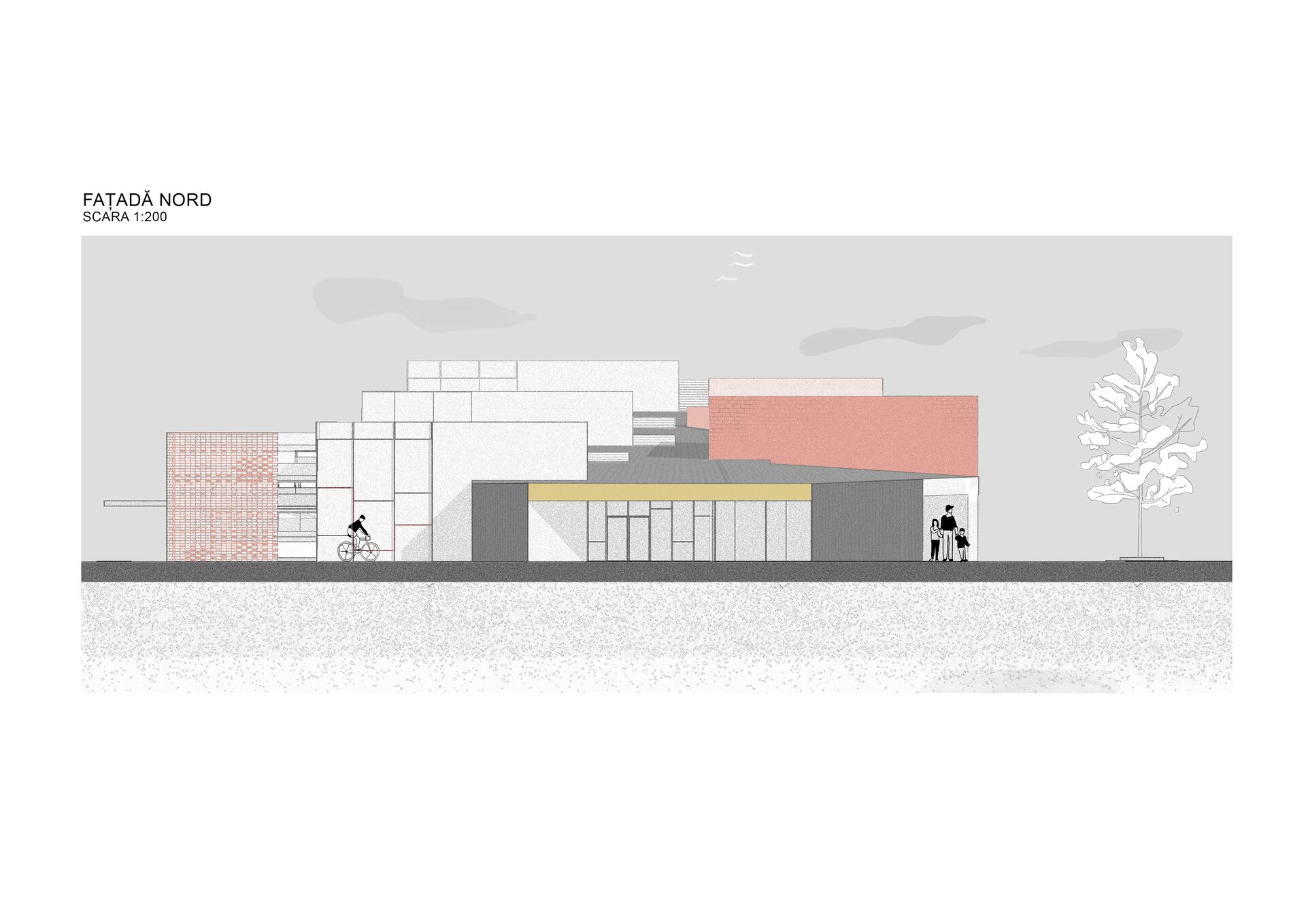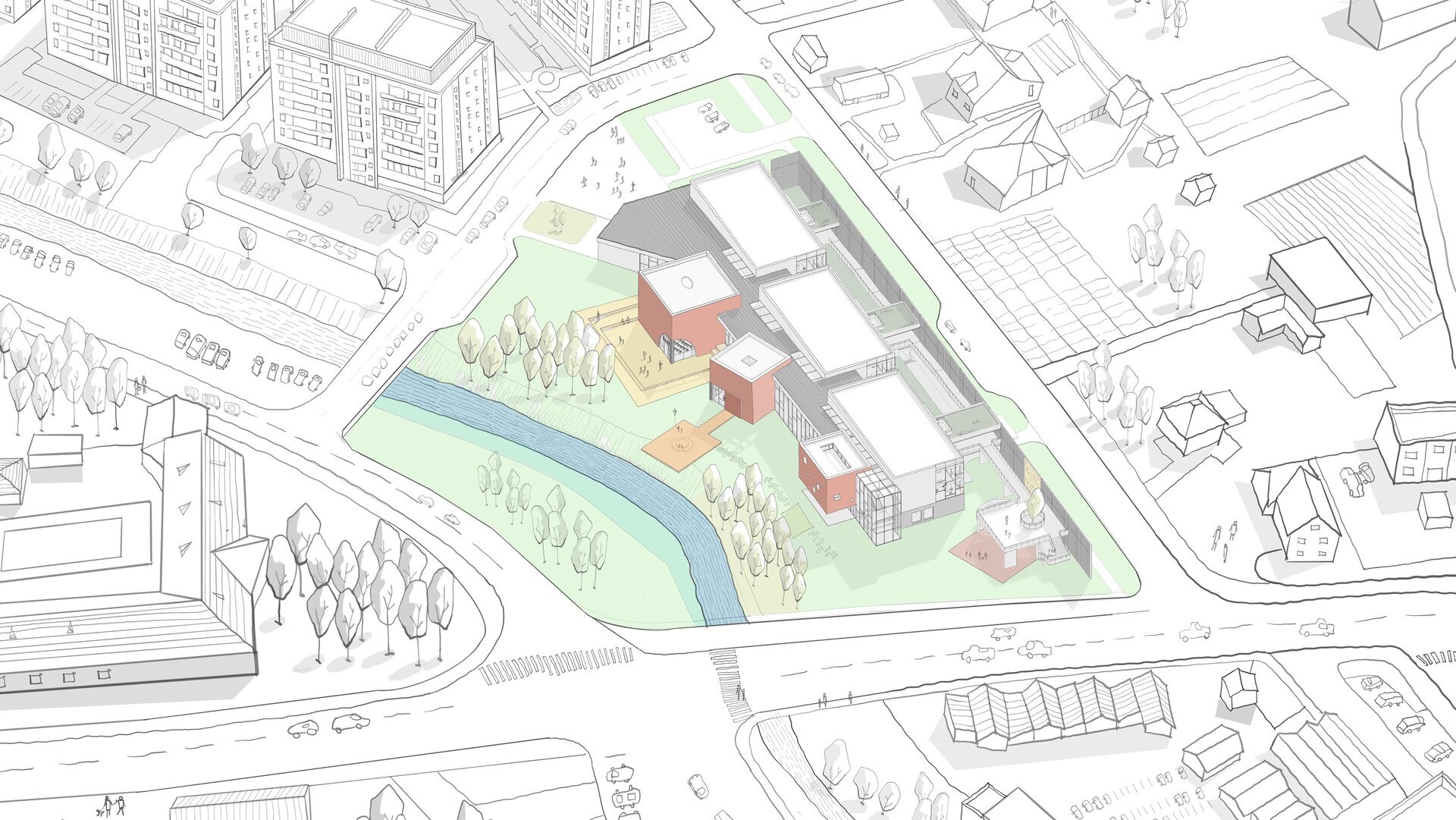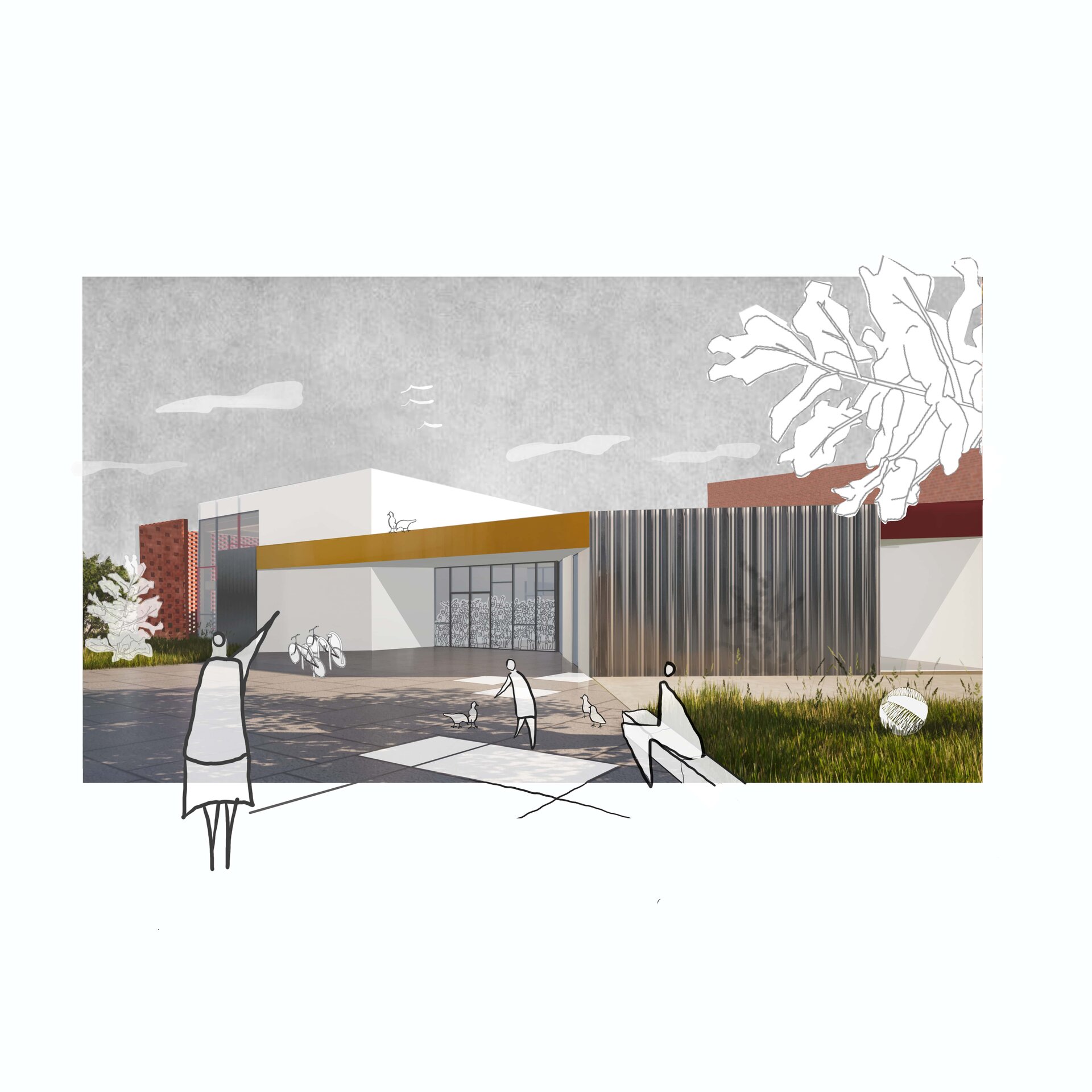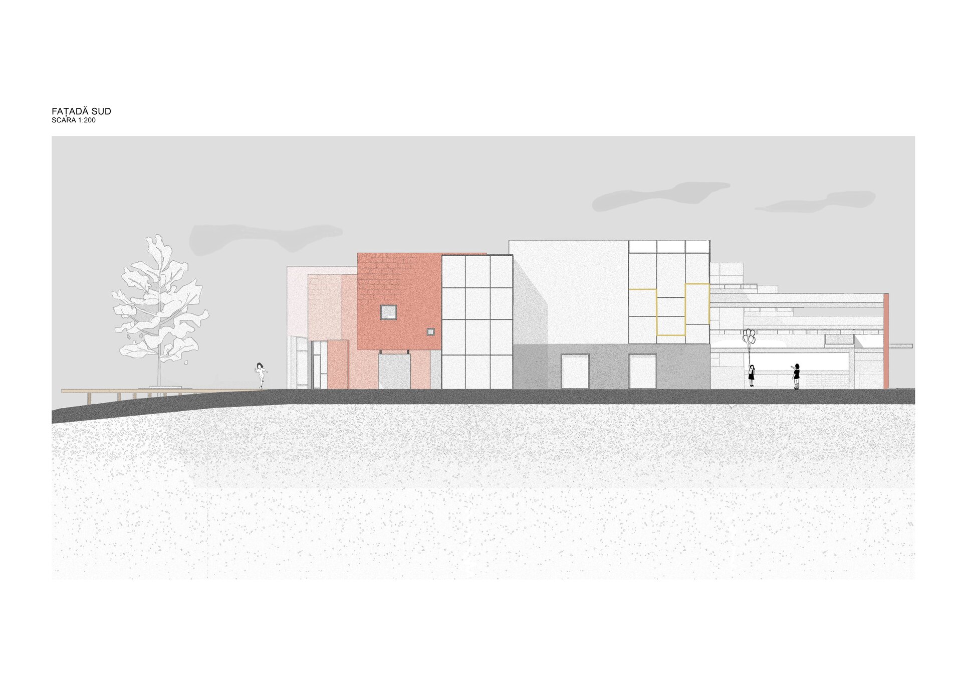 Trei volume prismatice intersectează corpul principal al grădiniței. Fiecare dintre ele adăpostește câte un alt tip de spațiu: