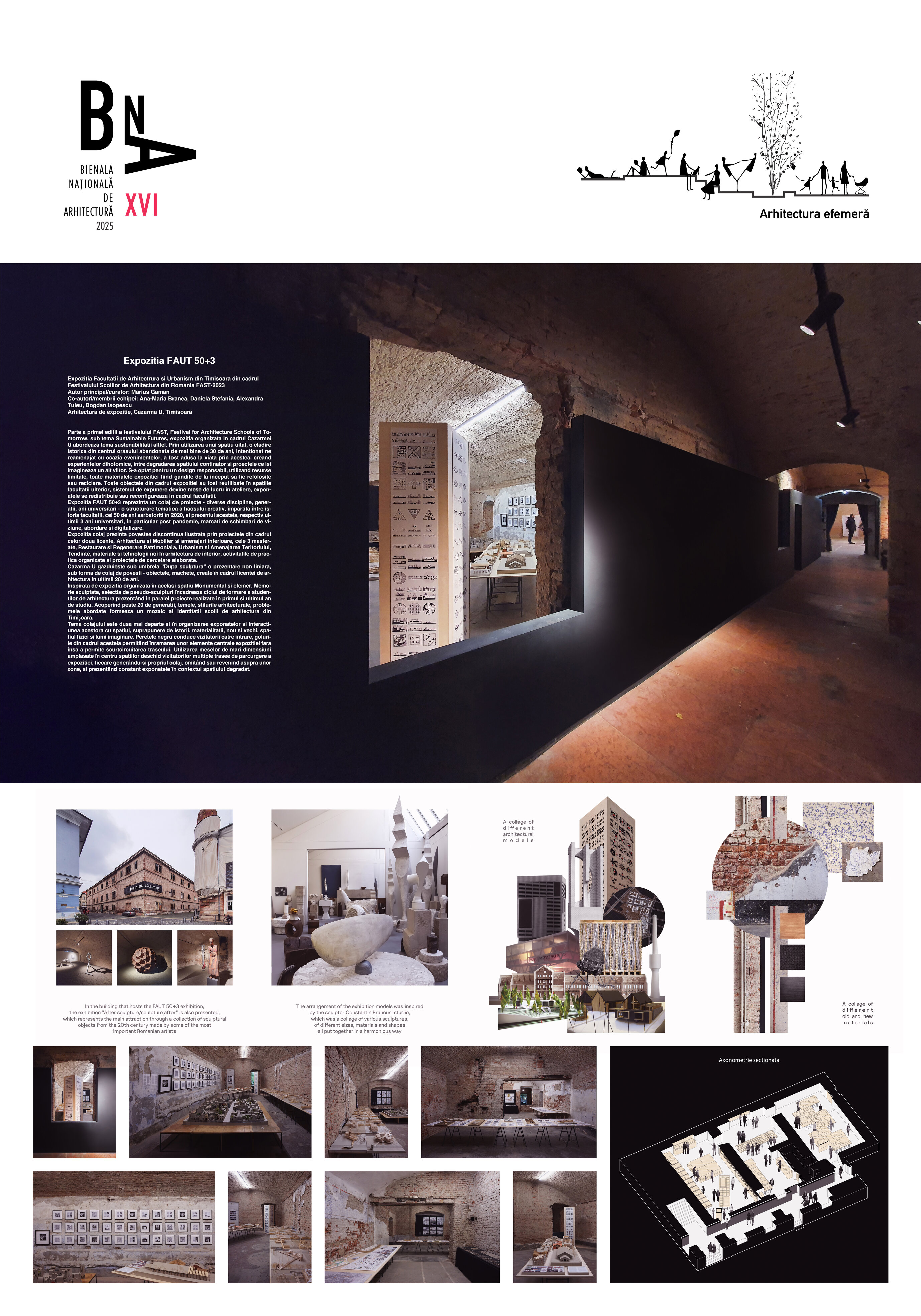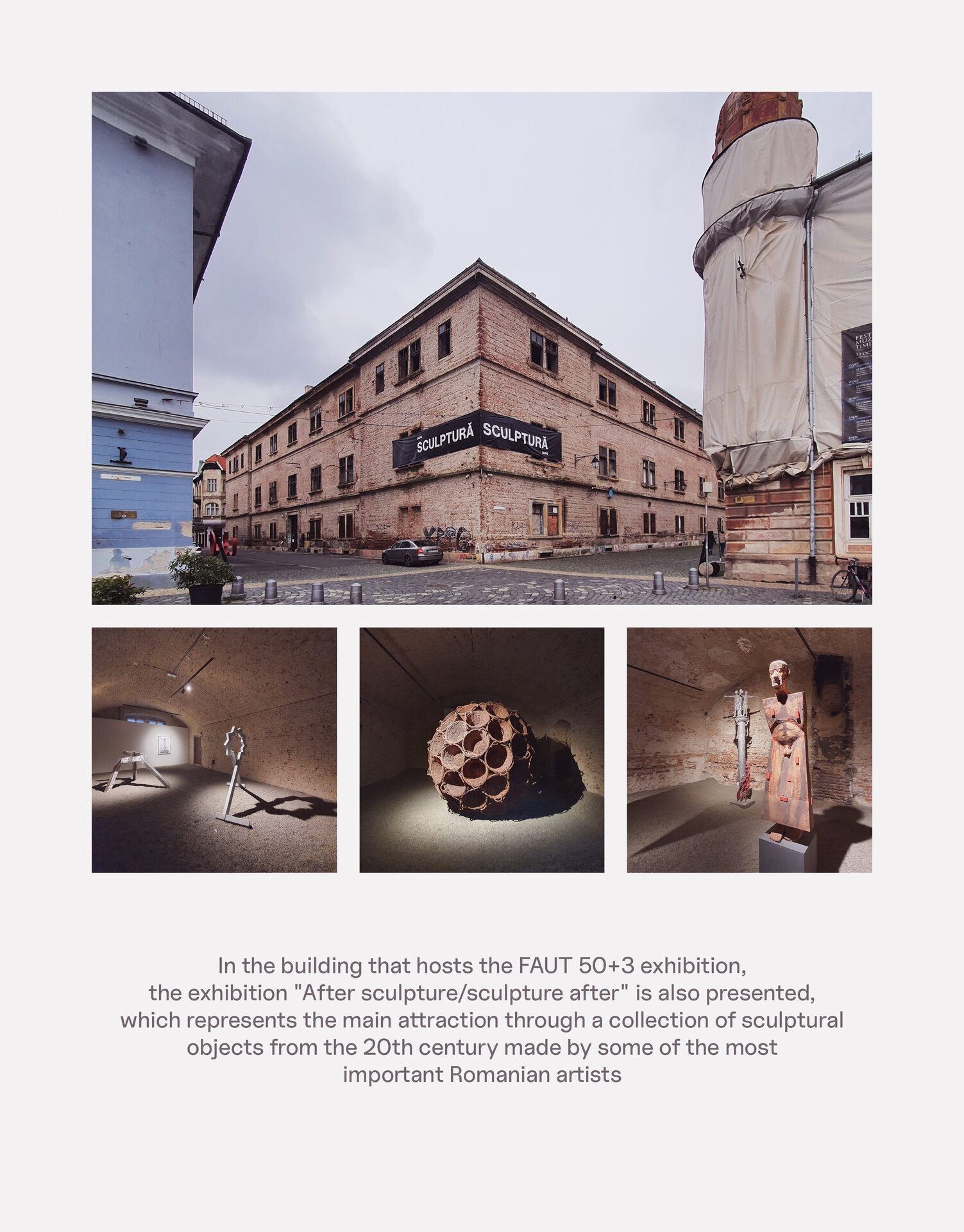 Expozitia FAUT 50+3 reprezinta un colaj de proiecte - diverse discipline, generatii, ani universitari - o structurare tematica a haosului creativ, împartita între istoria facultatii, cei 50 de ani sarbatoriti în 2020, si prezentul acesteia, respectiv ultimii 3 ani universitari, în particular post pandemie, marcati de schimbari de viziune, abordare si digitalizare.