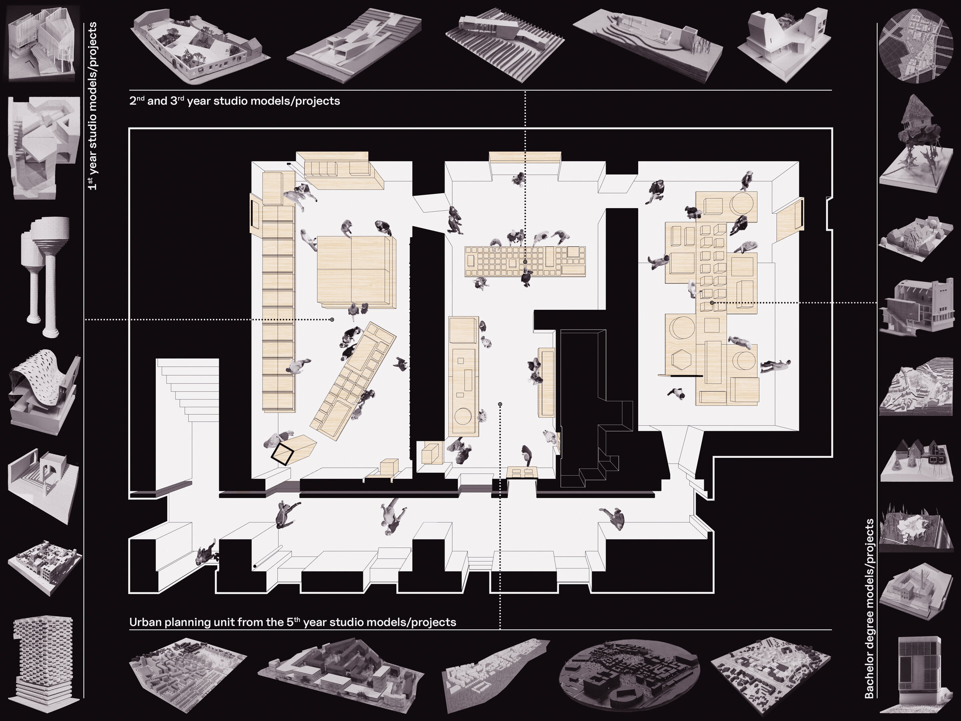 Expozitia colaj prezinta povestea discontinua ilustrata prin proiectele din cadrul celor doua licente, Arhitectura si Mobilier si amenajari interioare, cele 3 masterate, Restaurare si Regenerare Patrimoniala, Urbanism si Amenajarea Teritoriului, Tendinte, materiale si tehnologii noi în arhitectura de interior, activitatile de practica organizate si proiectele de cercetare elaborate.