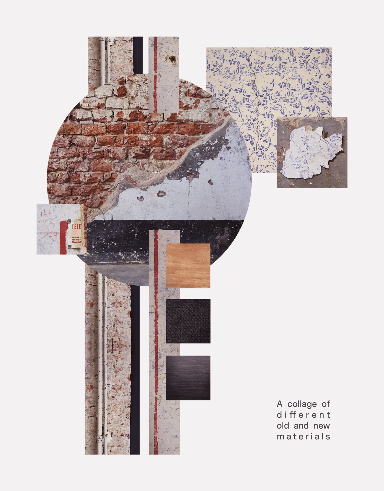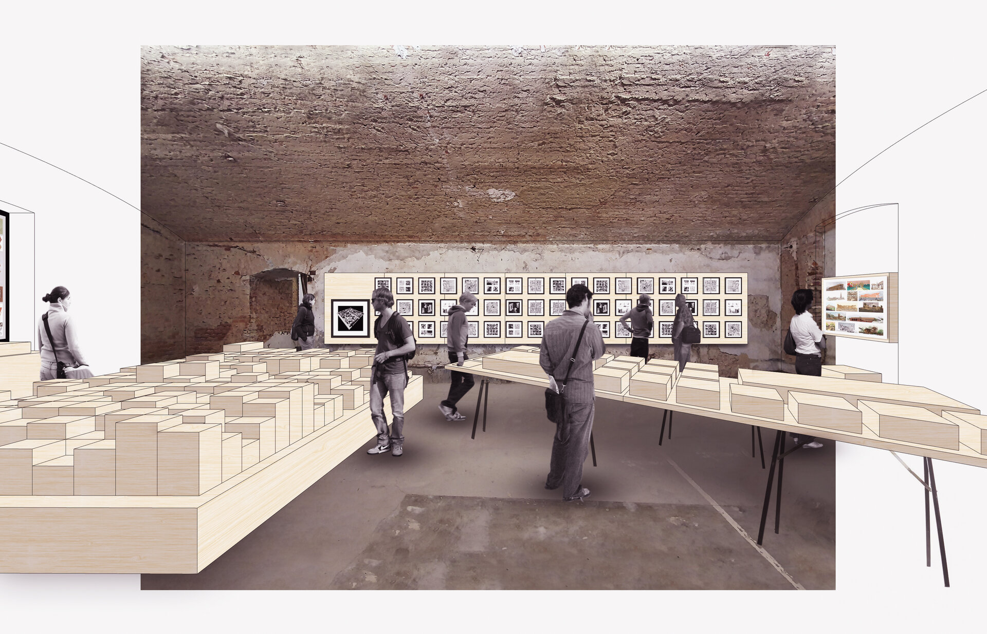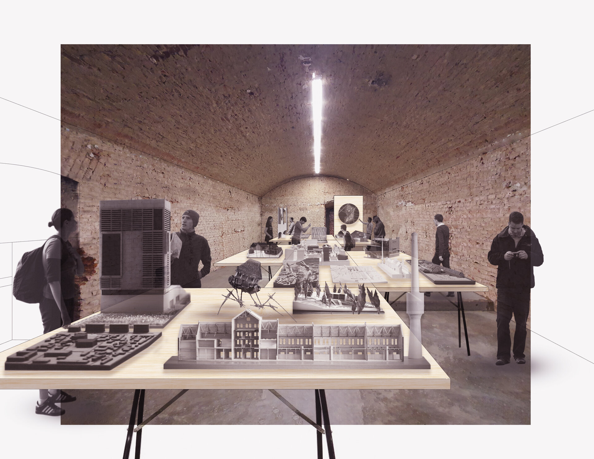 Tema colajului este dusa mai departe si în organizarea exponatelor si interactiunea acestora cu spatiul, suprapunere de istorii, materialitatii, nou si vechi, spatiul fizici si lumi imaginare. Peretele negru conduce vizitatorii catre intrare, golurile din cadrul acesteia permitând înramarea unor elemente centrale expozitiei fara însa a permite scurtcircuitarea traseului. Utilizarea meselor de mari dimensiuni amplasate în centru spatiilor deschid vizitatorilor multiple trasee de parcurgere a expozitiei, fiecare generându-si propriul colaj, omitând sau revenind asupra unor zone, si prezentând constant exponatele în contextul spatiului degradat.