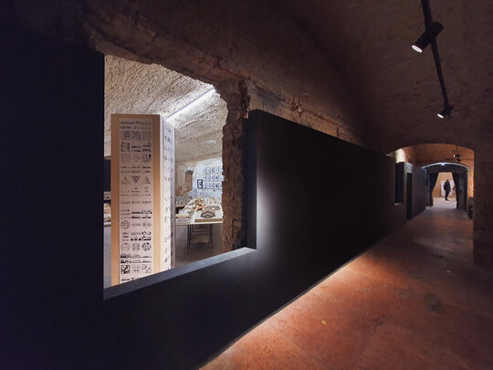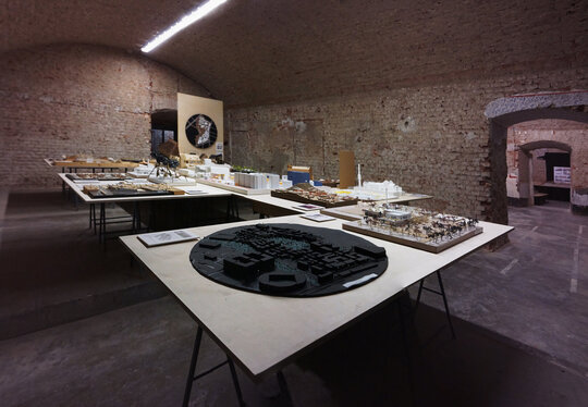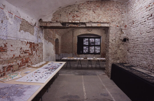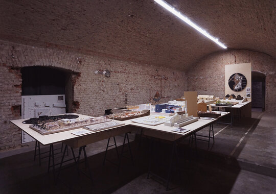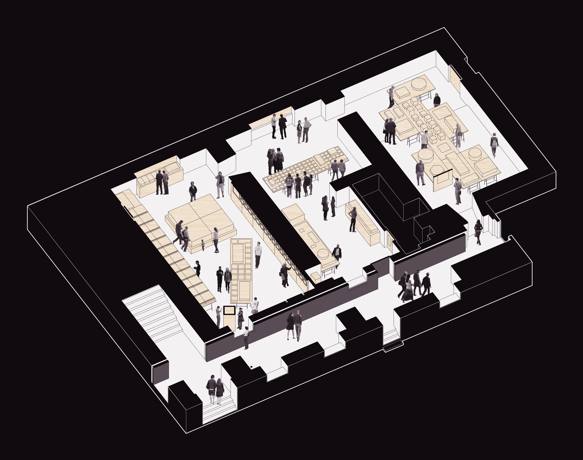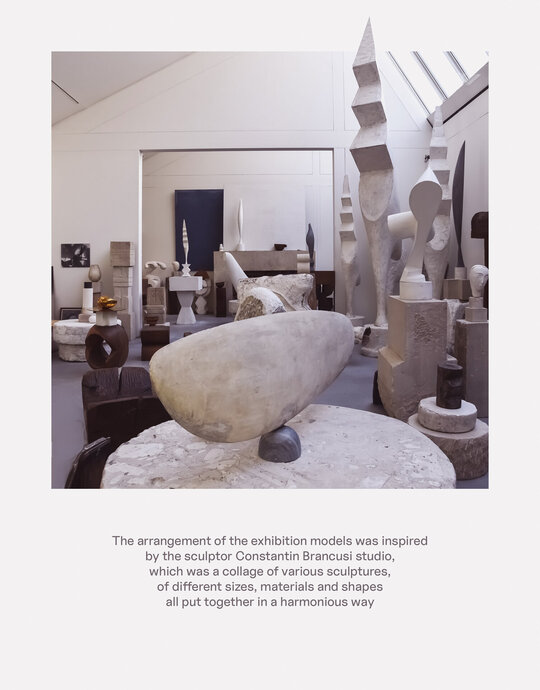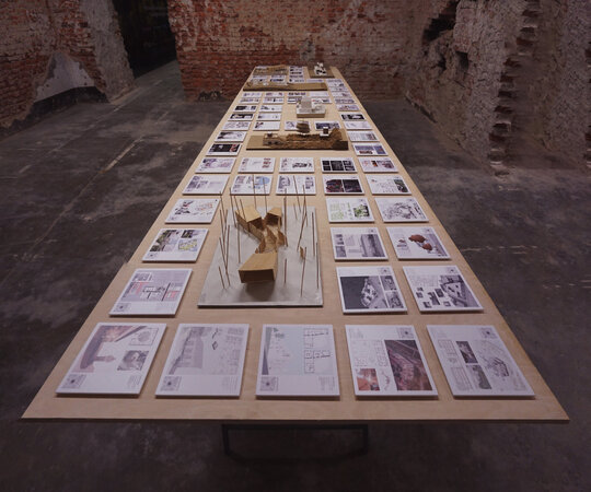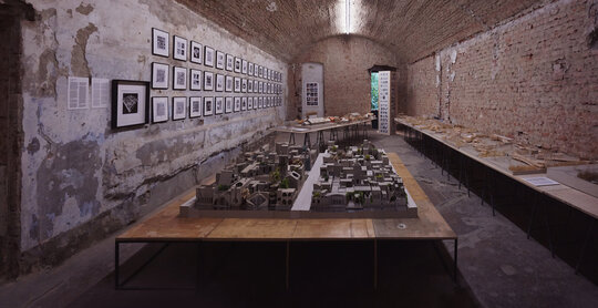 Tema colajului este dusa mai departe si în organizarea exponatelor si interactiunea acestora cu spatiul, suprapunere de istorii, materialitatii, nou si vechi, spatiul fizici si lumi imaginare. Peretele negru conduce vizitatorii catre intrare, golurile din cadrul acesteia permitând înramarea unor elemente centrale expozitiei fara însa a permite scurtcircuitarea traseului. Utilizarea meselor de mari dimensiuni amplasate în centru spatiilor deschid vizitatorilor multiple trasee de parcurgere a expozitiei, fiecare generându-si propriul colaj, omitând sau revenind asupra unor zone, si prezentând constant exponatele în contextul spatiului degradat.