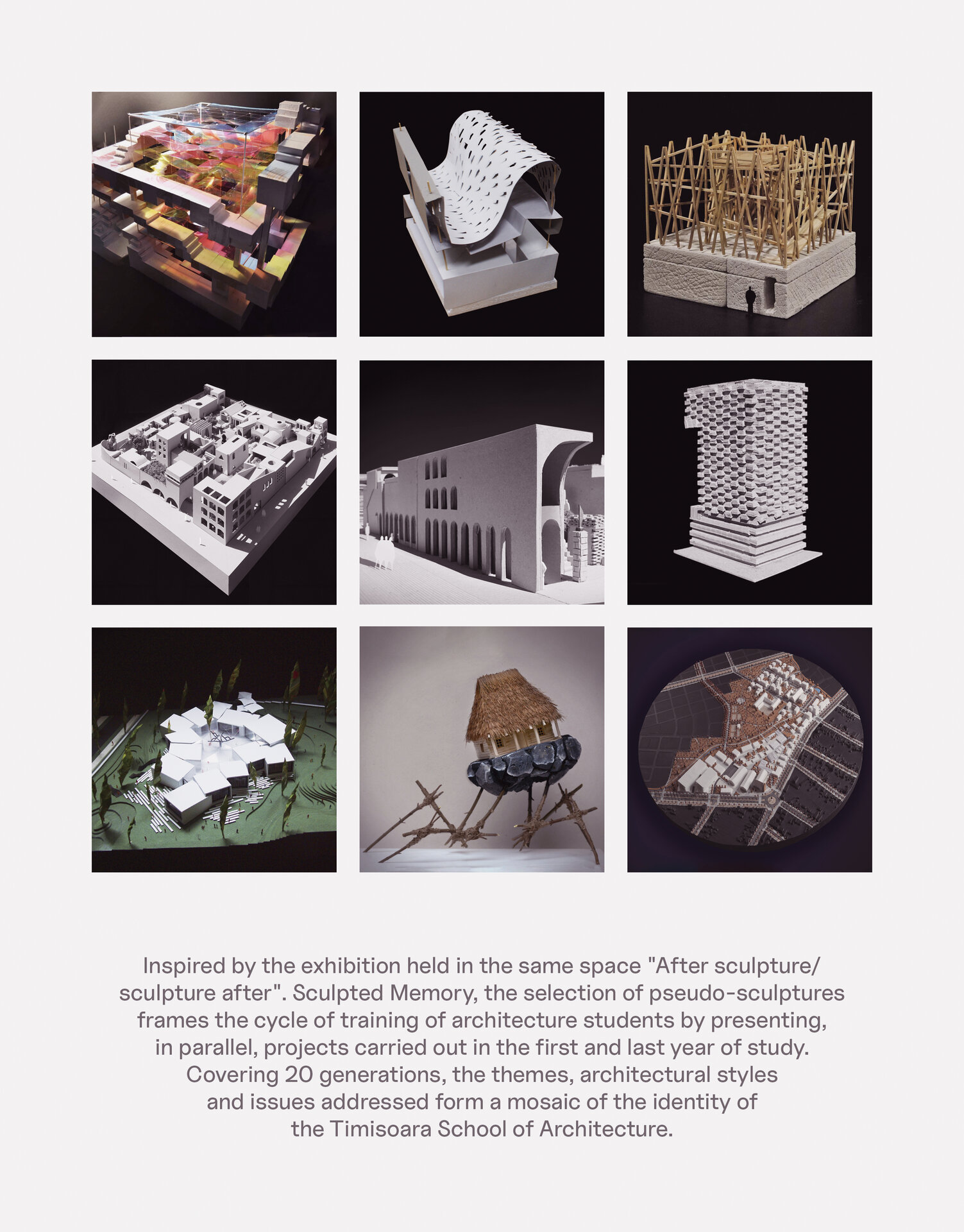 Inspirata de expozitia organizata în acelasi spatiu Monumental si efemer. Memorie sculptata, selectia de pseudo-sculpturi încadreaza ciclul de formare a studentilor de arhitectura prezentând în paralel proiecte realizate în primul si ultimul an de studiu. Acoperind peste 20 de generatii, temele, stilurile arhitecturale, problemele abordate formeaza un mozaic al identitatii scolii de arhitectura din Timișoara.