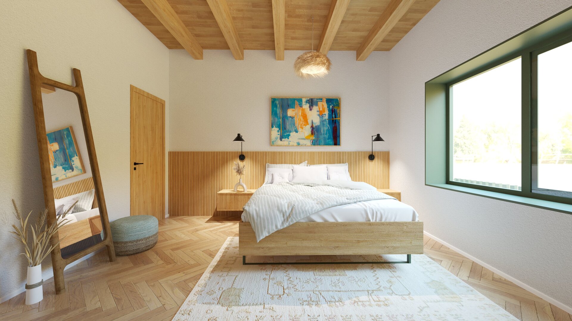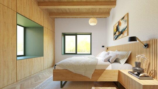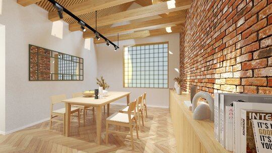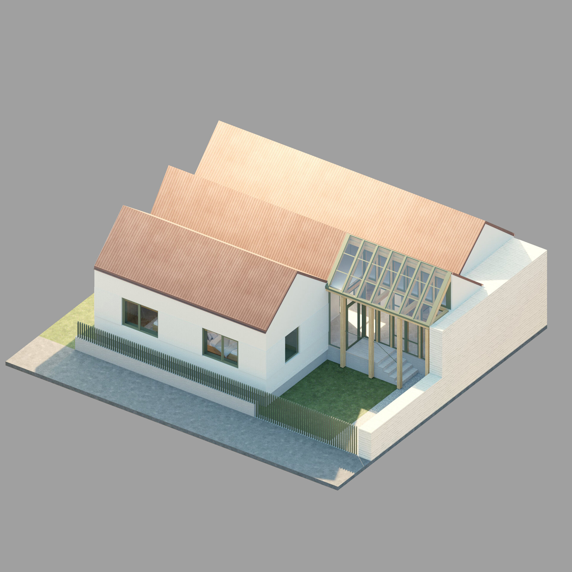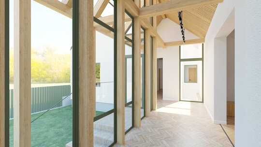 Noua zonă de intrare, cât și șarpanta de deasupra ei vor fi vitrate, pentru a asigura pătrunderea la interior a luminii naturale, în profunzimea casei. De asemenea, din cauza limitelor terenului, zona de zi va beneficia și de lumină zenitală, venită prin ferestrele de mansardă amplasate în șarpanta a cărui intrados este vizibil din interiorul casei.