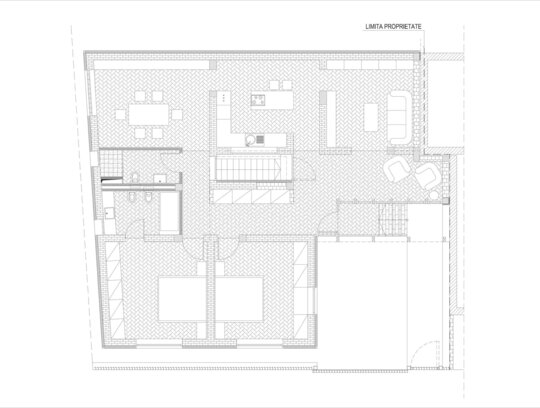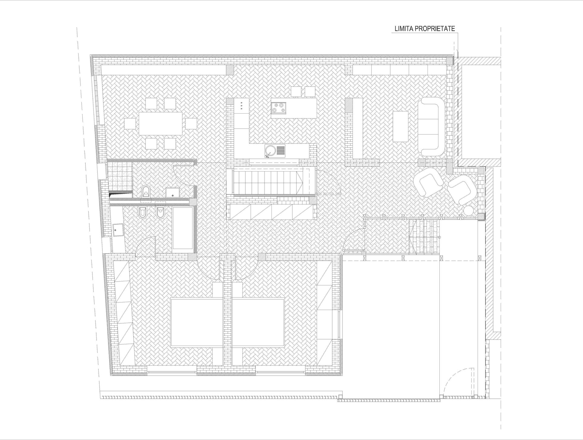 Zona de zi, zona de noapte și zona de servicii – acces, depozitare, băi (ce le separă și articulează pe primele două), se așază pe plan ca 3 benzi funcționale paralele dar interconectate. În directă legătură cu acestea, un nou acoperiș ce corespunde planimetric celor 3 benzi funcționale, va marca la exterior intervenția contemporană.