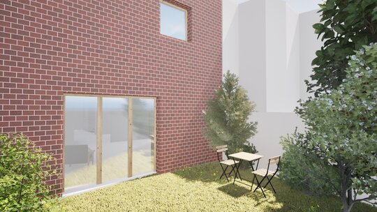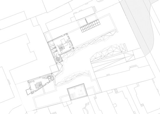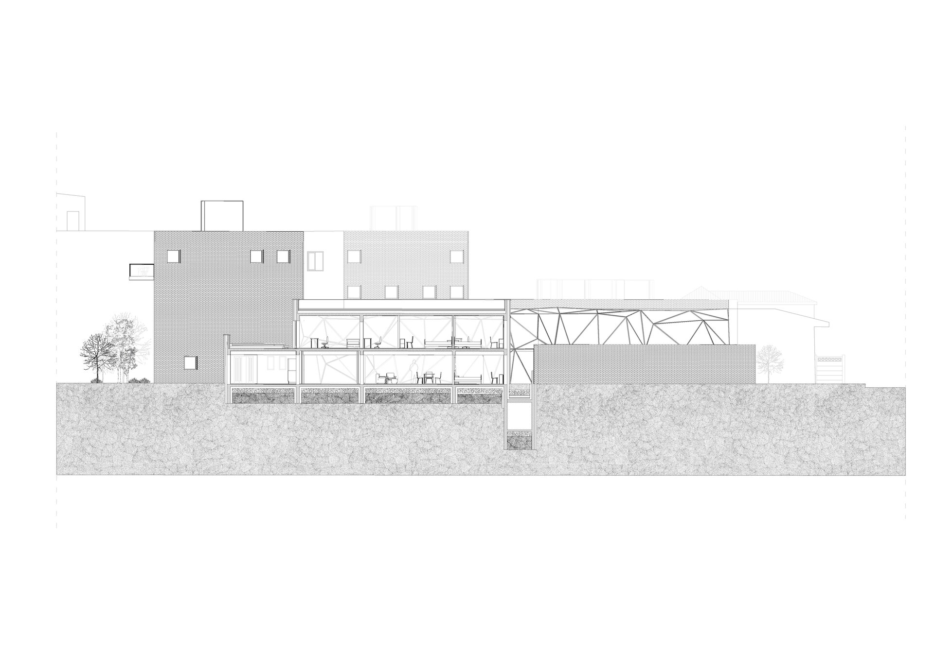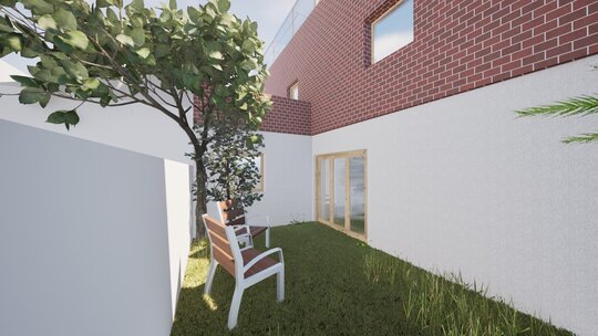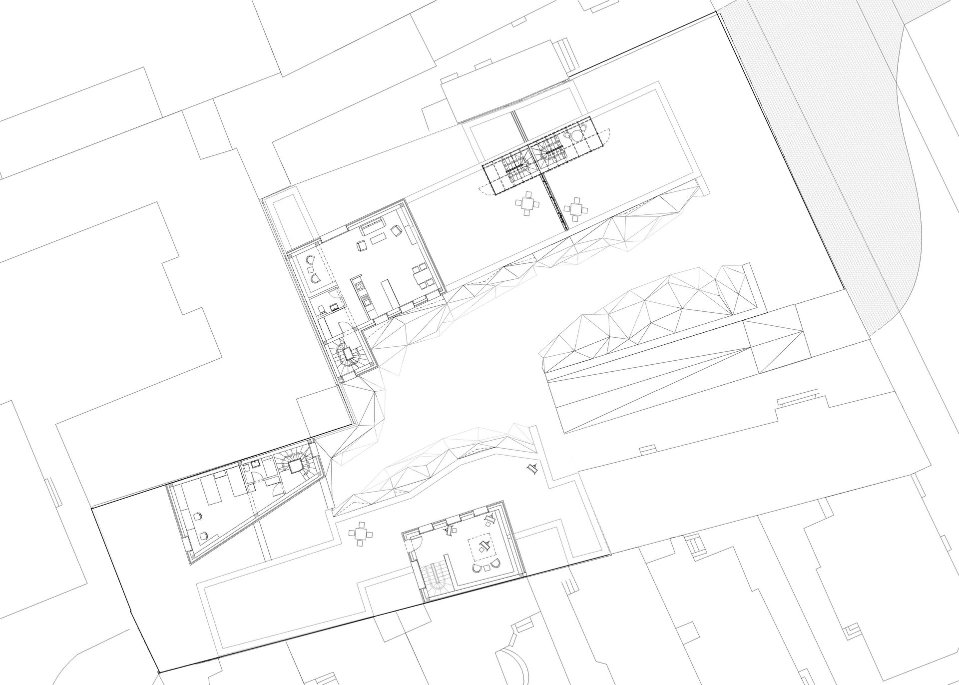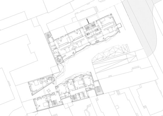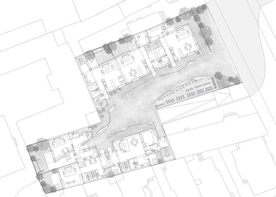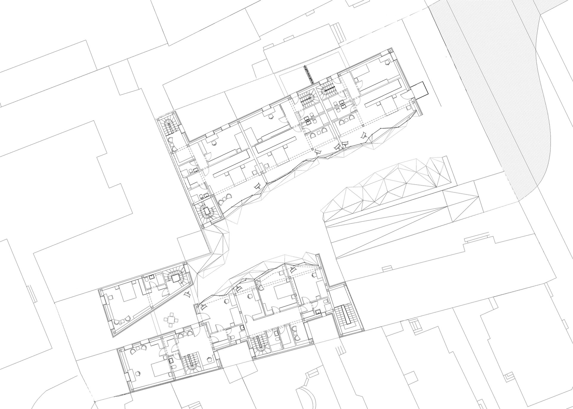 Organizarea spațiului interior urmează o logică clară și funcțională. La parter se regăsește zona de zi, în relație directă cu curtea comunitară, care funcționează ca un spațiu de întâlnire și socializare. La etaj sunt dispuse zonele de noapte, într-un registru mai intim, favorizând retragerea și liniștea. Traseele de acces sunt concepute ca o succesiune de praguri, trecerea de la strada publică la intimitatea locuinței fiind mediată prin spații intermediare ce susțin ideea de comunitate și coabitare.