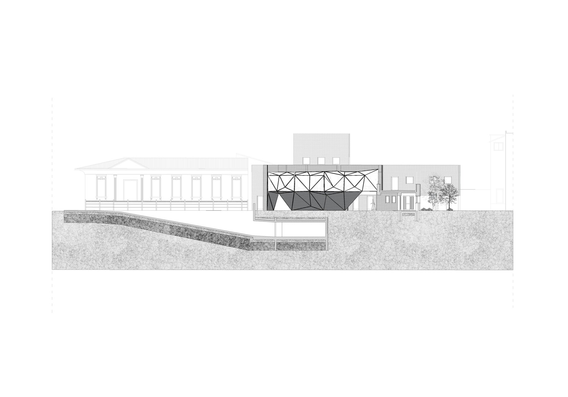 Volumetria clădirii, prin modul său de desfășurare și prin dinamica pe care o propune, evocă o mișcare de „întoarcere” a trăirilor umane către spiritualitate. Dincolo de funcționalitatea sa imediată, arhitectura trimite către o energie transcendentă, către o preocupare constantă pentru dialogul dintre uman și divin. Vegetația care înconjoară ansamblul contribuie la această continuitate, făcând legătura dintre biserică și clădire. Arborii, considerați în multe tradiții simboluri cosmice, care unesc cerul cu pământul, devin parte integrantă a compoziției arhitecturale. Prin această inserție, viața cotidiană a localnicilor se contopește cu vibrația înaltă a sufletului lor, într-un flux continuu de energie care curge între profan și sacru.