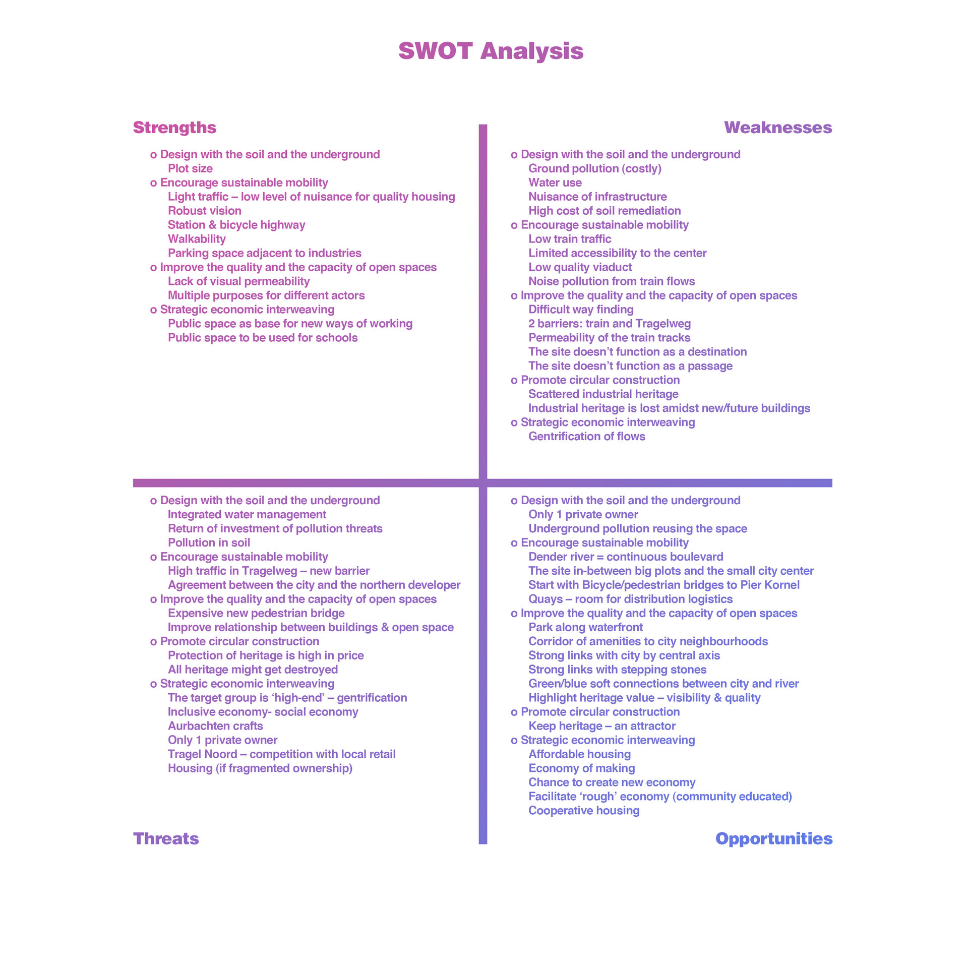 Propunerea se bazează pe o serie de benzi funcționale ce întregesc cartierul tăiat de o artera principala și îl unesc de zonele învecinate. Cladirile industriale istorice păstrate sunt puse în valoare prin spații de coagulare amenajate în proximitatea lor și prin găzduirea de functiuni publice ce intregesc comunitatea. Un mediu urban dens, cu un amestec de locuințe, magazine, servicii comunitare, parcuri, locuri de întâlnire, birouri și alte activități neperturbatoare animă zona pe tot parcursul zilei. Prin găzduirea unei varietăți de întreprinderi și servicii, zona nu depinde unilateral de o singură industrie și nici nu se adresează unei singure categorii demografice, reducându-și astfel vulnerabilitatea la fluctuațiile pieței.