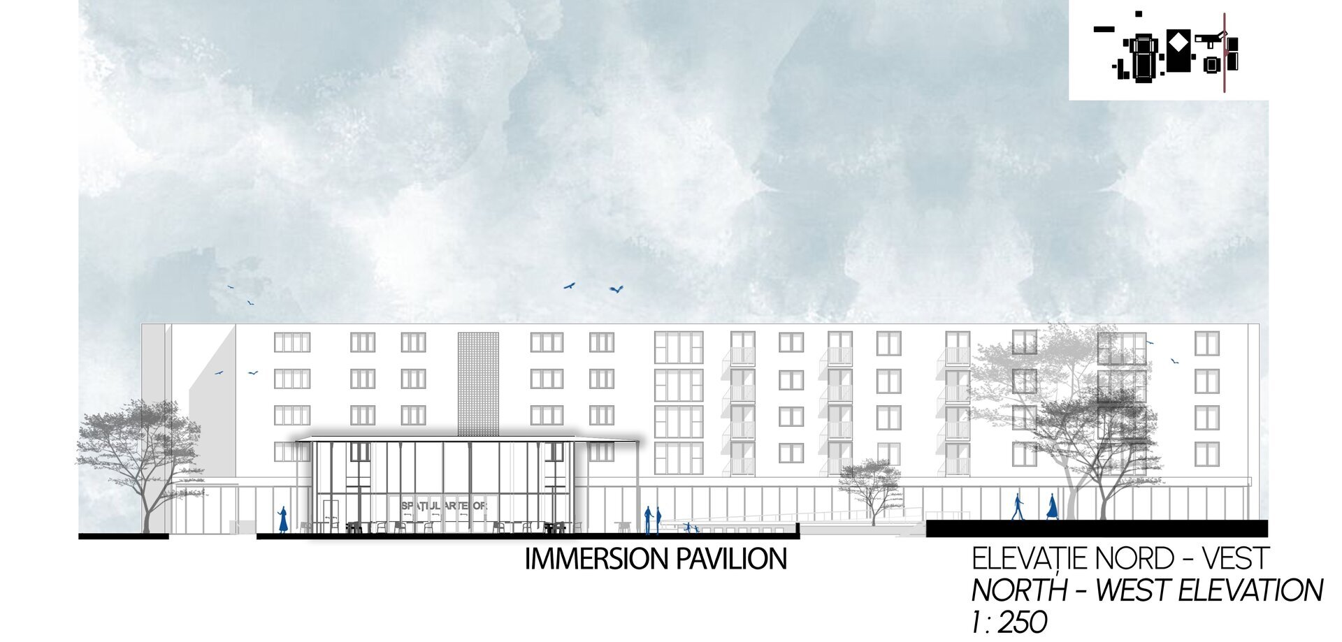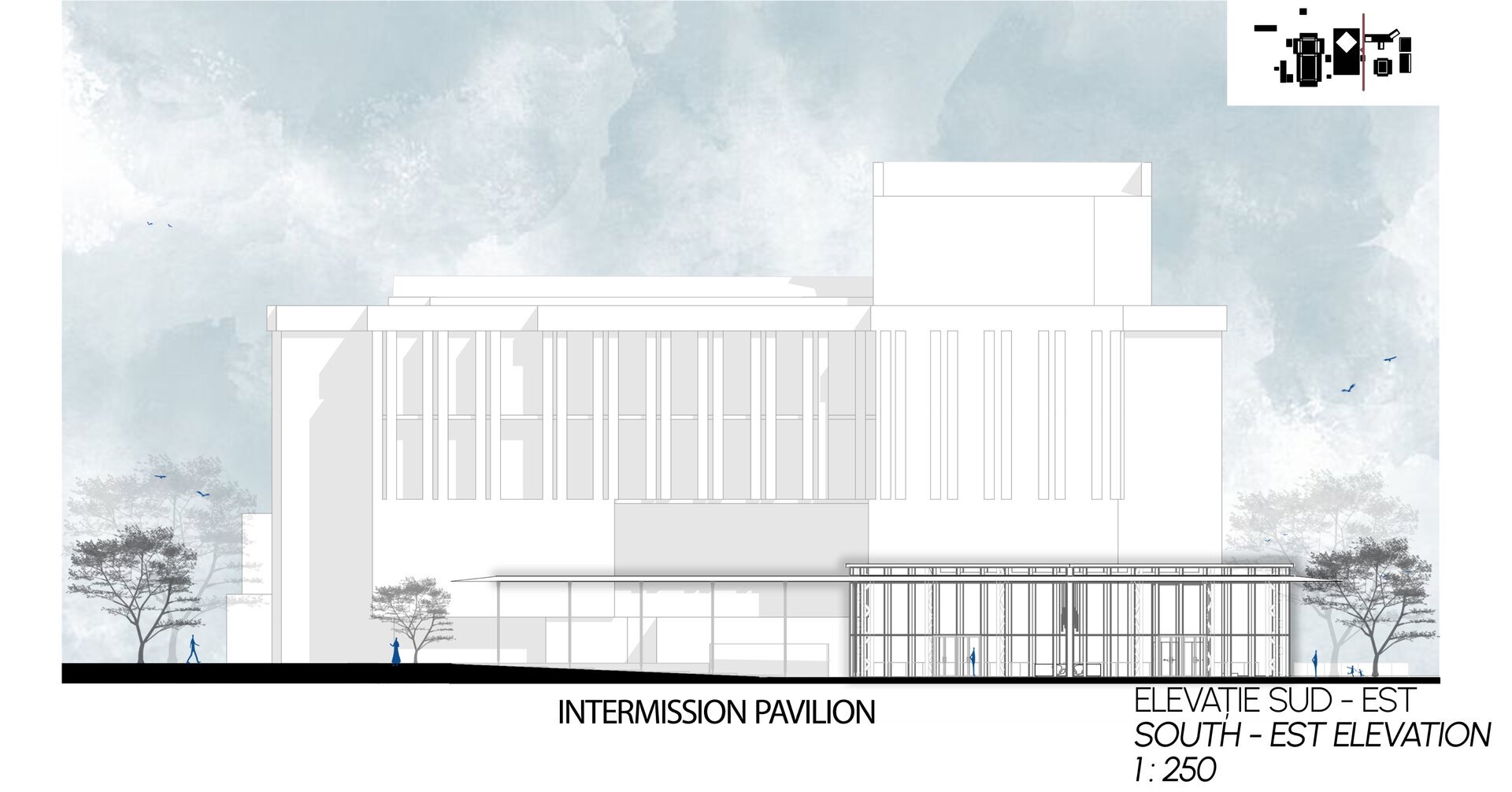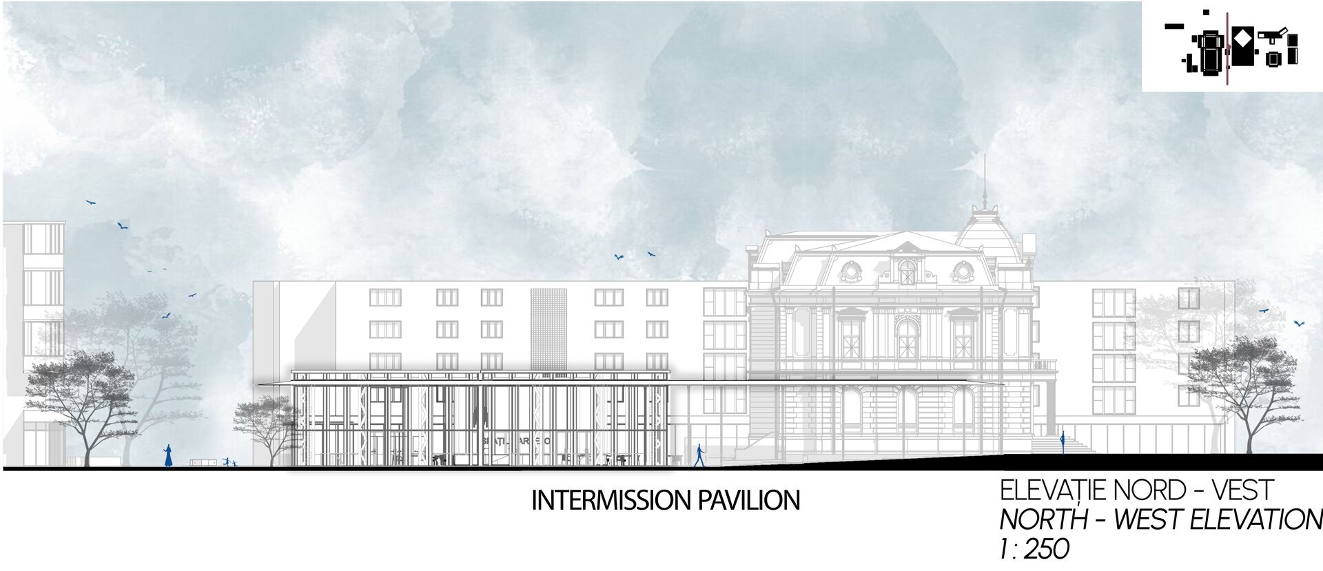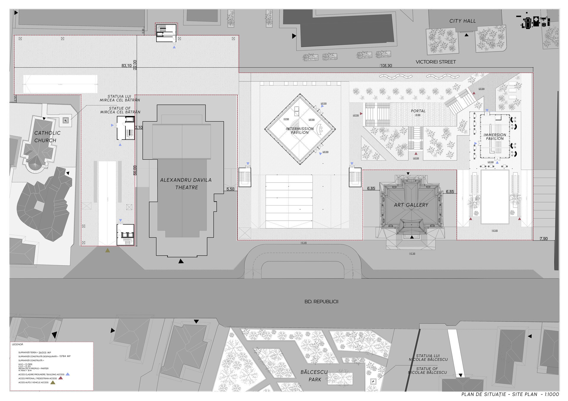 Proiectul se desfășoară în zona adiacentă Teatrului „Al. Davila” și Galeriei de Artă din centrul Piteștiului, având ca obiectiv principal completarea și revitalizarea traseului pietonal. Amplasarea în vecinătatea clădirilor cu valoare arhitecturală și istorică subliniază rolul ansamblului urbanistic existent, păstrând caracterul monumental și integrându-se armonios în compoziția urbană a orașului. În această zonă, sistematizarea anilor 1960 a rămas incompletă, menținând un front principal al clădirilor către bulevardul Republicii. Proiectul propune o recalibrare a spațiului public, orientând fluxul pietonal către parcul din apropiere, având liceul ca fundal vizual al perspectivei urbane.