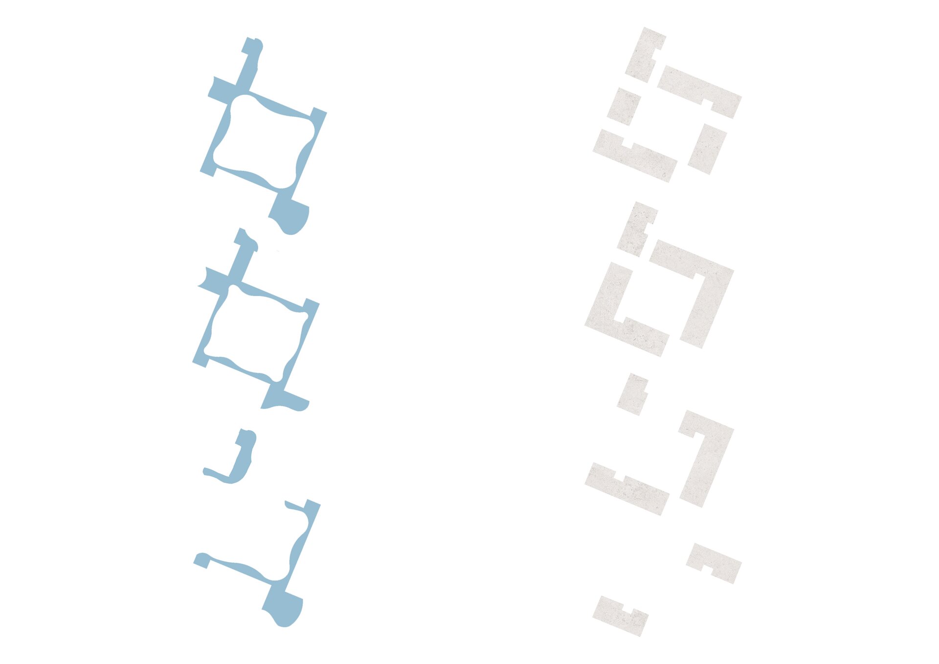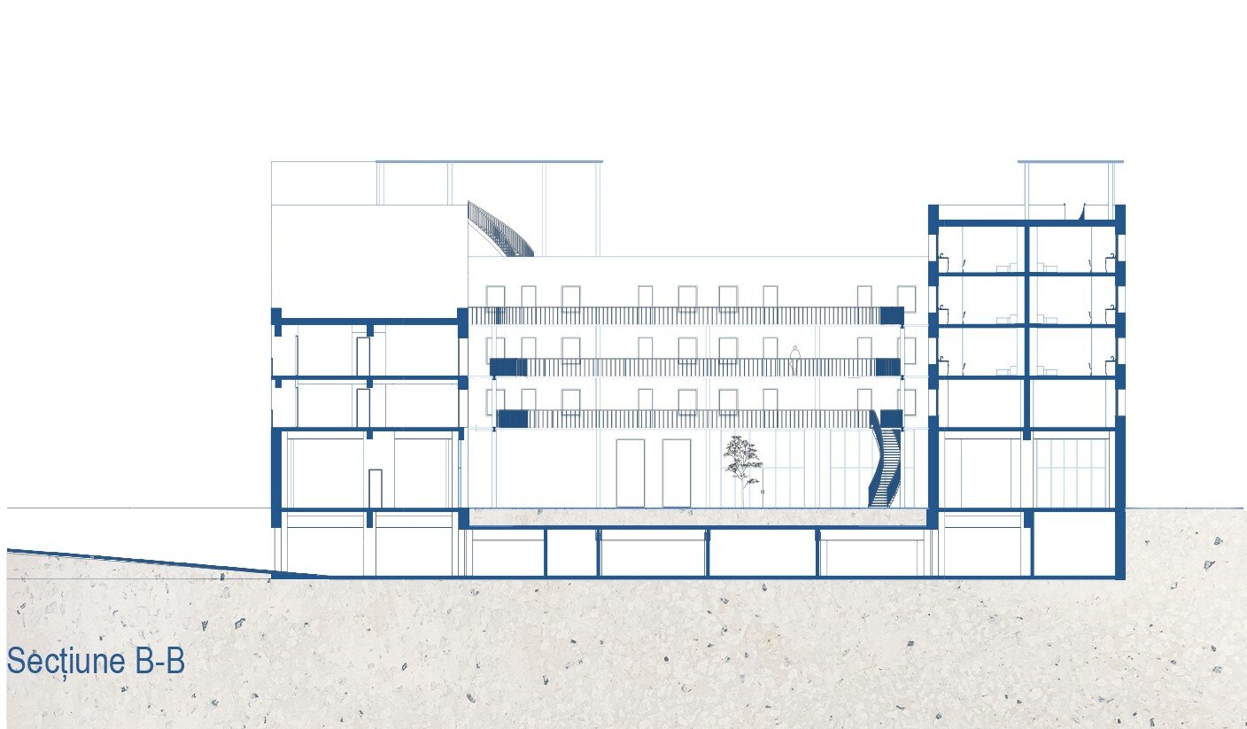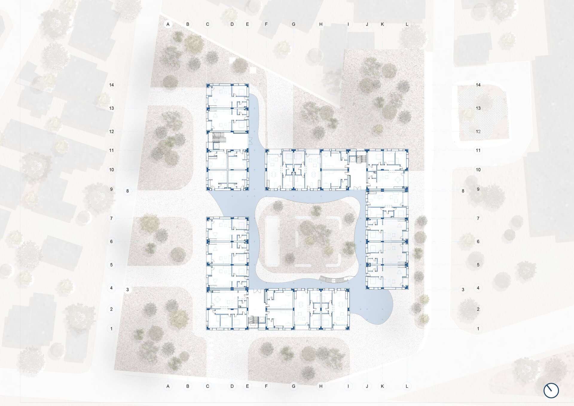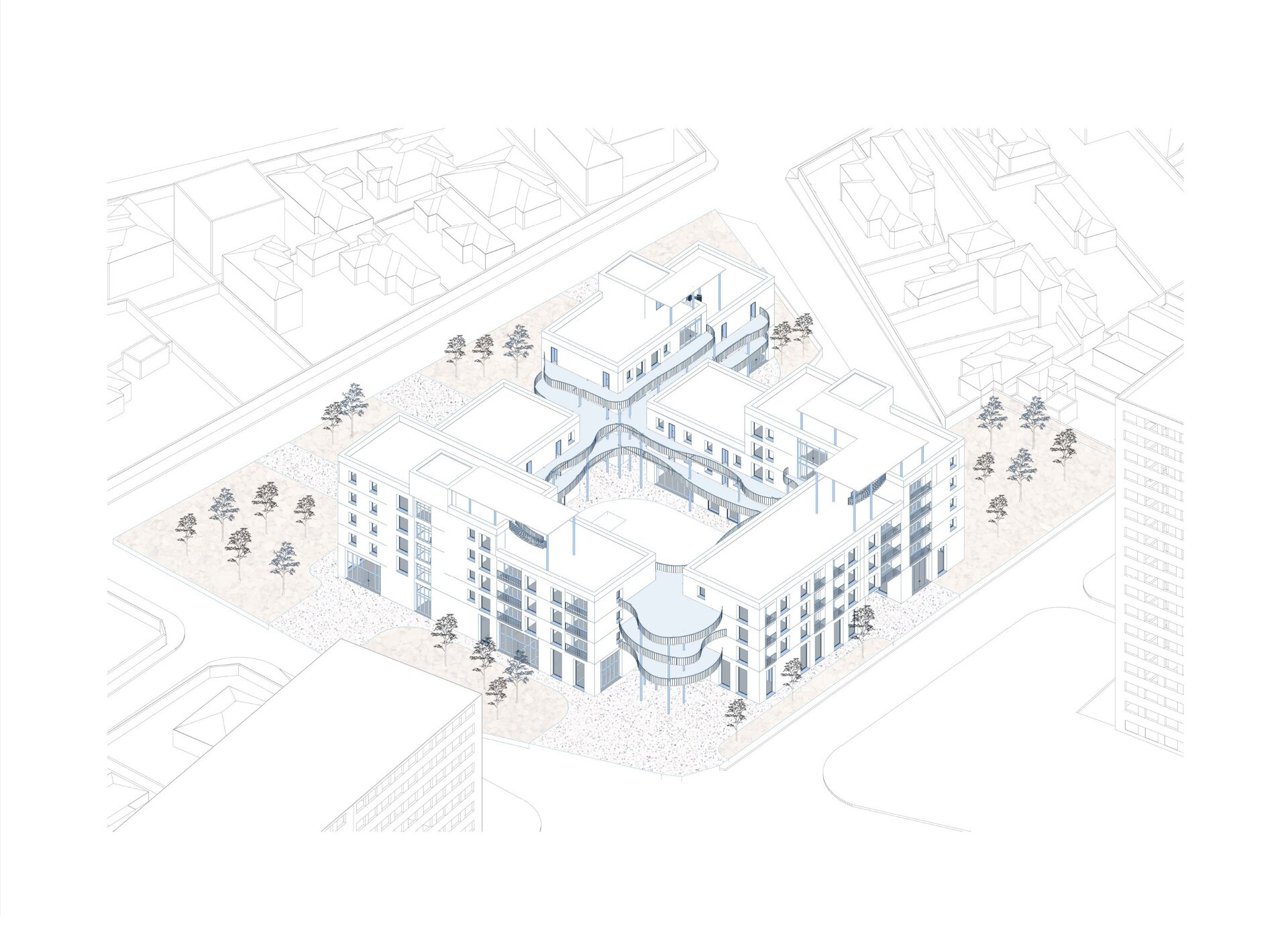Propunerea constă în trei corpuri individuale, dispuse in jurul unei curți. Acestea sunt legate între ele prin intermediul unei cursive. Am optat pentru o formă organică a cursivei pentru a genera spații de întâlnire, de repaus, ca să creăm posibilități pentru o multitudine de scenarii de utilizare. Aceasta reprezintă în acest fel o extindere a apartamentelor spre spațiul exterior. Cursivele sunt diferite de la un etaj la altul, sunt decalate, formându-se astfel un dialog între niveluri, acestea fiind mai mult decât un simplu spațiu de trecere.